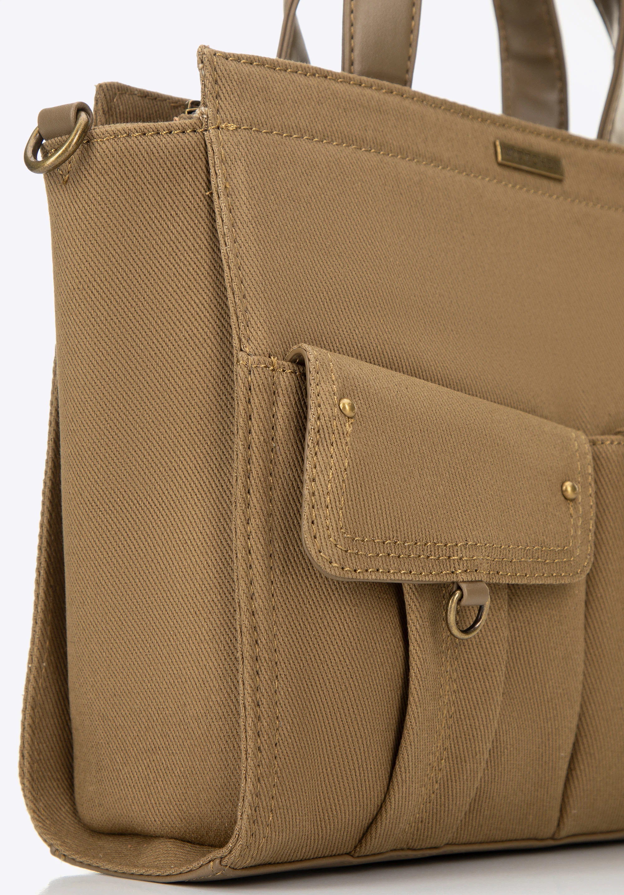 Vă prezentăm geanta tote , care combină designul clasic cu funcționalitatea modernă. Fabricat din bumbac , poliester și piele artificială , este durabil și rezistent la utilizarea zilnică. Două mânere din imitație de piele asigură transportul confortabil în mână, în timp ce cureaua reglabilă permite purtarea convenabilă pe umăr. Pe partea din față a genții de mână există două buzunare elegante cu clapă , cu închidere magnetică, perfecte pentru obiectele mici pe care doriți să le păstrați la îndemână.
