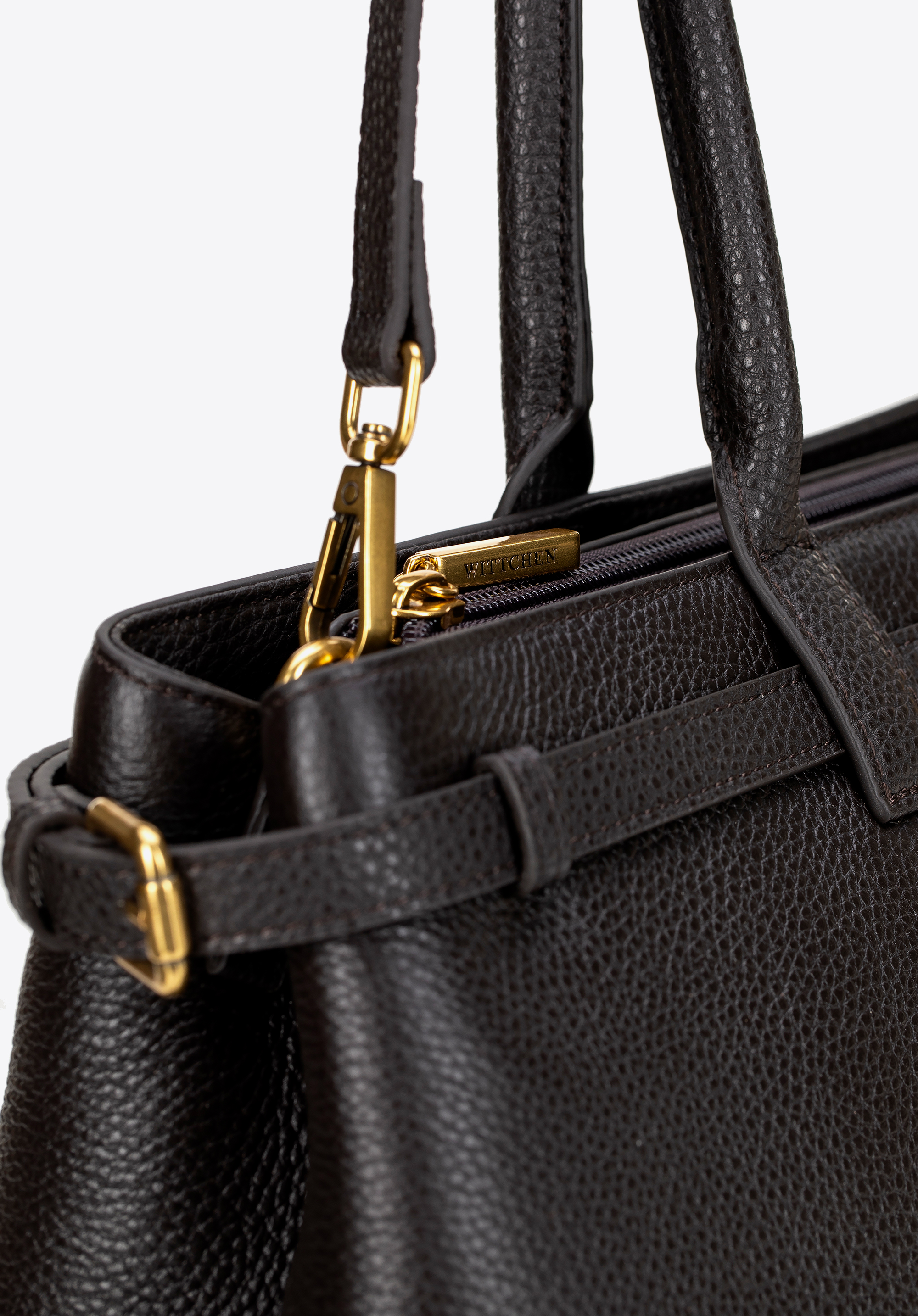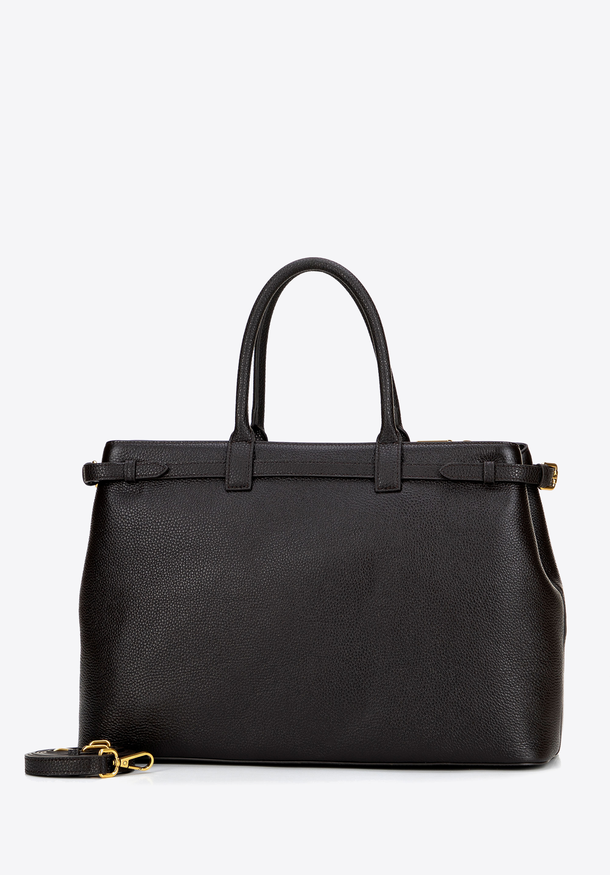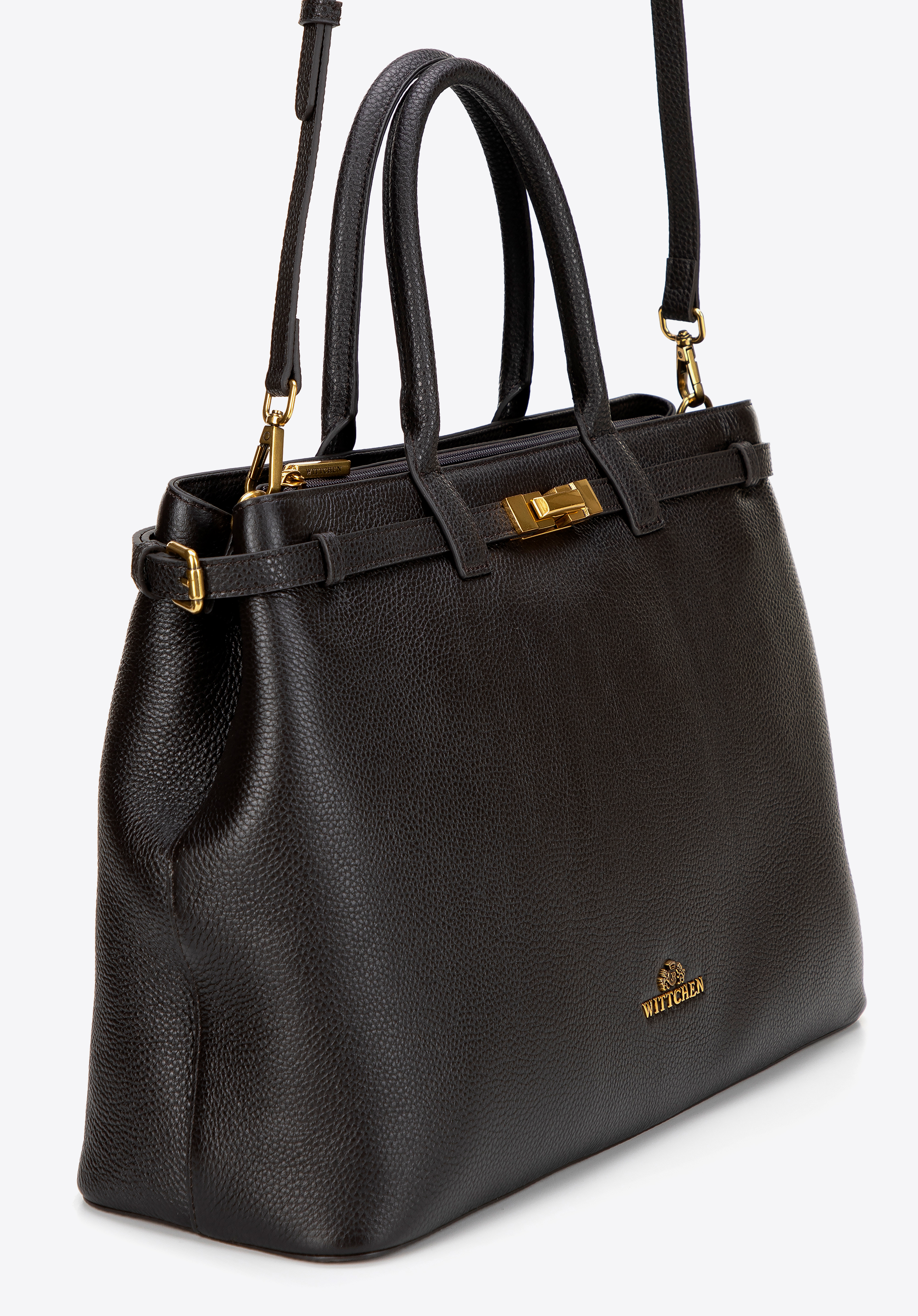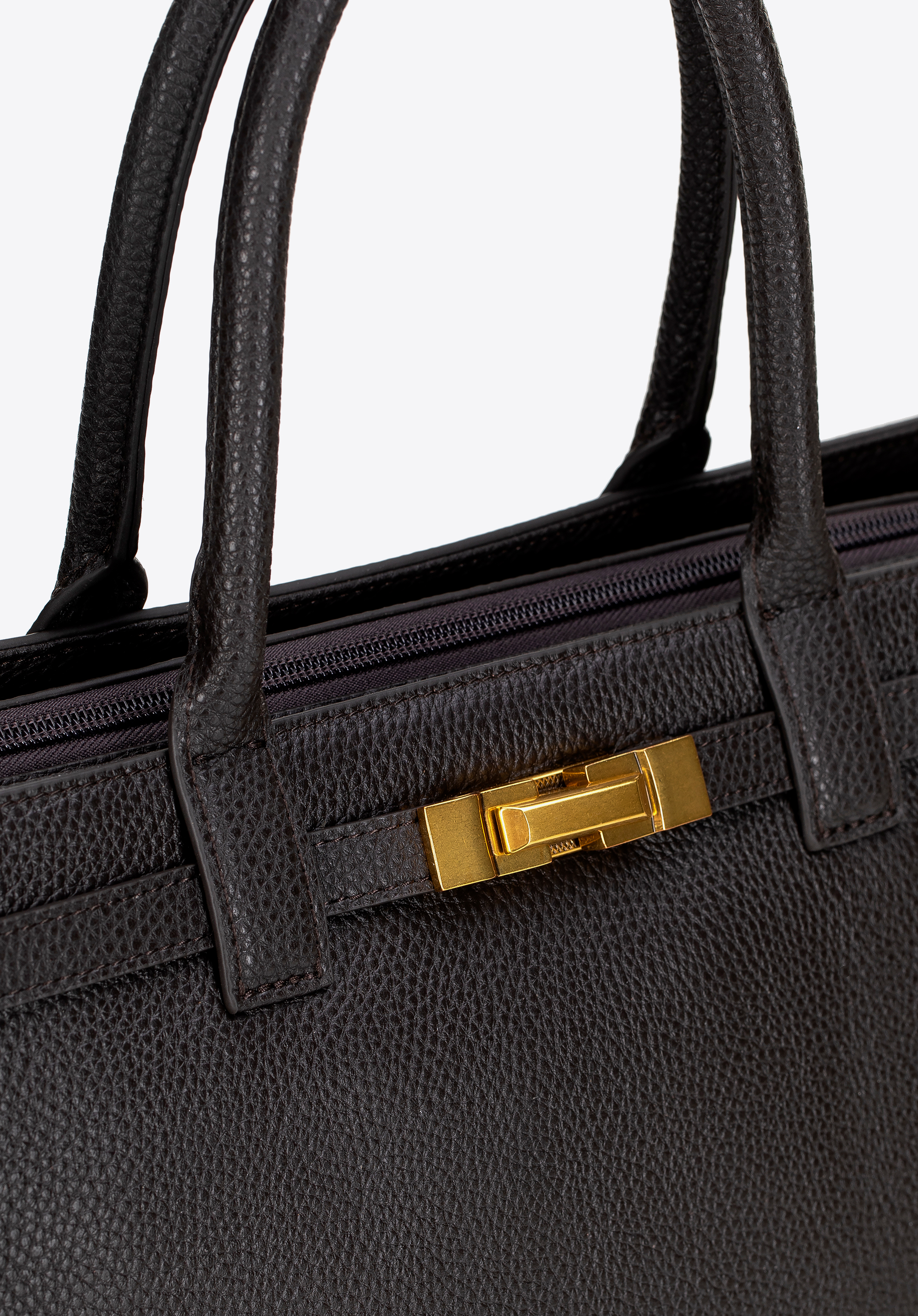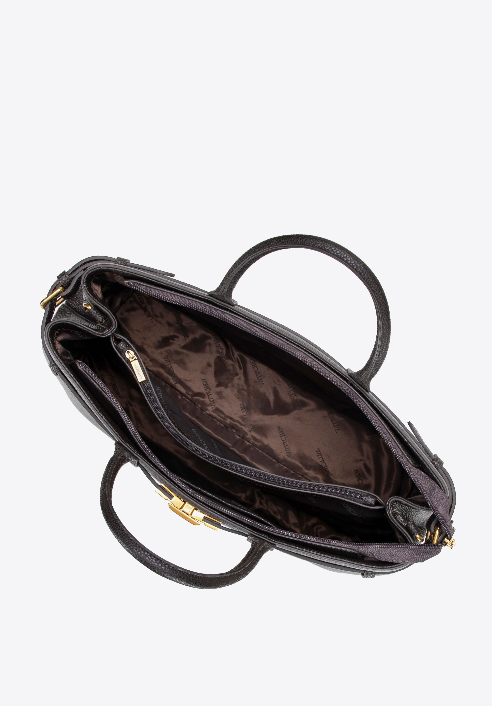 - Două mânere robuste : Facilitează transportul genții în mână, subliniind aspectul său clasic.