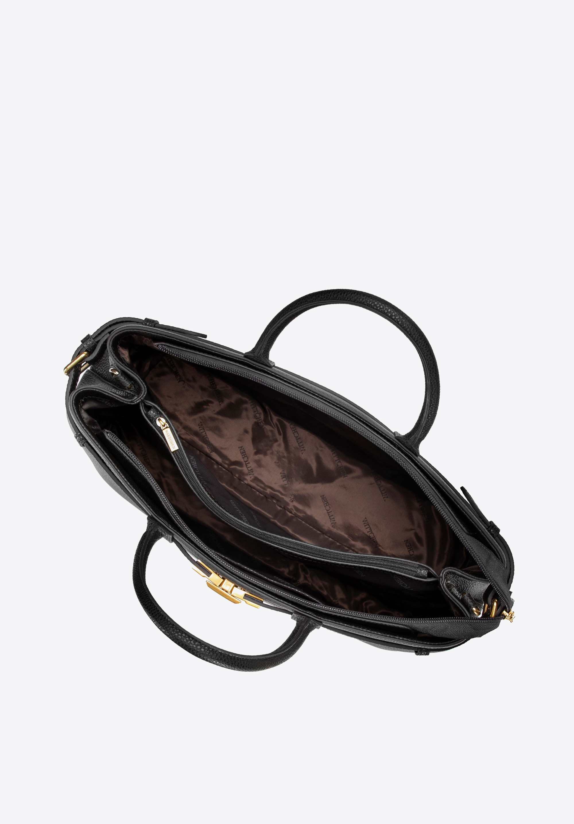 - Două mânere robuste : Facilitează transportul genții în mână, subliniind aspectul său clasic.