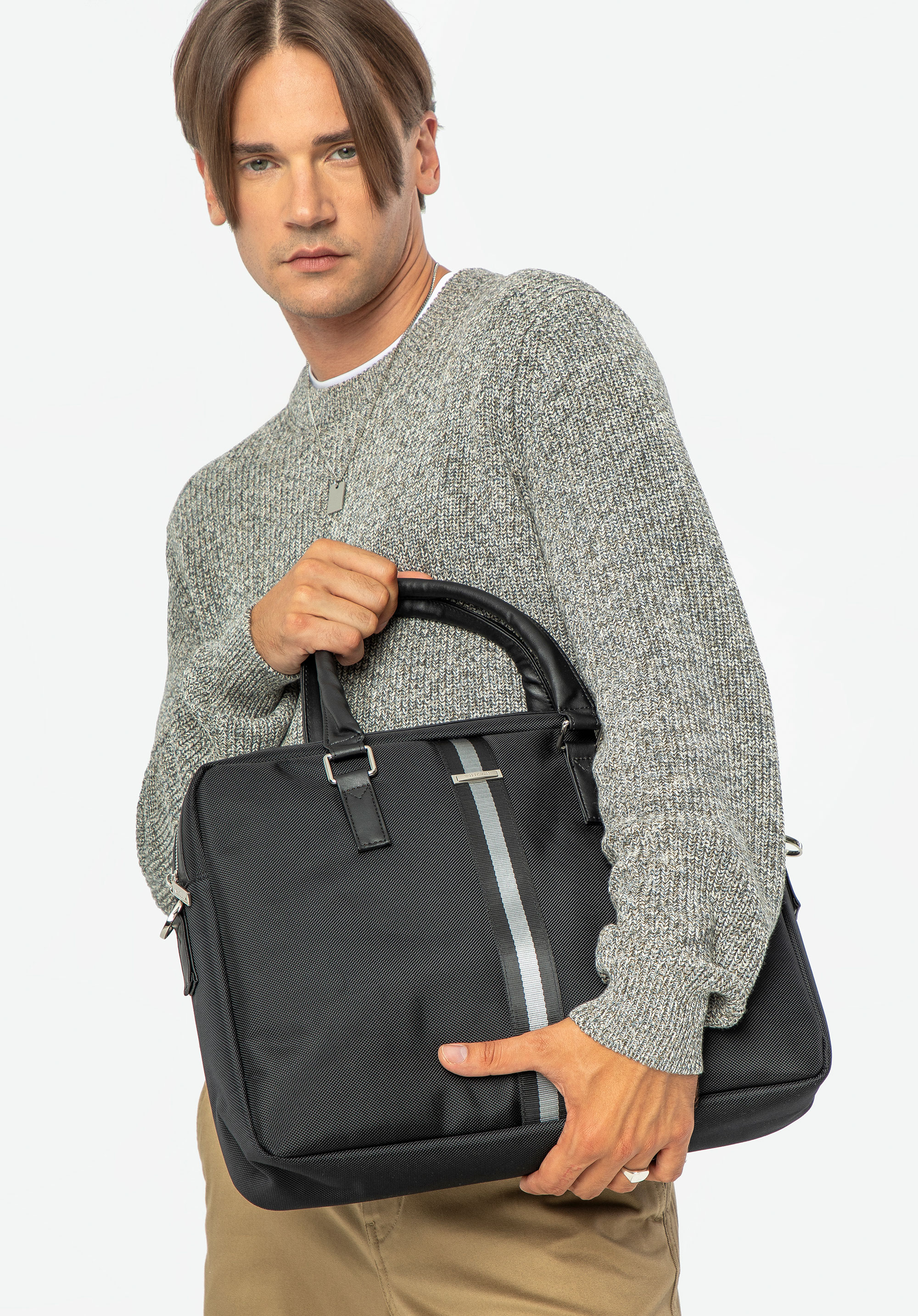 ascunde un dispozitiv electronic cu dimensiuni maxime:28 cm x 36 cm.Geanta pentru bărbați de 17” pentru laptop cu panglică este o alegere excelentă pentru orice bărbat elegant.