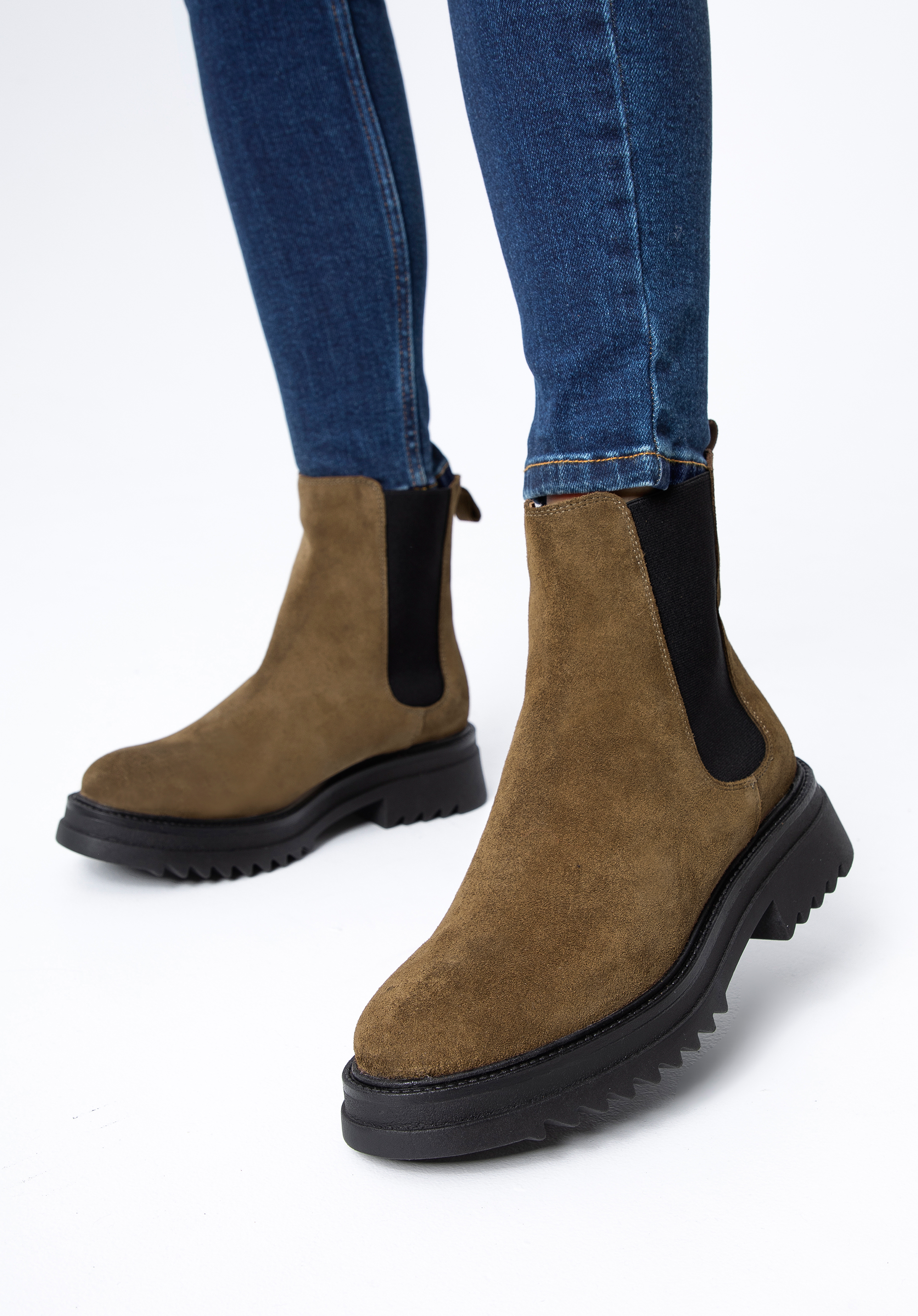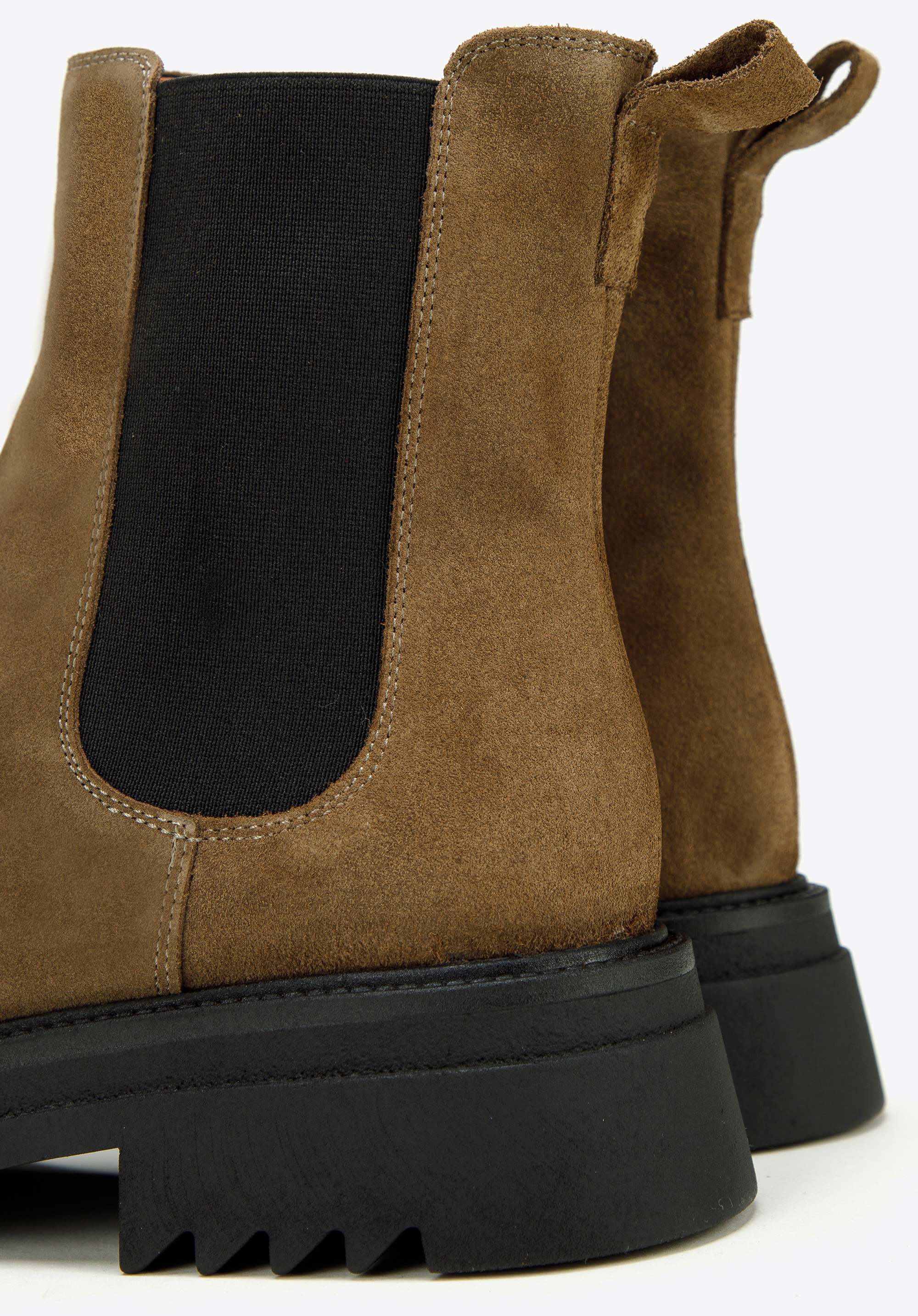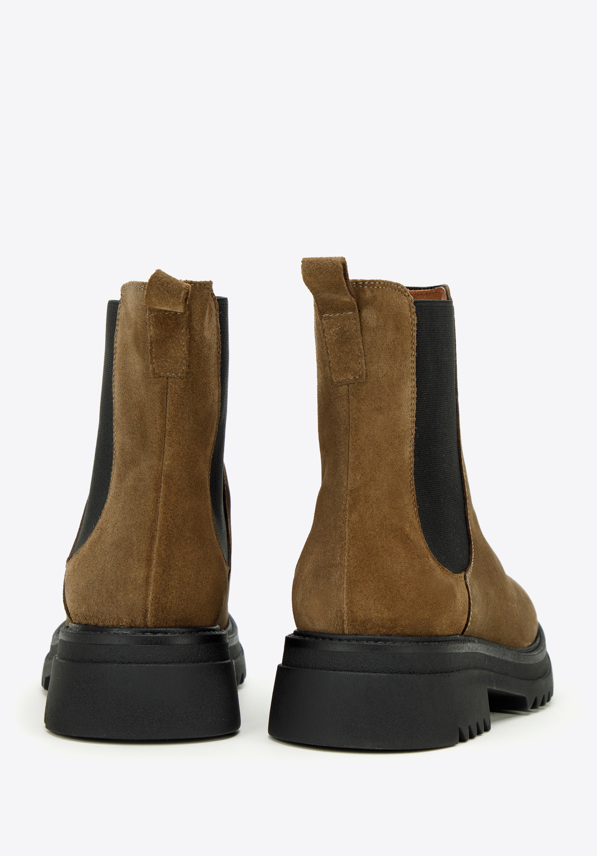 Ghete Chelsea de damă din piele de căprioară cu talpă groasă maro deschis
