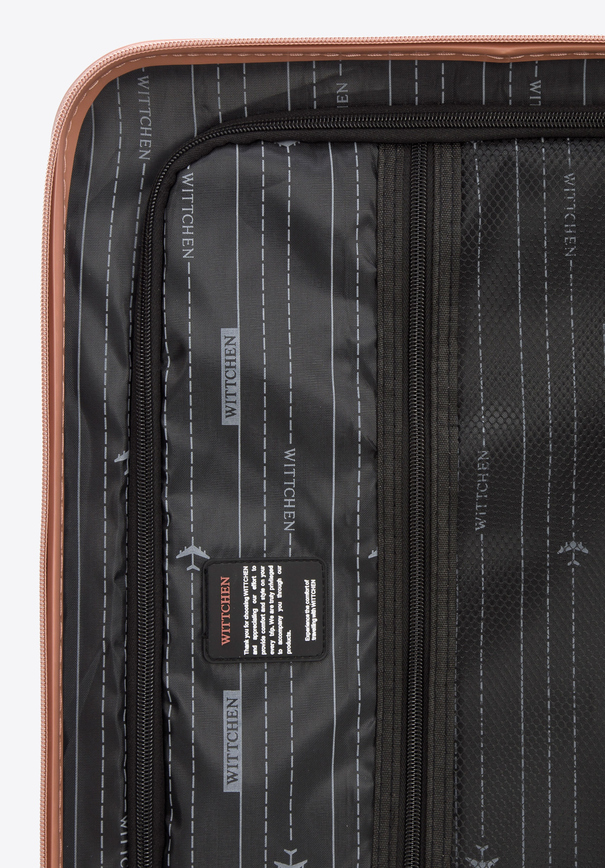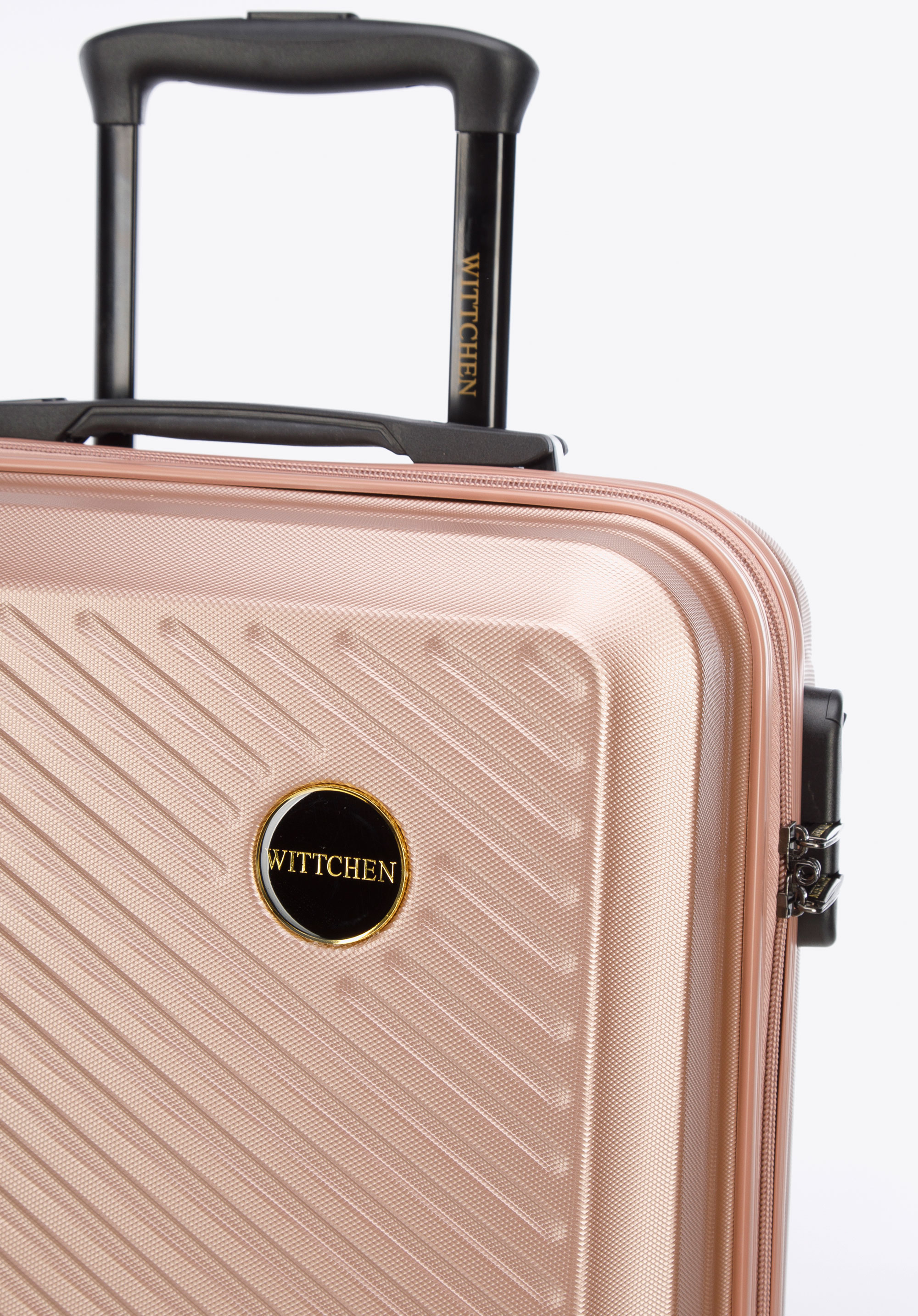 dungi diagonale în relief atât pe partea din față, cât și pe cea din spate a valizei.Acest model este