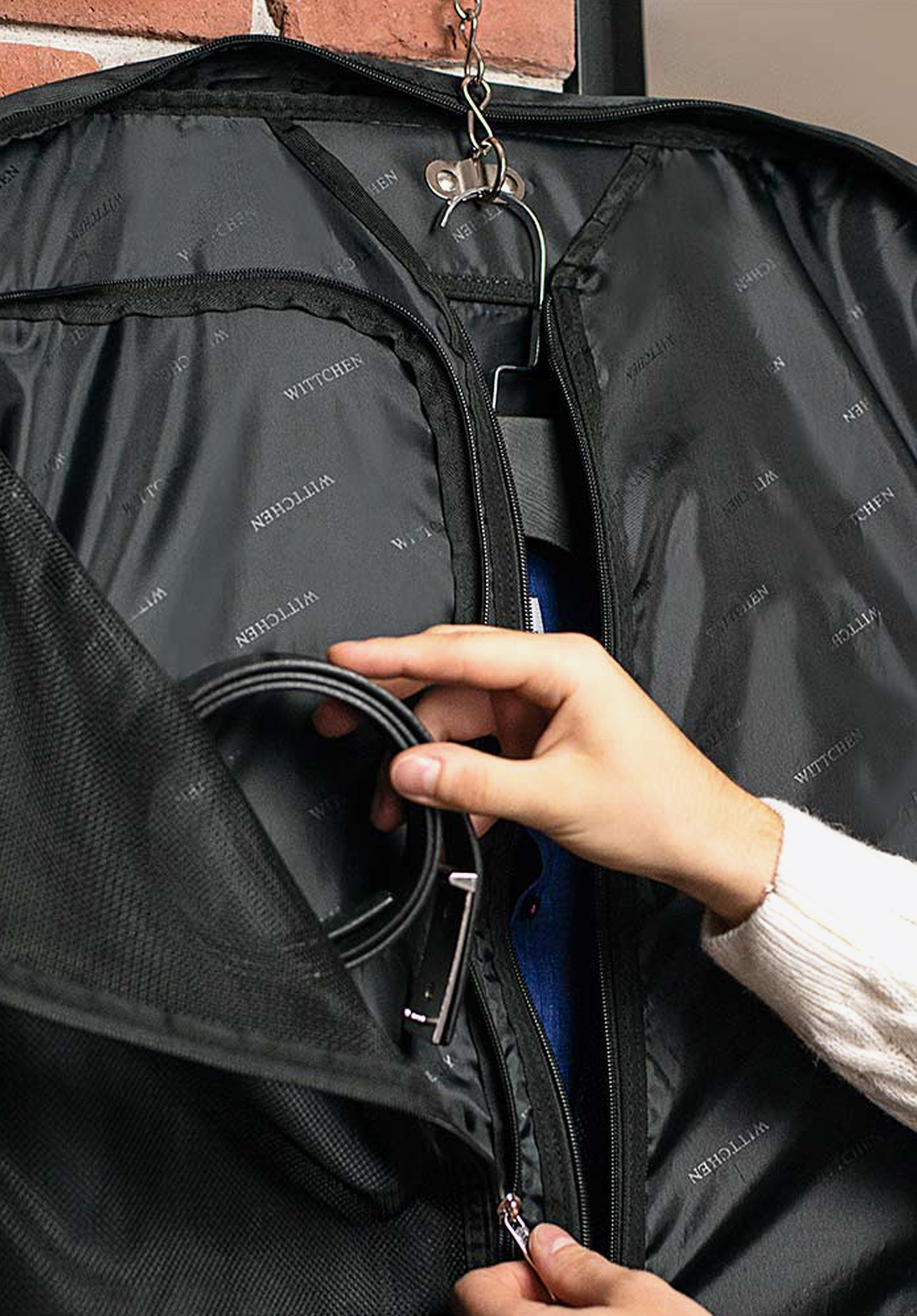 - Puneți costumul pe umeraș, agățați-l pe cârlig și închideți fermoarul până la capăt.