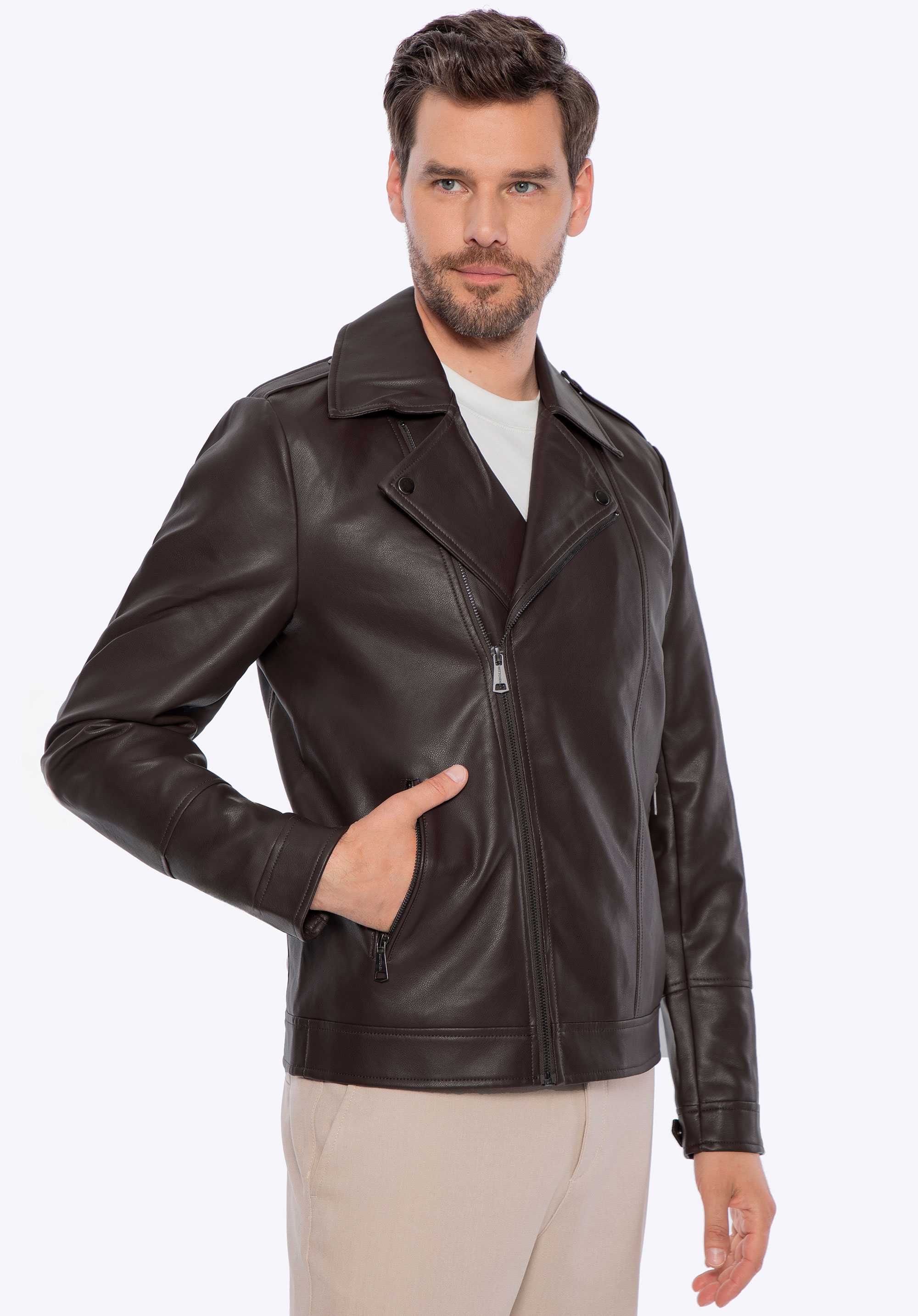 Această jachetă de motociclist pentru bărbați va actualiza cu stil garderoba modernă a unui bărbat. Această jachetă din piele artificială de calitate superioară este concepută cu un stil incredibil de la modă, un guler rabatabil și două buzunare cu fermoar. Combinația dintre o croială confortabilă și o manoperă de calitate asigură o protecție excelentă în zilele mai reci. Se asortează perfect cu blugi și un pulover. Această jachetă din piele artificială pentru bărbați este un accesoriu atemporal pentru garderoba oricărui bărbat elegant.