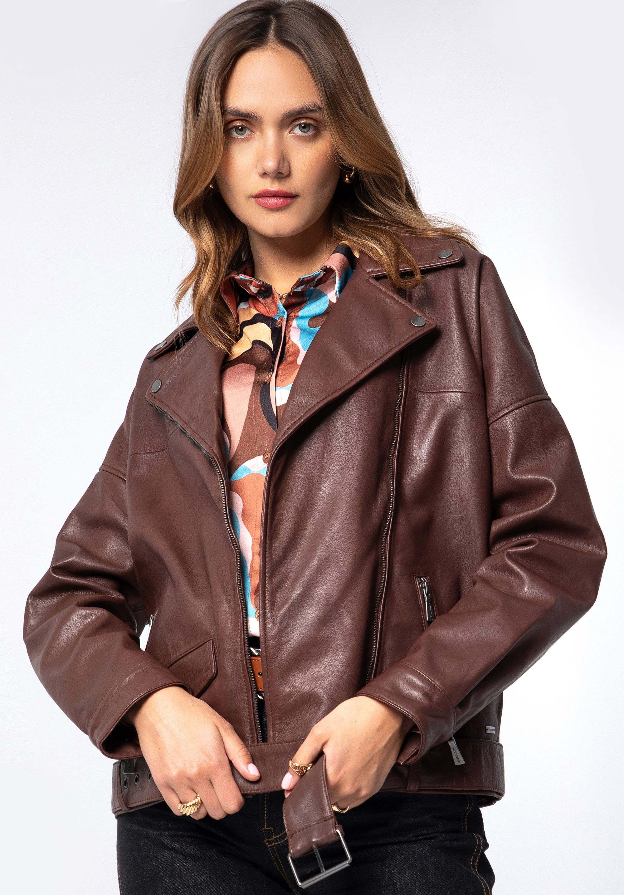 Calitate excelentă, manoperă de precizie și atenție la cel mai mic detaliu - asta reprezintă geaca noastră de motociclist din piele. Confecționată din piele de oaie de înaltă calitate, cu un finisaj semi-mat, aceasta se distinge de alte jachete pentru femei. Este un model cu croială supradimensionată și mâneci joase, ceea ce conferă look-ului general o notă de casualitate și ușurință. Ca o jachetă tipică de motociclist, are guler cu rever și închidere asimetrică cu fermoar. Un caracter rocker este adăugat de fermoarele de pe manșete și de cureaua din piele cu cataramă, pe care nu numai că o puteți îndepărta, dar o puteți și ajusta după cum doriți. Jacheta biker din piele oversize pentru femei are multe avantaje - verificați-le singuri!