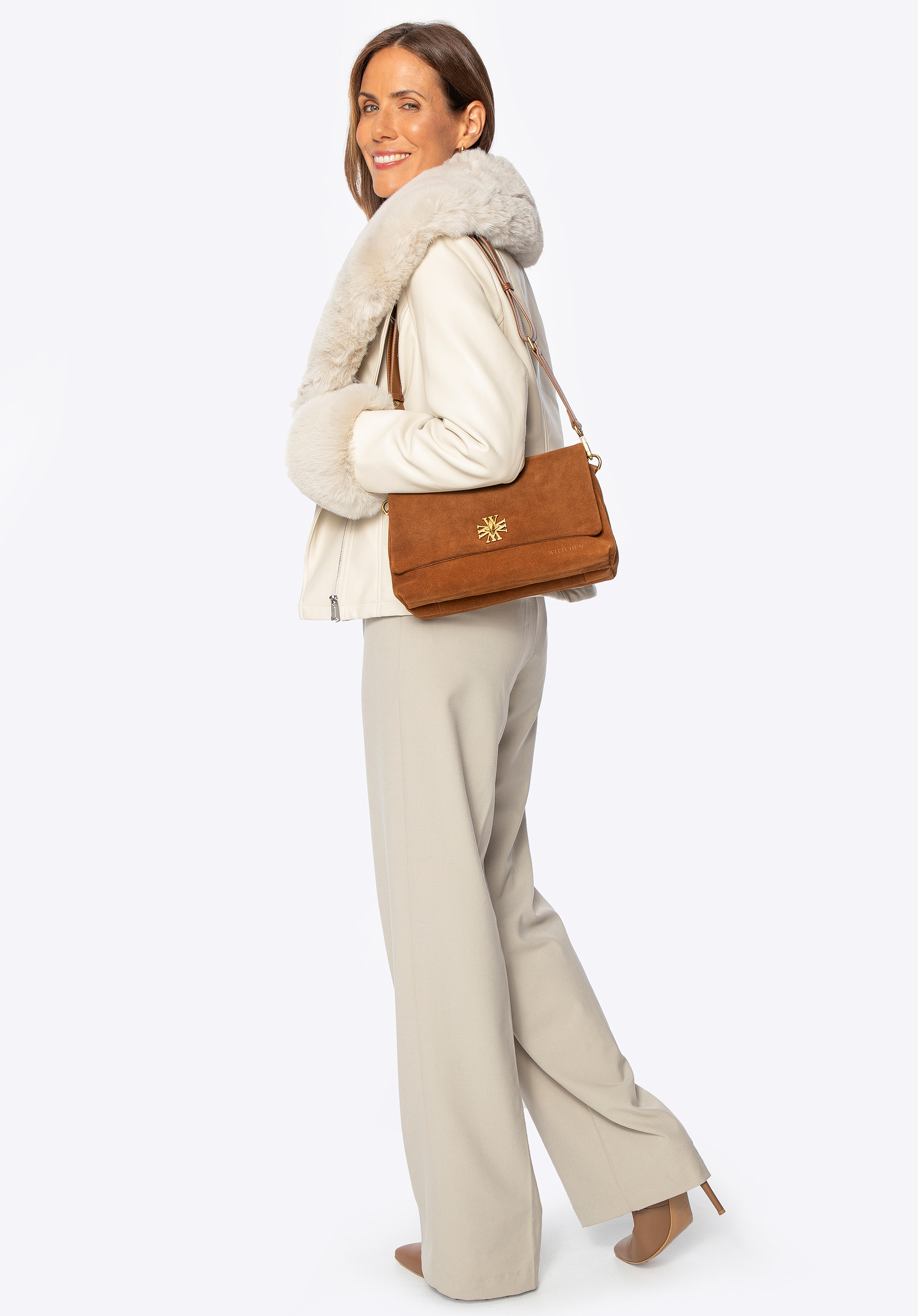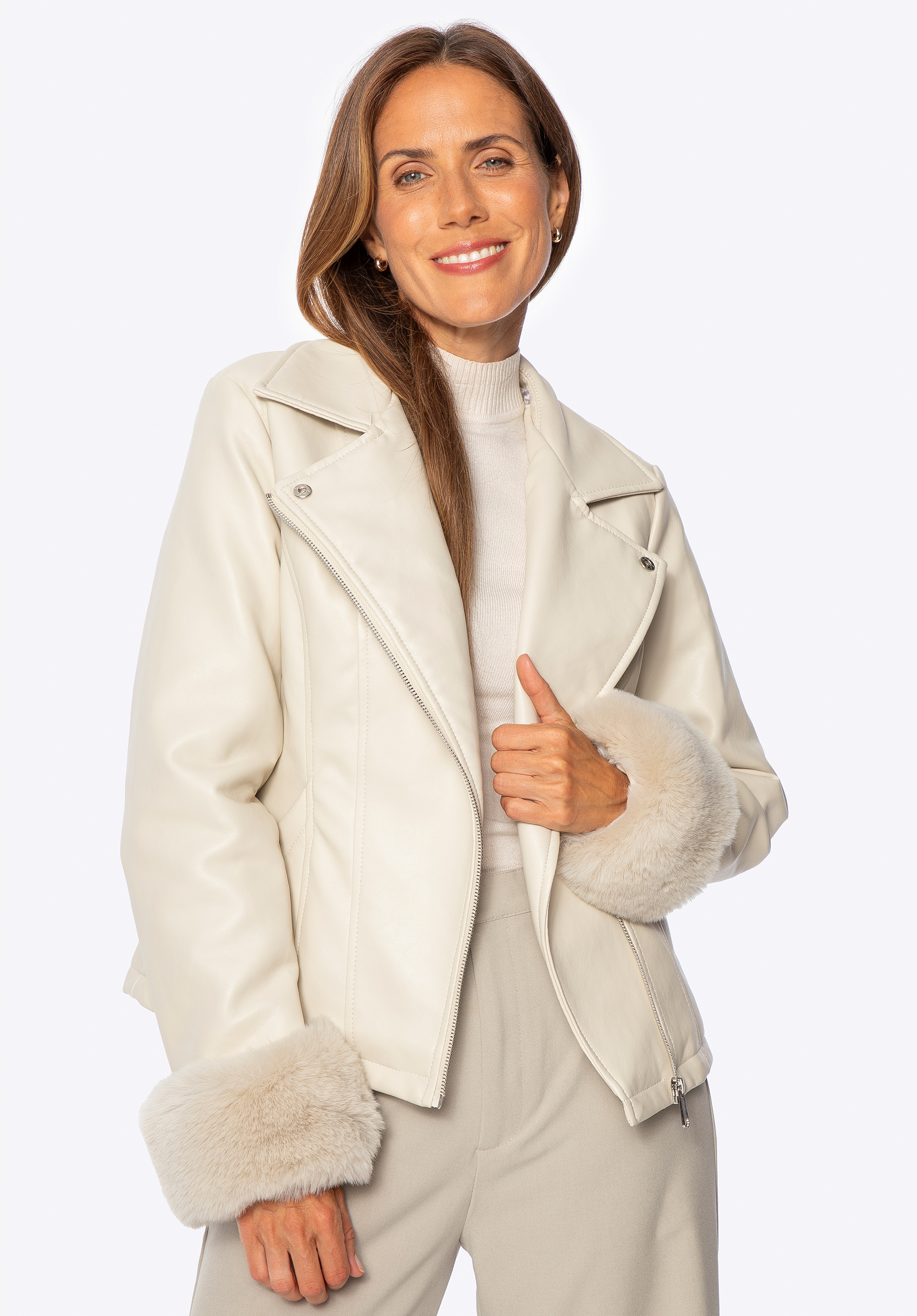 O siluetă modernă întâlnește eleganța atemporală în această jachetă unică din piele ecologică . Creată cu grijă până la fiecare detaliu, combină un aspect elegant cu confortul de zi cu zi. Închiderea durabilă cu fermoar asigură o închidere lină, în timp ce buzunarele funcționale cu capse îți păstrează lucrurile esențiale în siguranță. Designul este finisat cu un guler și manșete din blană ecologică , adăugând o notă de șic și căldură confortabilă. Când îți dorești o atmosferă diferită, desface pur și simplu gulerul pentru un efect elegant.