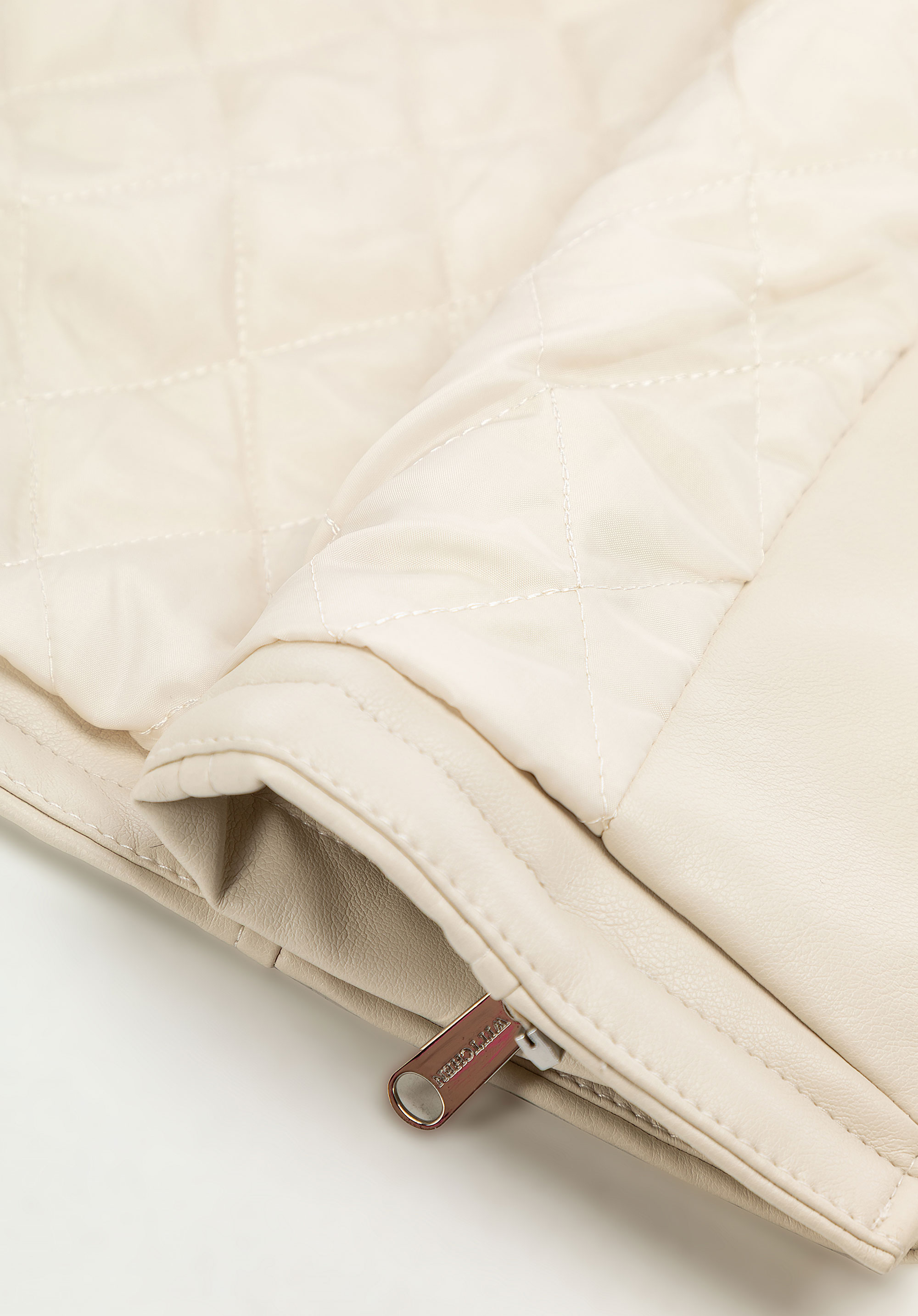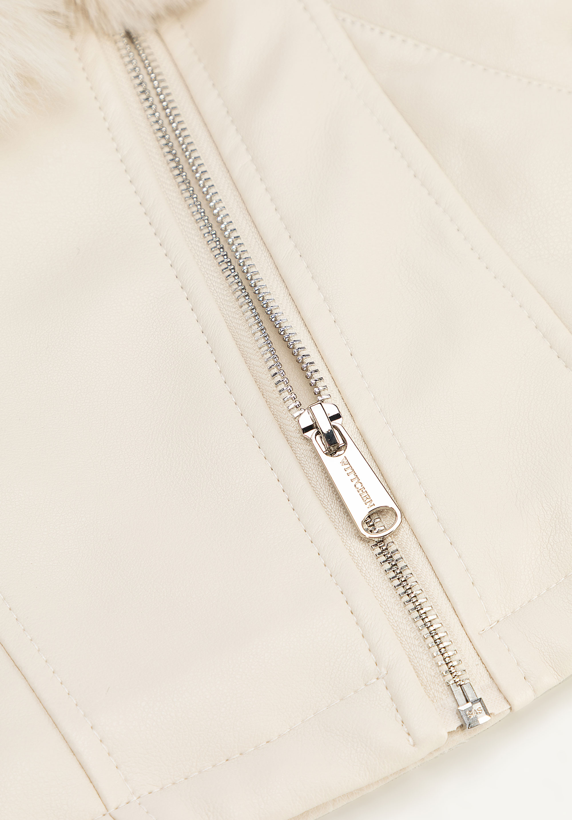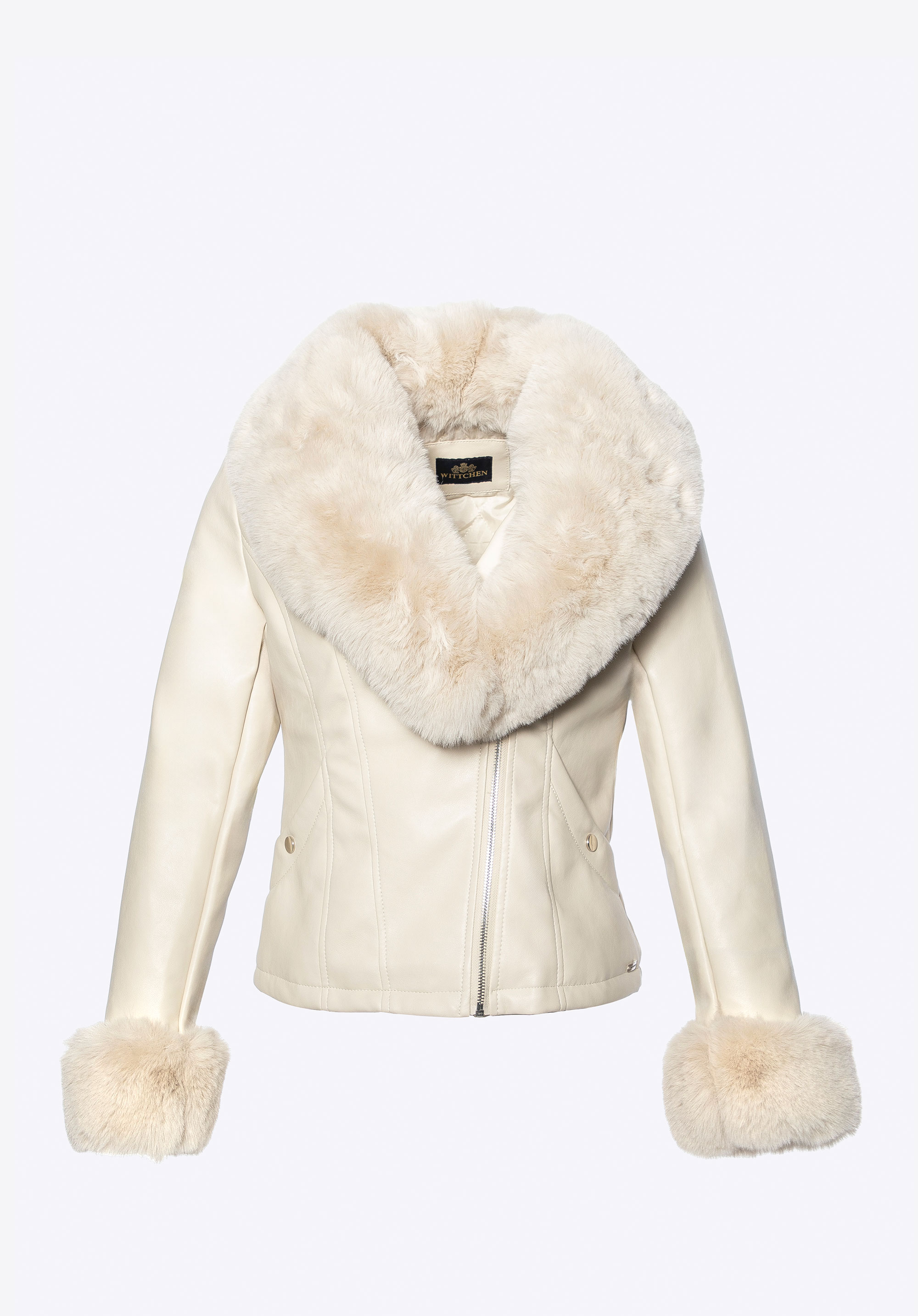 - Compoziție : Material exterior : 100% piele artificială; căptușeală : 100% poliester; guler și manșete : 100% blană artificială – poliester.