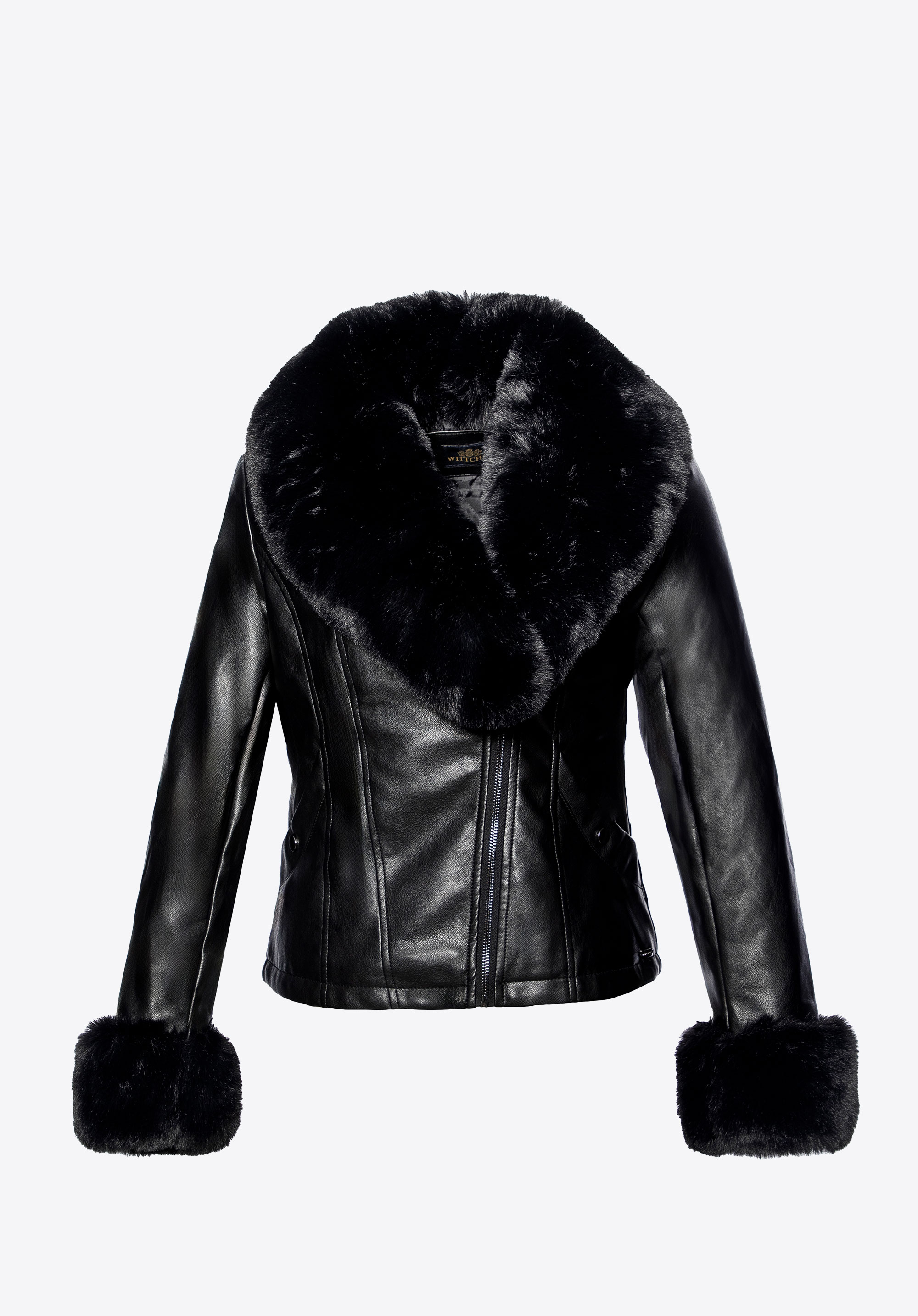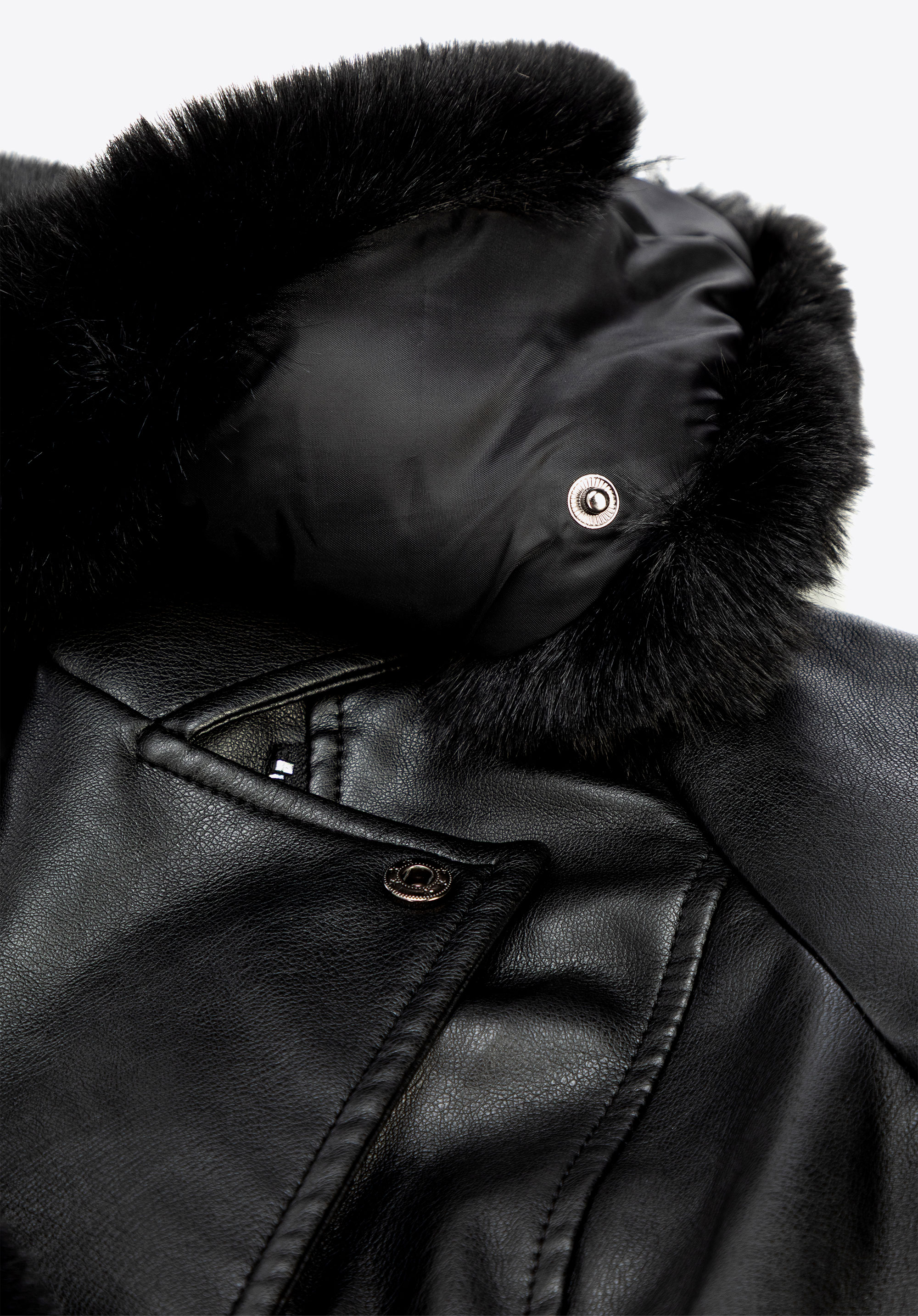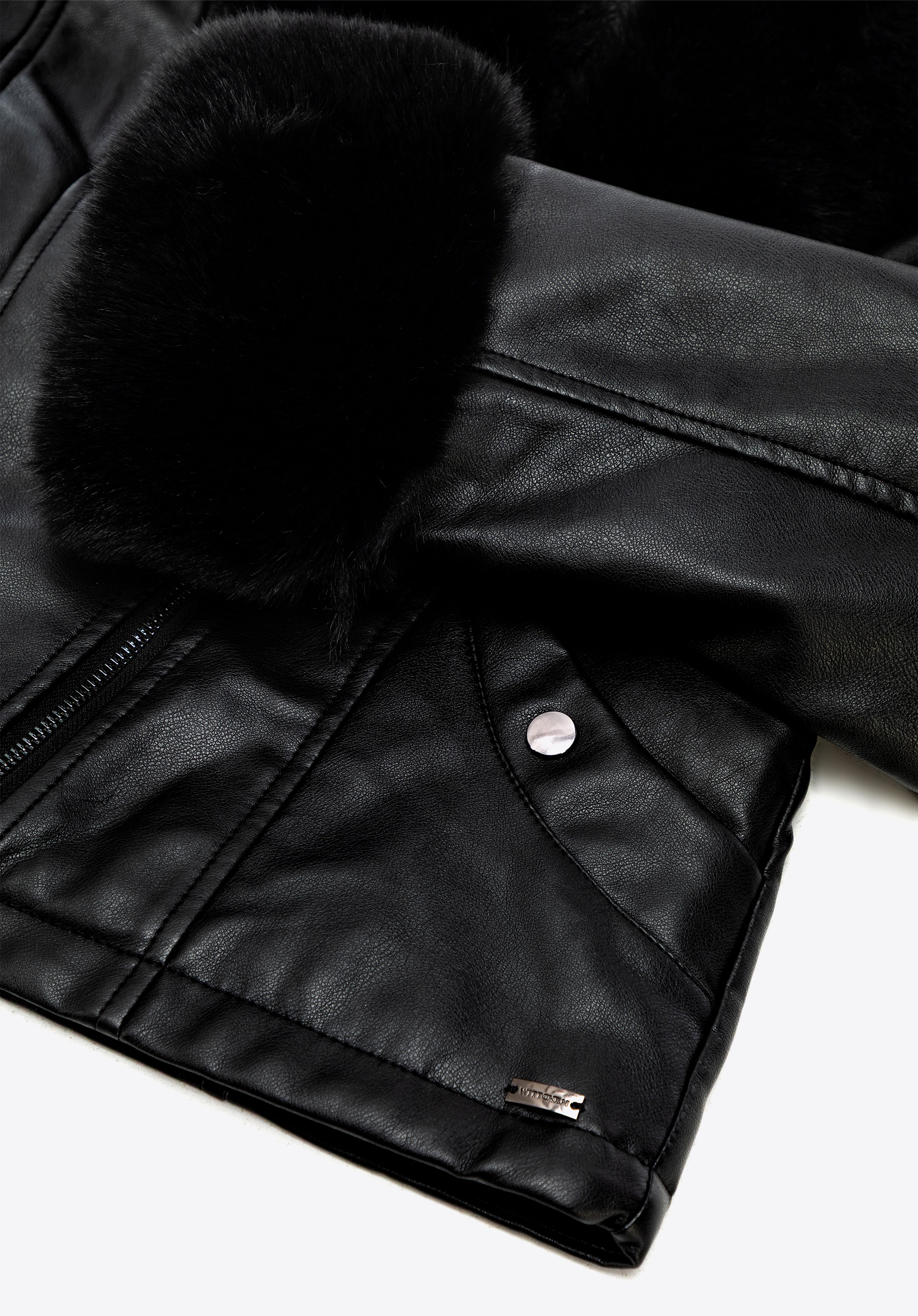 - Compoziție : Material exterior : 100% piele artificială; căptușeală : 100% poliester; guler și manșete : 100% blană artificială – poliester.