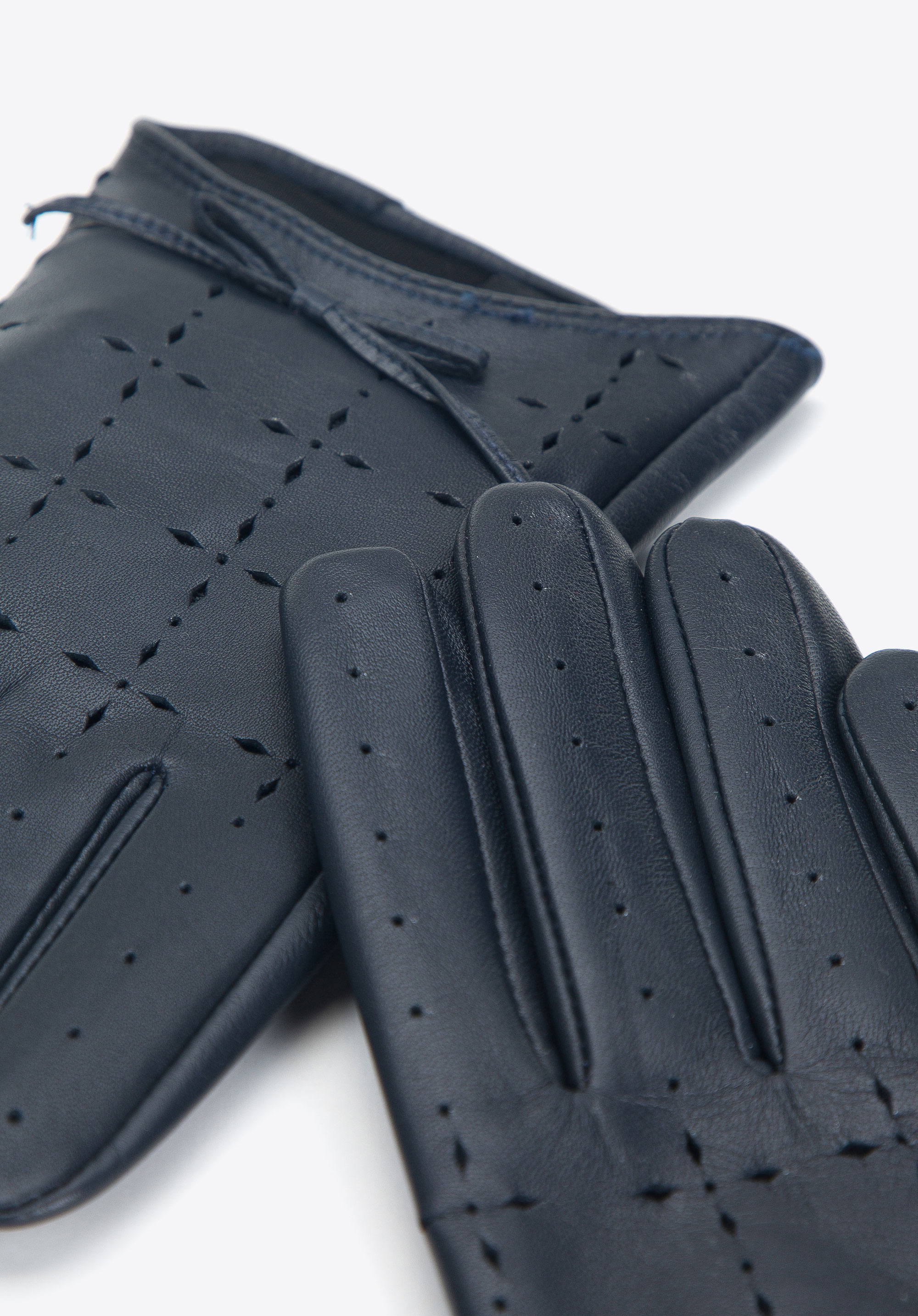 Manusi de dama clasice, neizolate, din piele de oaie de cea mai buna calitate.Modelele subtile perforate care impodobesc modelul fac din manusi o delicatesa feminina.Întregul subliniat cu o fundă elegantă, păstrează un caracter stilat.