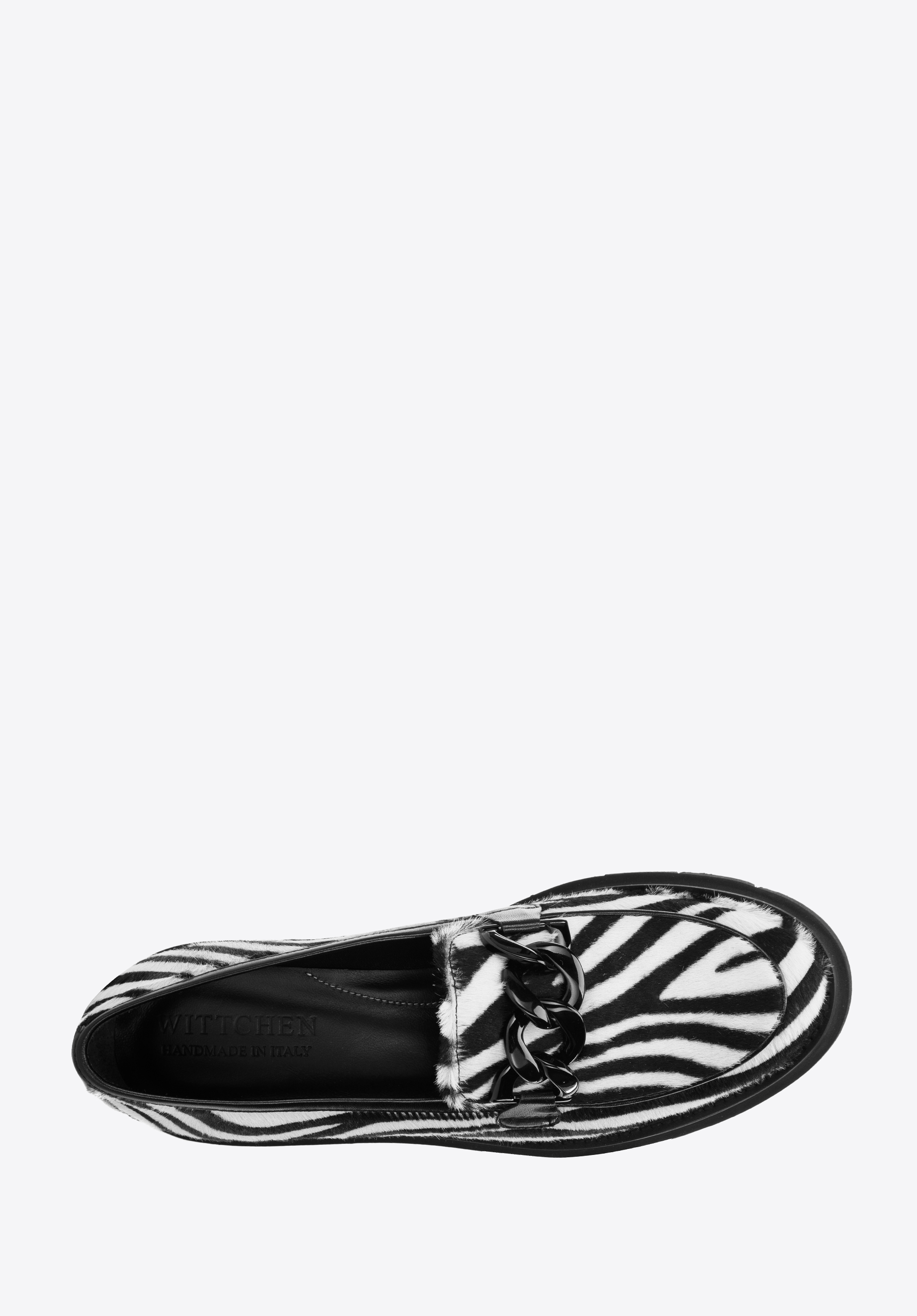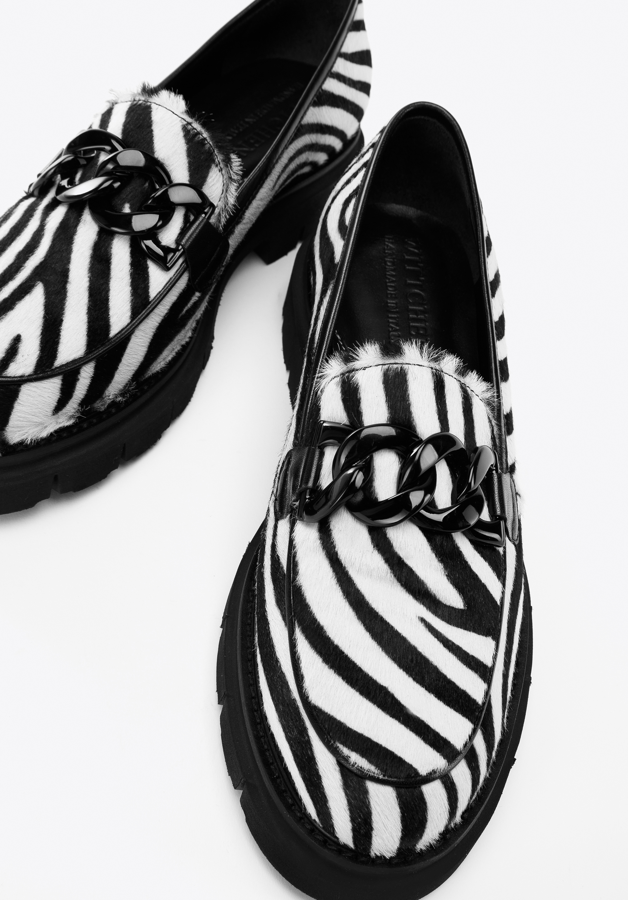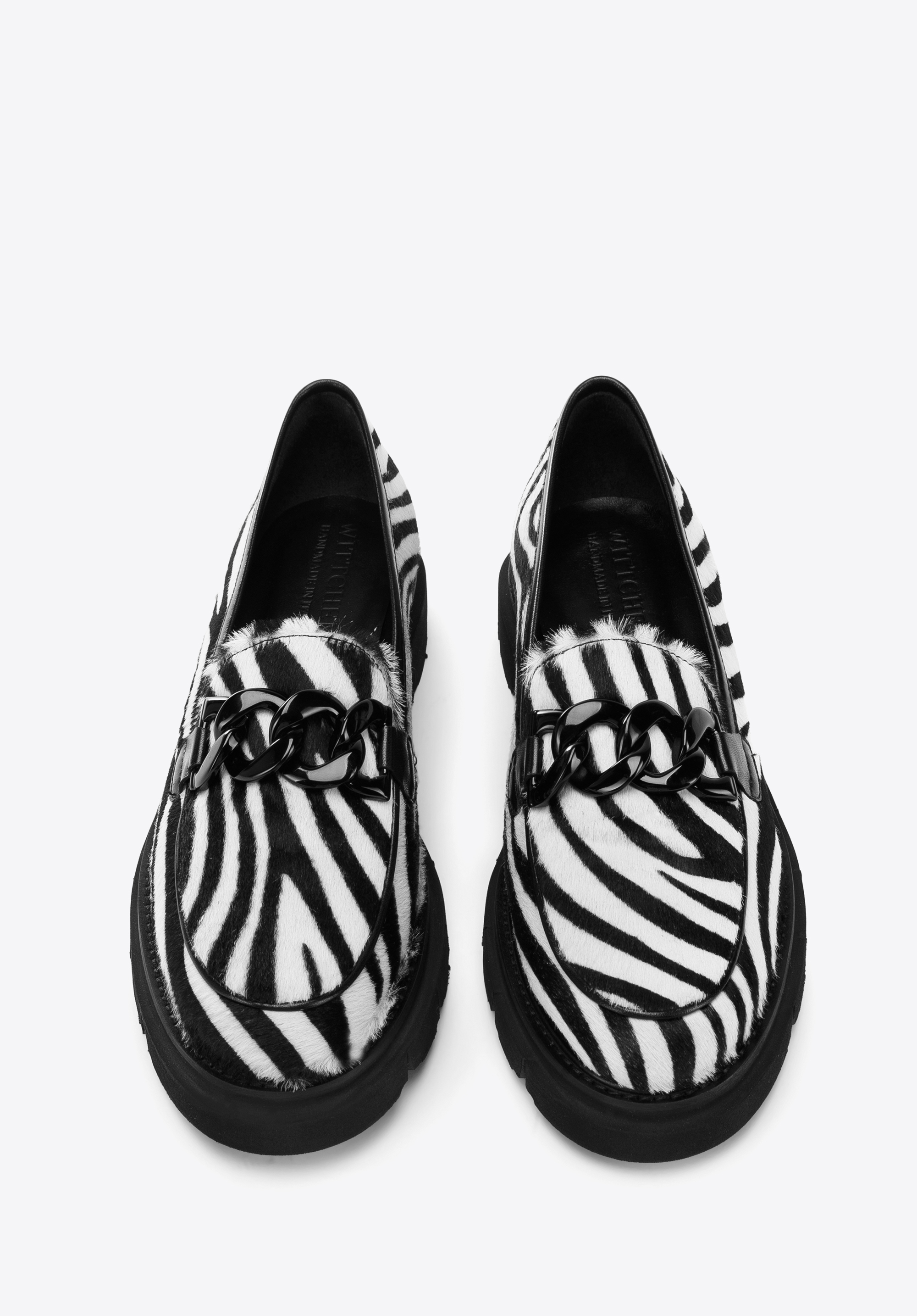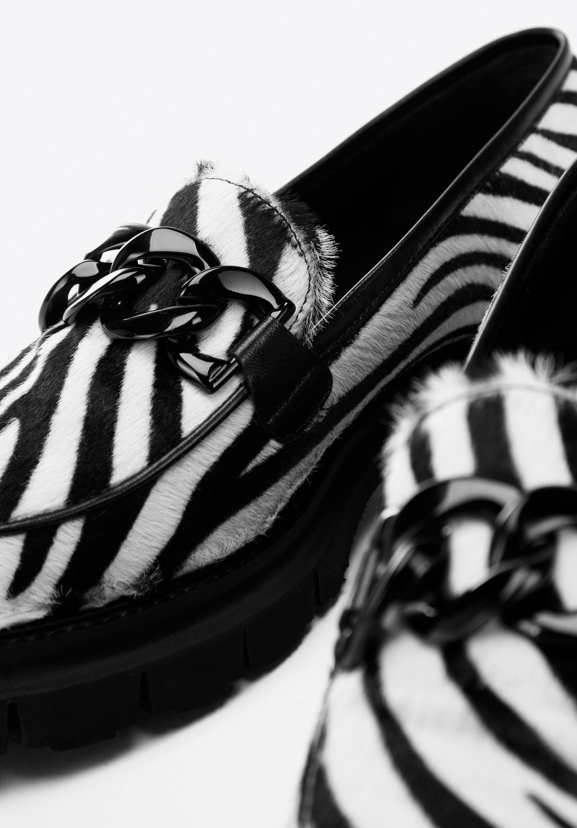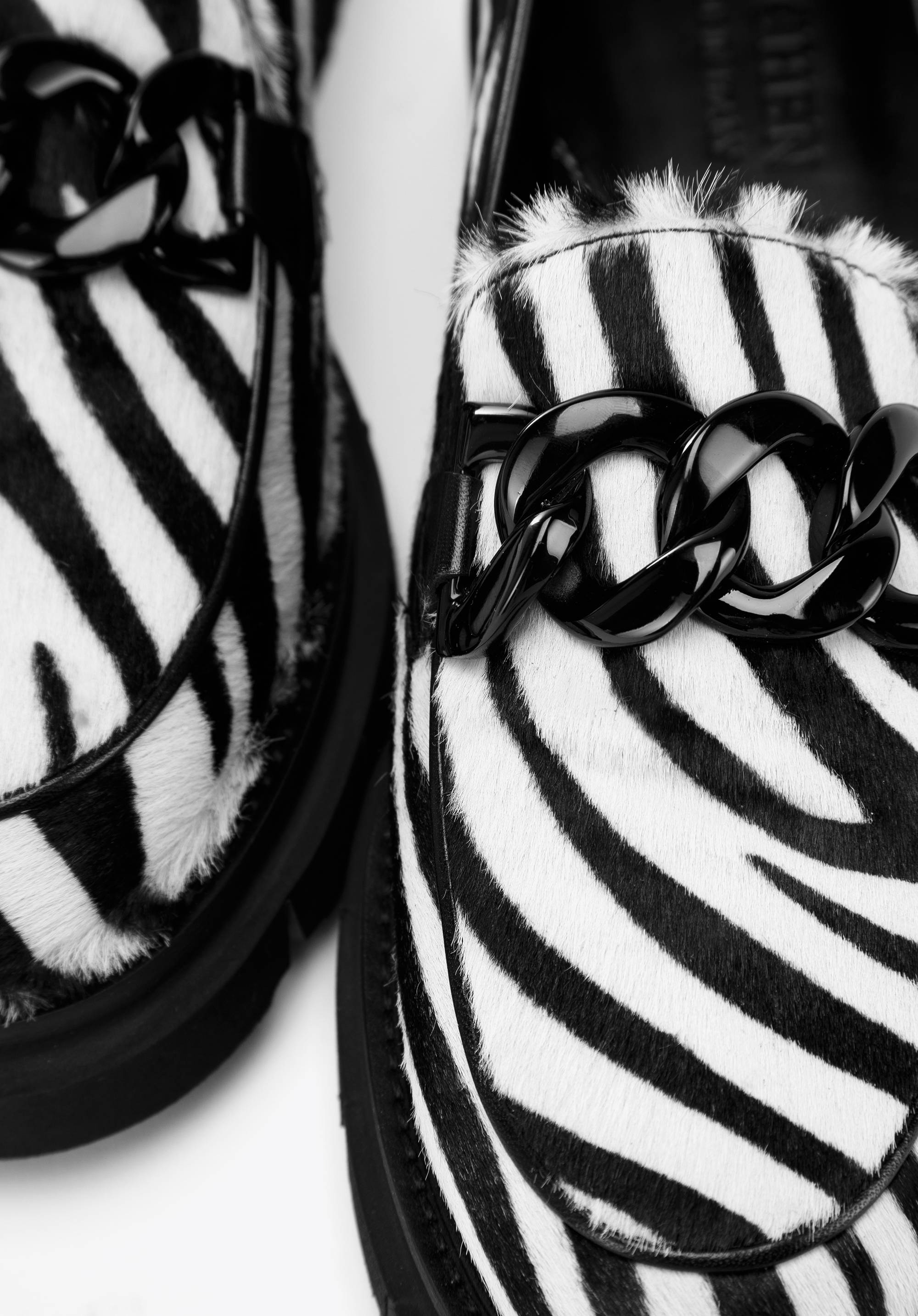 Nu vei trece neobservată în acești pantofi unici. Au fost fabricați in Italia din piele cu peri, ceea ce conferă întregii un caracter unic. Stilul clasic de mocasini este completat de un lanț negru ușor strălucitor. Datorită platformei groase, puteți merge confortabil în ei timp de multe ore. Poartă-i cu minirochia ta preferată sau combina-i cu blugi si o camasă - vei arăta elegant în orice situatie. Mocasinii de damă din piele cu lanț gros sunt un accesoriu la modă pe care îl poți purta în fiecare zi.