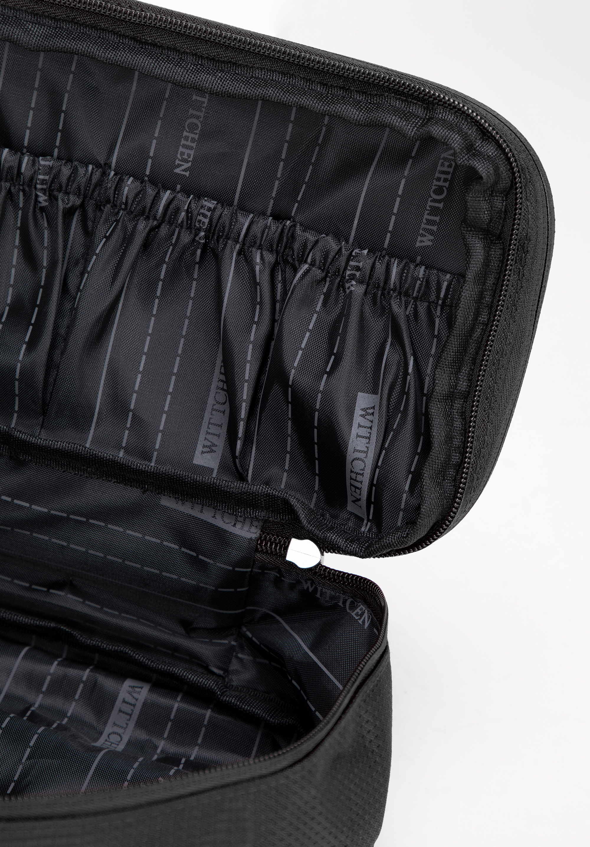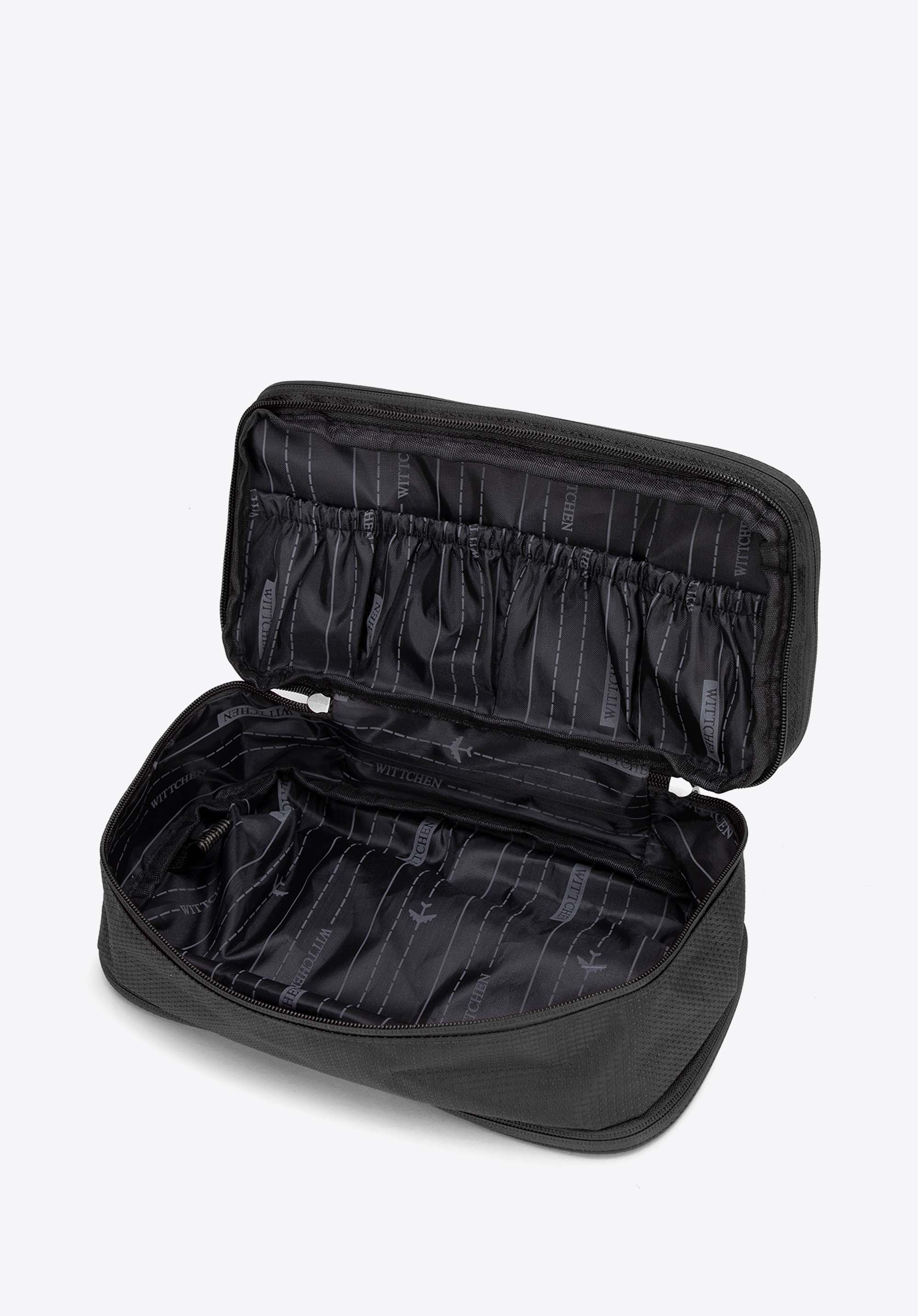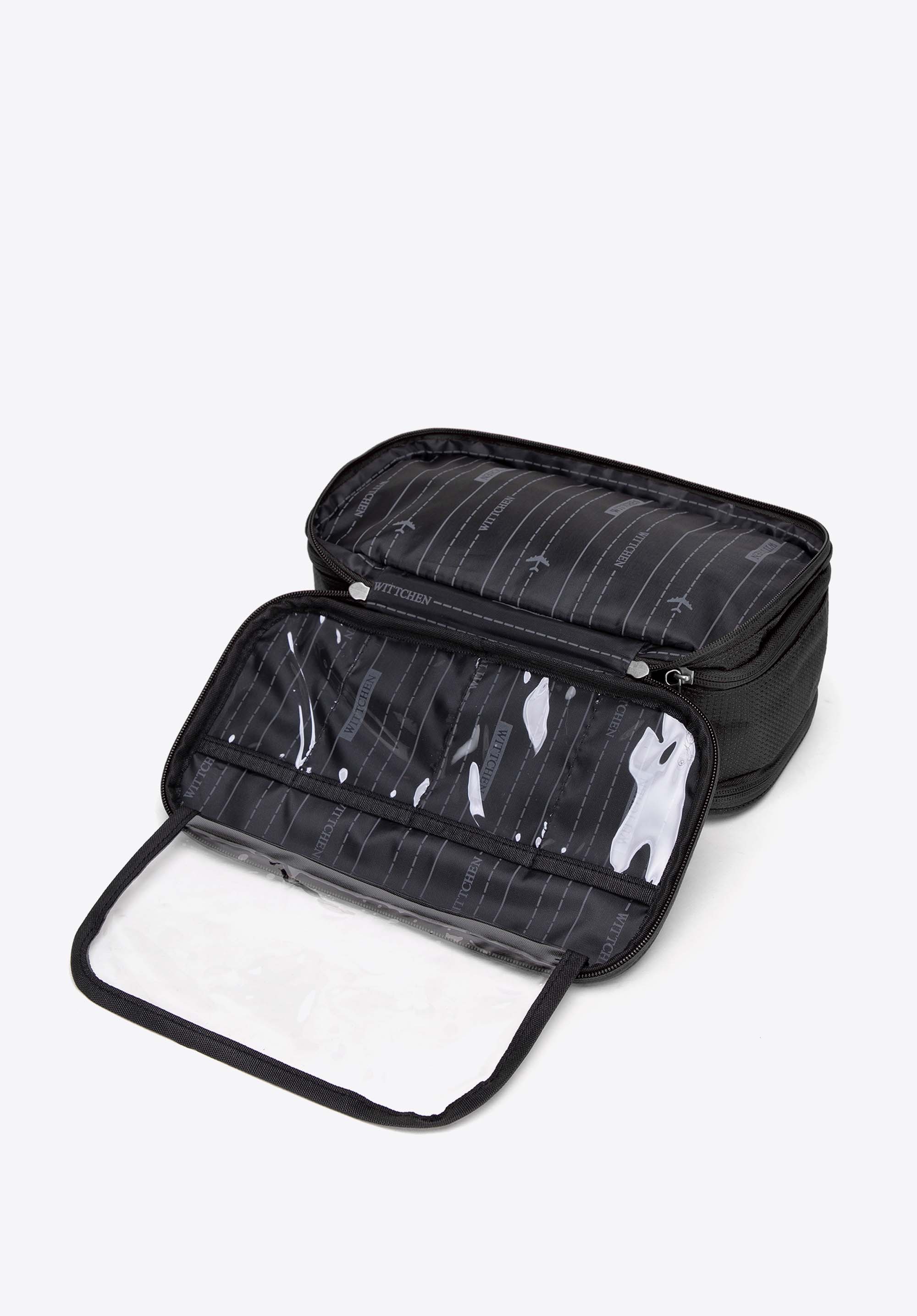- Organizare: Primul compartiment are patru buzunare mici din PVC pentru obiecte mici. Compartimentul din mijloc include patru buzunare elastice cu benzi de cauciuc pentru a fixa obiectele mici, prevenind mișcarea și deteriorarea.