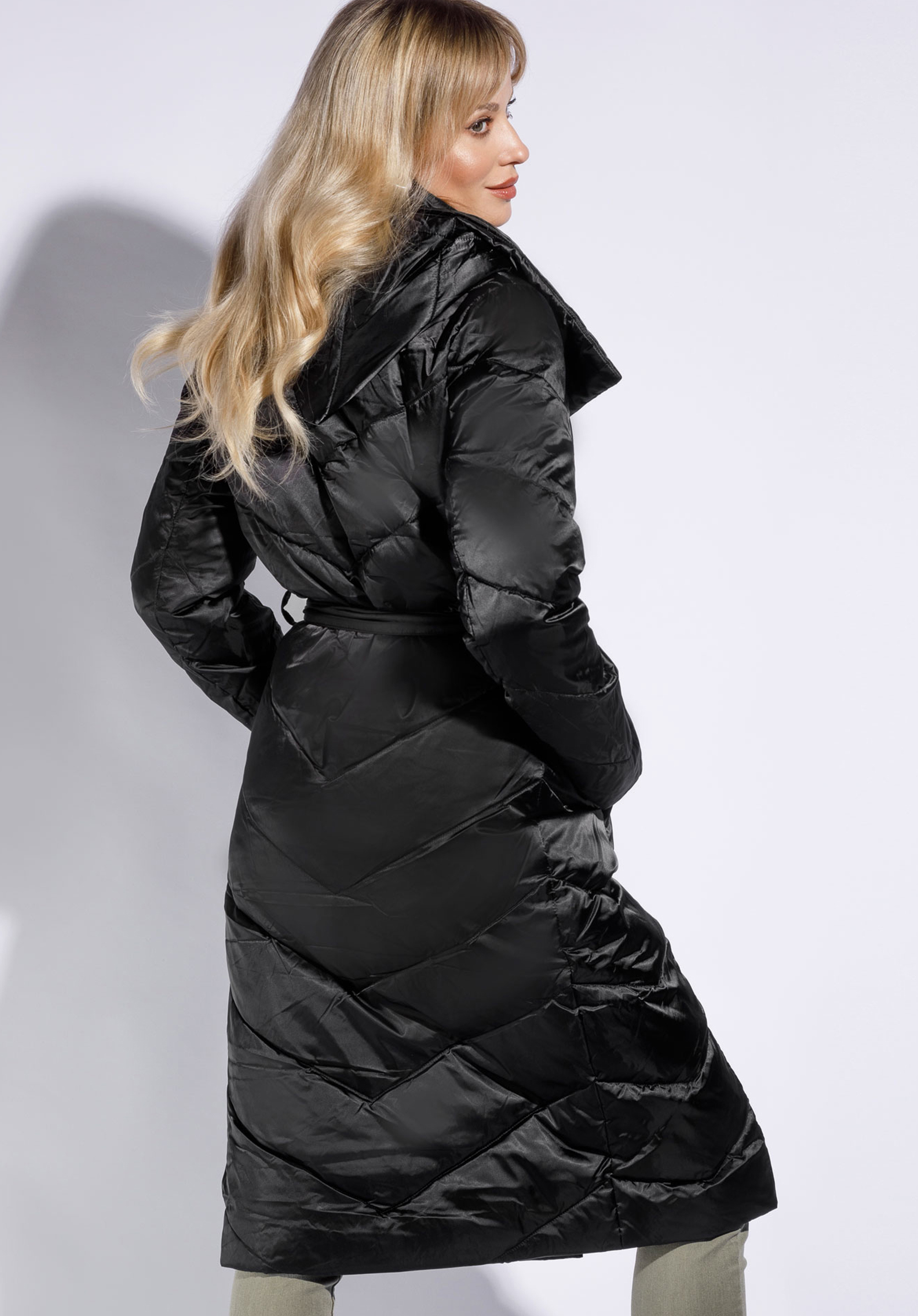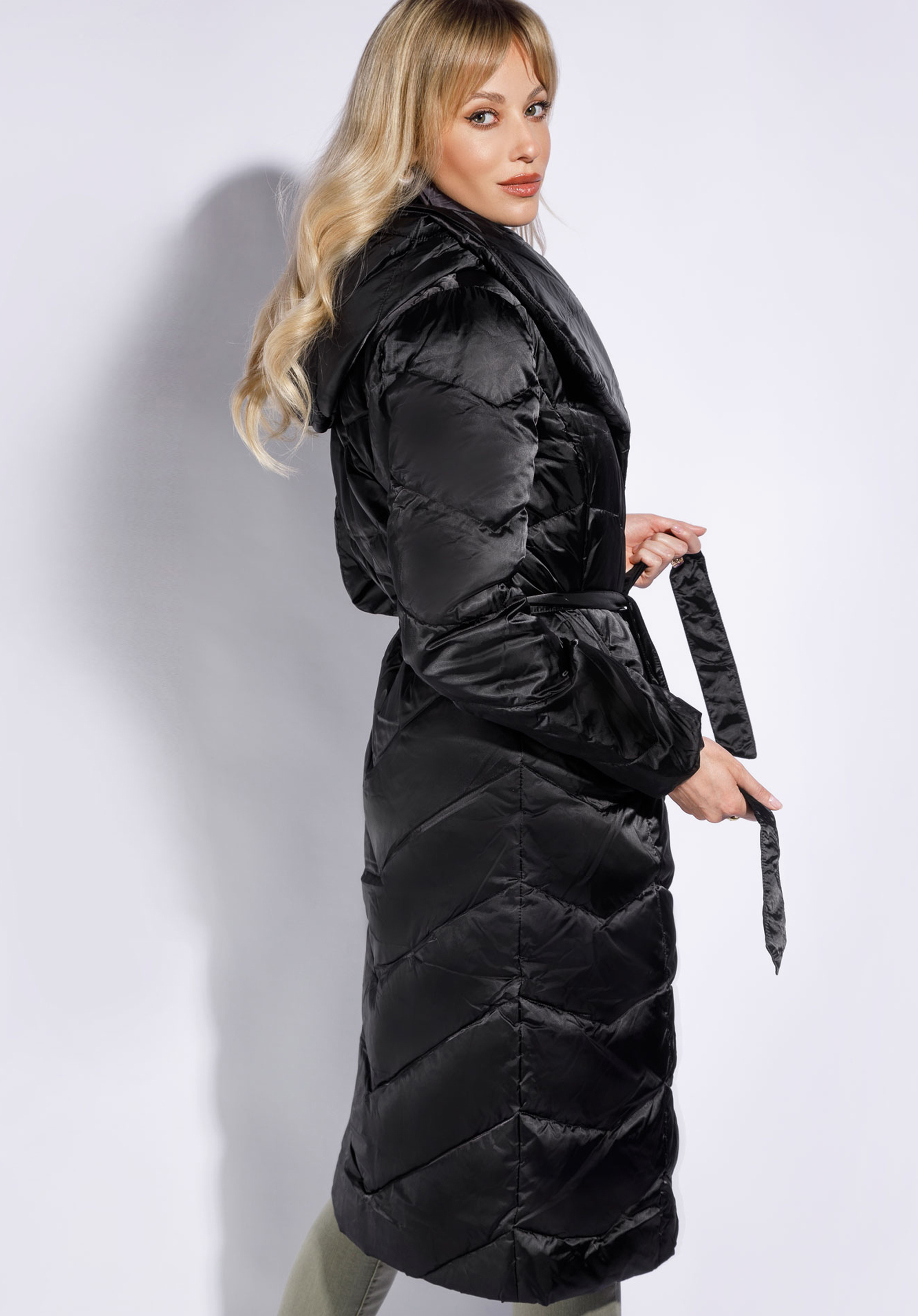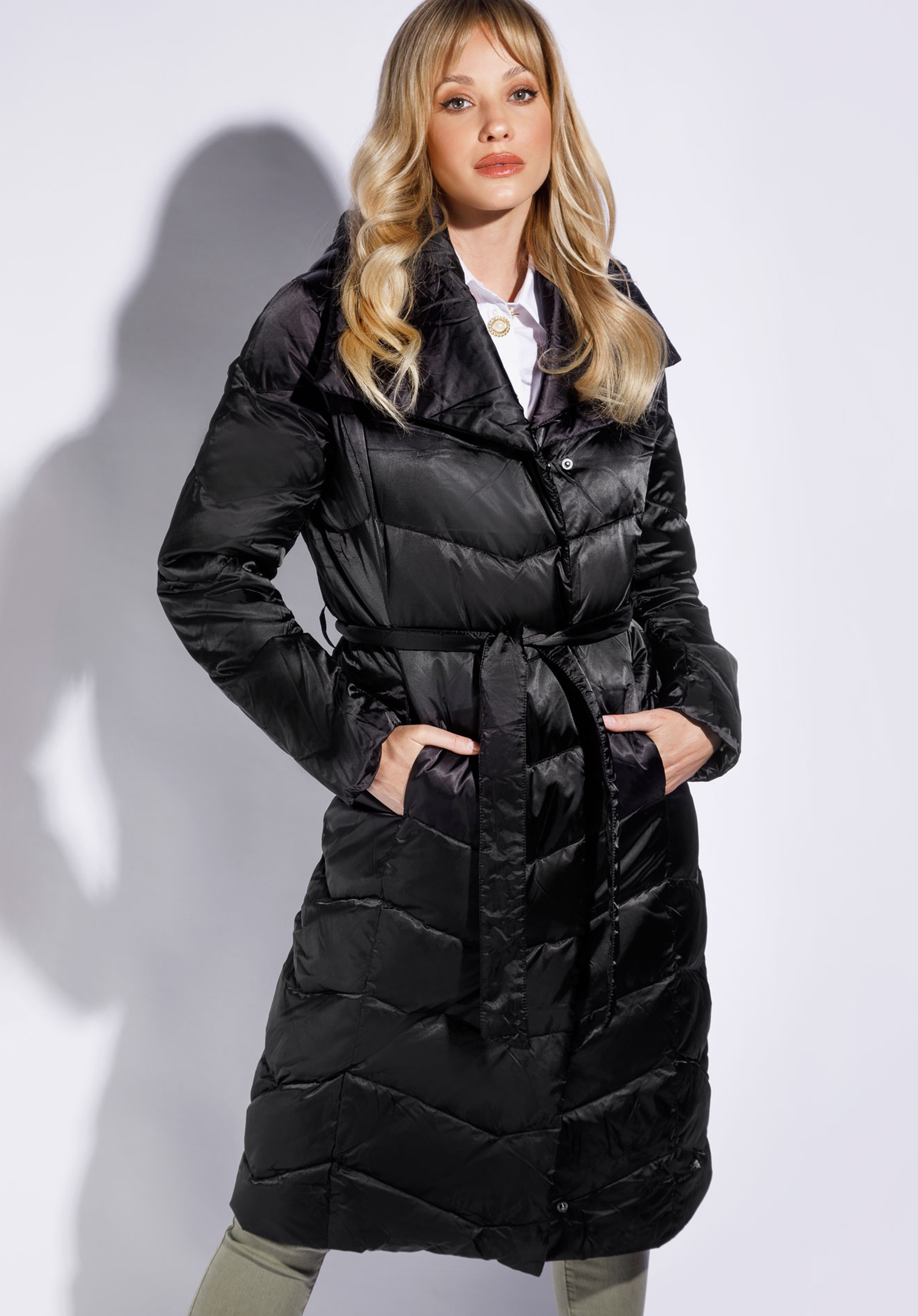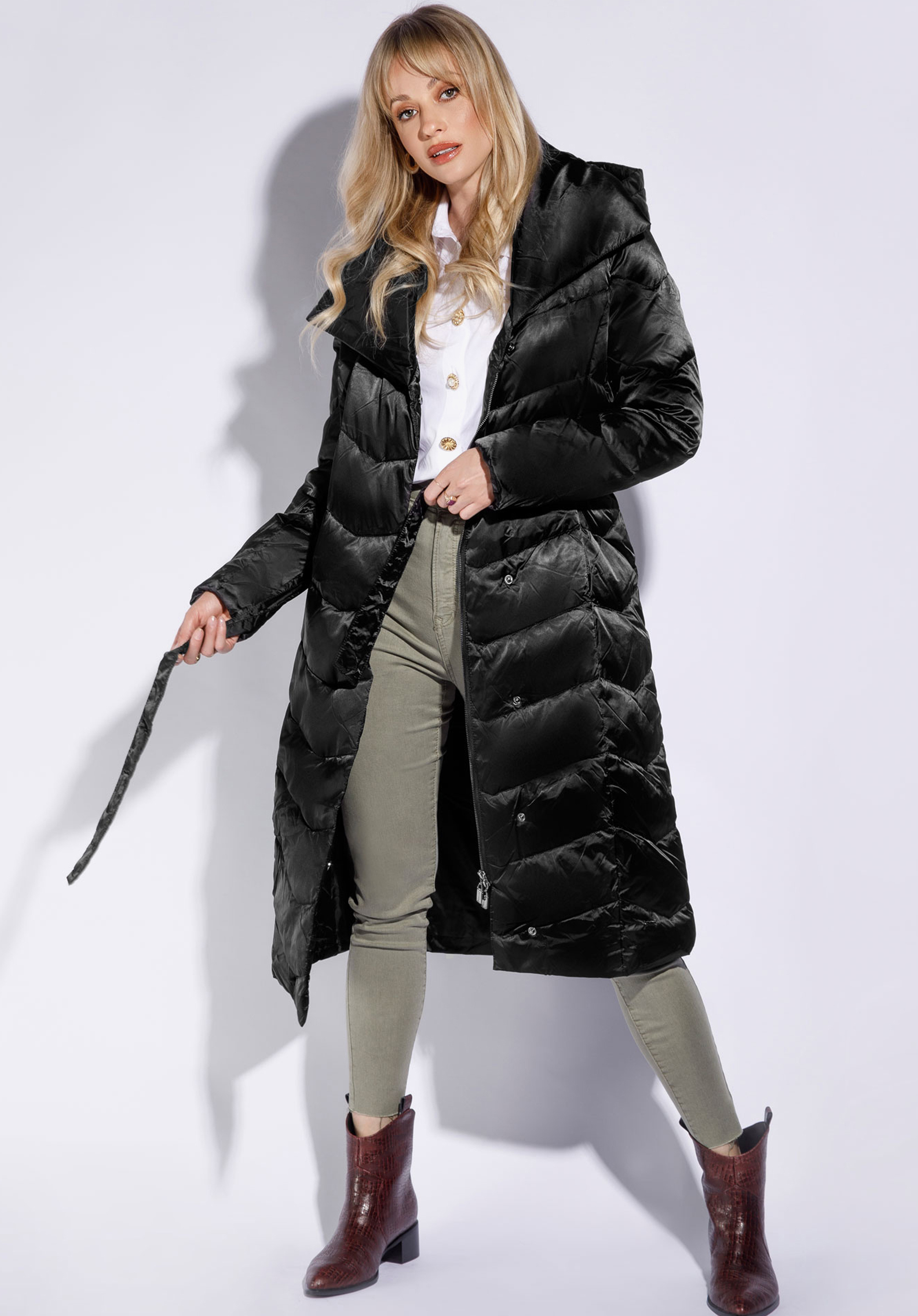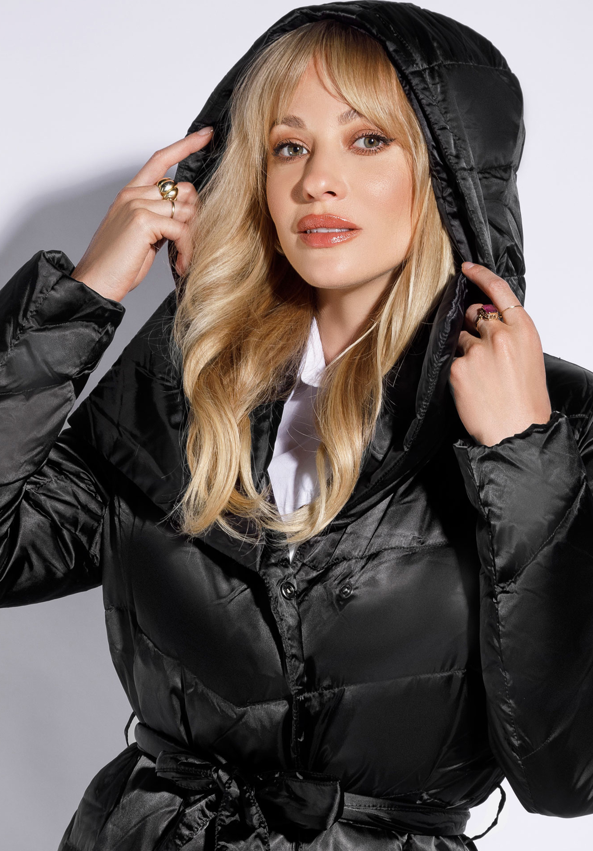 Paltonul cu umplutură ușoară, dar călduroasă; 50% puf, 50% pene izolează împotriva frigului, fără a îngroșa silueta. Gulerul înalt arată foarte elegant și protejează de rafalele de vânt.În plus haina are o glugă profilată, care poate fi detașată.Căptușeala alunecoasă vă asigură că hainele pe care le purtați sub aceasta nu se încrețesc. Paltonulare o ușoară strălucire și cusături în zigzag, care atrag privirea și subțiază optic. Paltonul de damă cu glugă învăluie plăcut silueta, fără a adăuga volum; cu siguranță îl veți alege în zilele răcoroase de toamnă și iarnă. Sfatul nostru: pentru o schimbare, detașați gluga și înfășurați-vă gulerul.