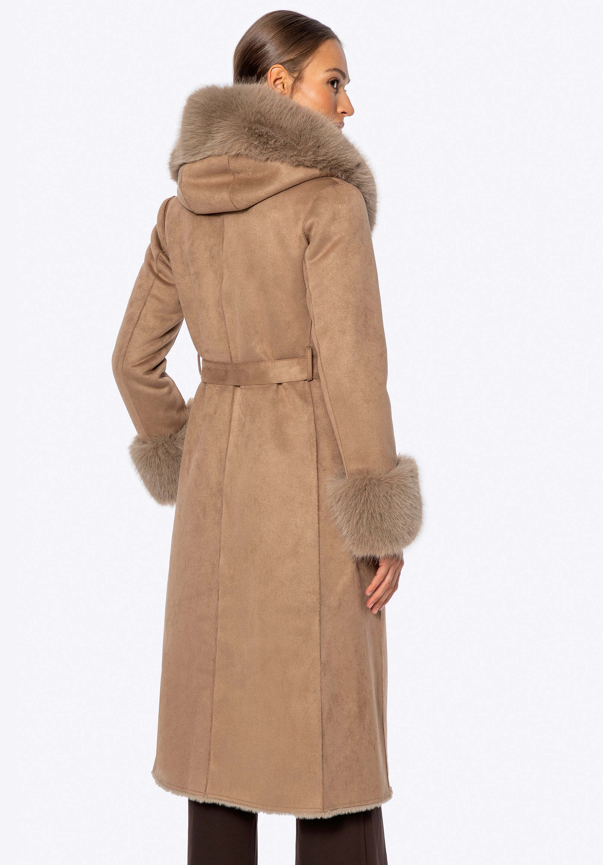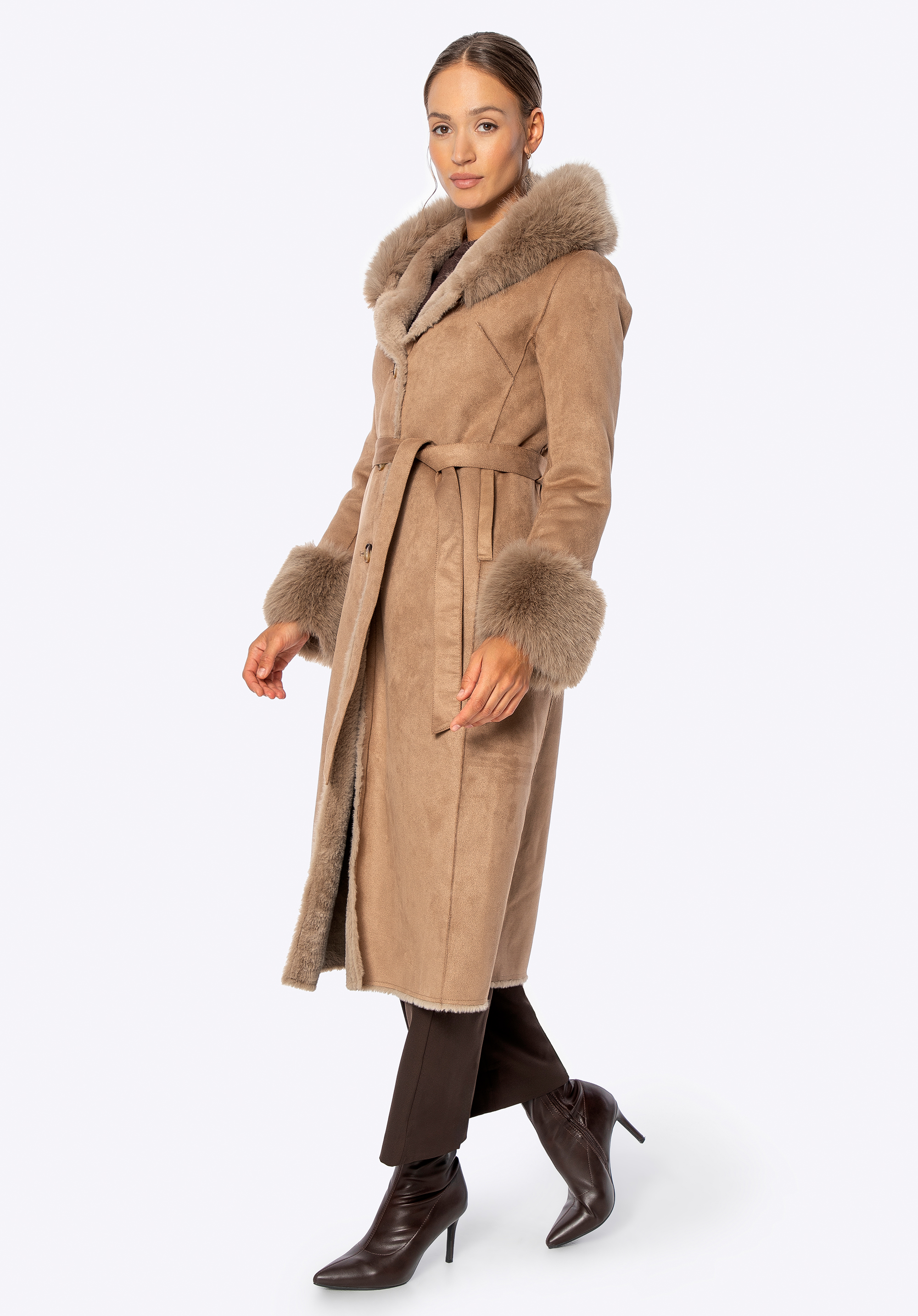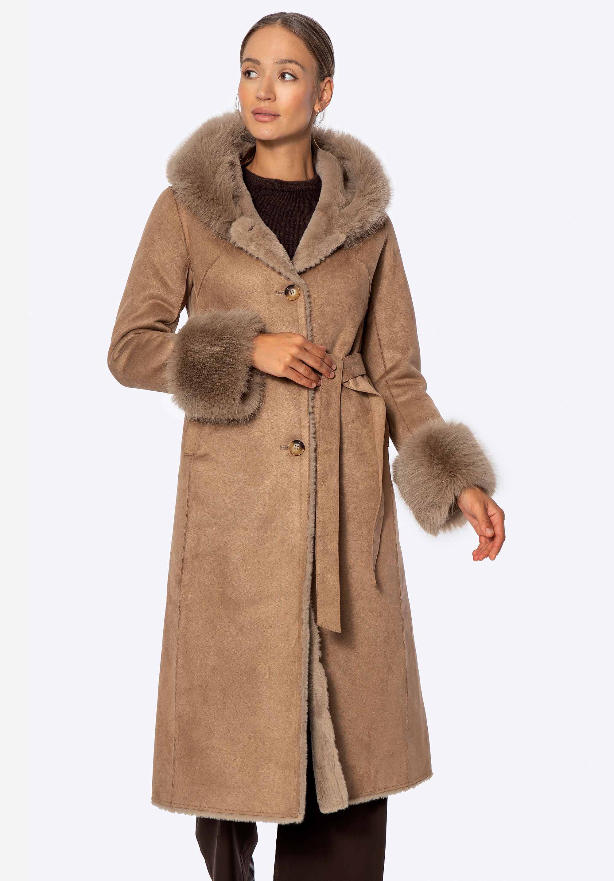 Acest palton este combinația perfectă între eleganța feminină, confort și caracteristici practice pentru zilele mai reci. Croiul lung se drapă frumos peste siluetă, în timp ce detaliile moi din blană artificială adaugă un farmec confortabil. Gluga și manșetele tivite cu blană artificială nu sunt doar atrăgătoare, ci și excepțional de moi la atingere. Fabricat din poliester , paltonul oferă o protecție excelentă împotriva vântului și a frigului, în timp ce căptușeala completă din același material asigură confort pe tot parcursul zilei. Închiderea cu nasturi și o curea legată în talie permit o croială personalizată și flatantă.
