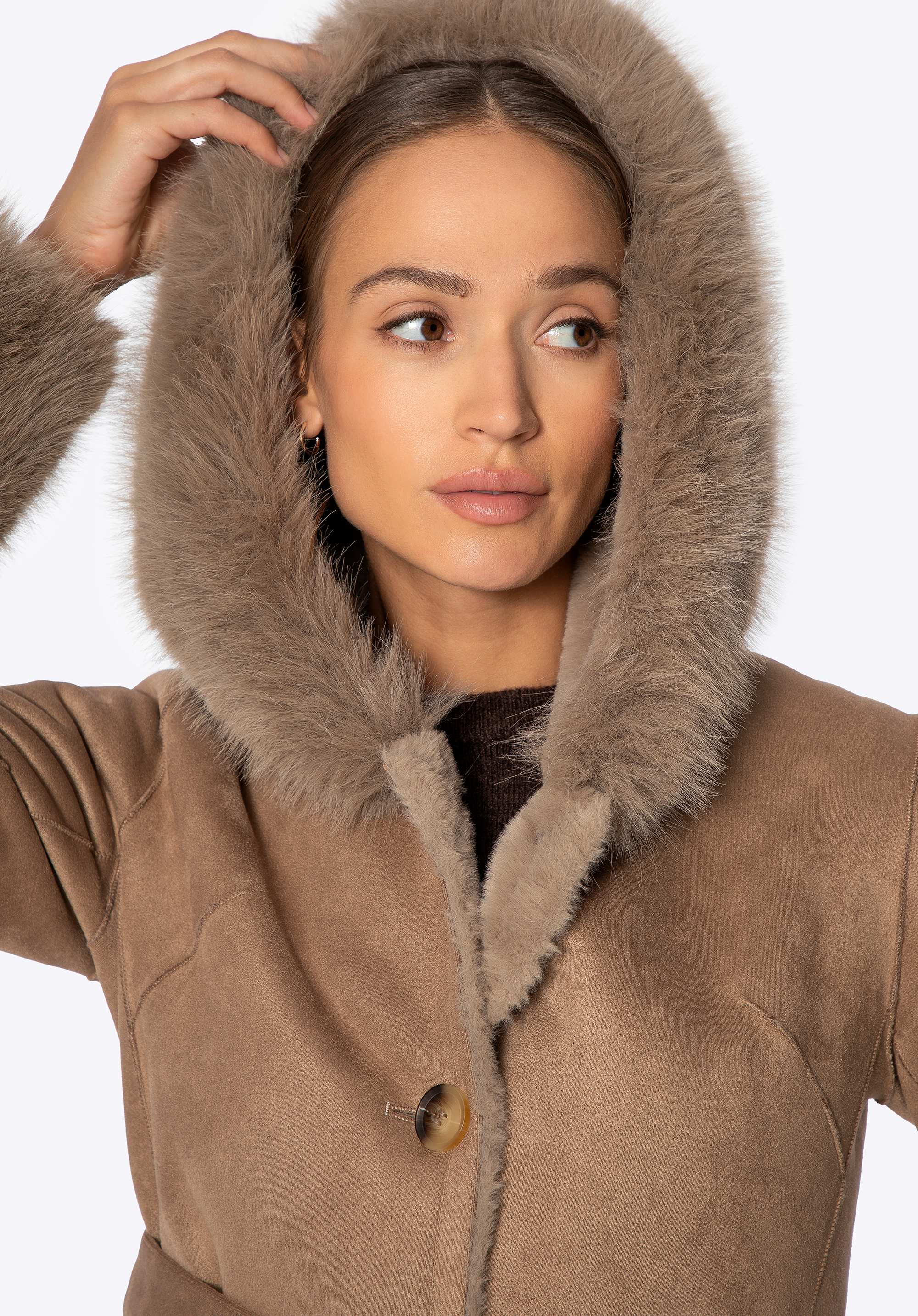 Palton de damă cu glugă din blană artificială – învăluie-te în moliciune și stil