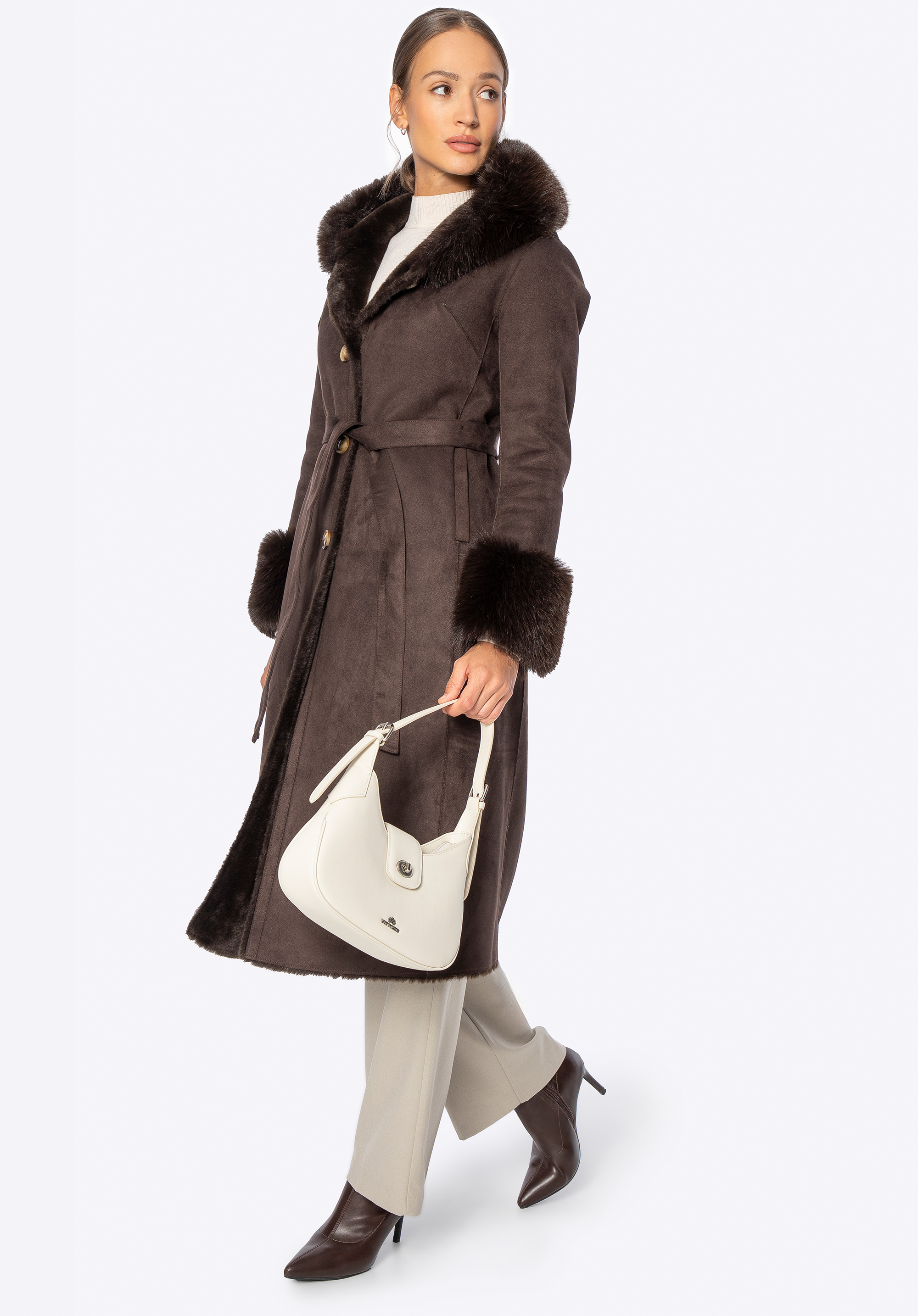 Sfatul nostru: Asortează-l cu cizme înalte și o geantă clasică din piele – gluga din blană artificială creează un aspect deosebit, așa că nu vei avea nevoie de accesorii suplimentare. Pentru o ținută de zi cu zi, optează pentru niște botine călduroase și o căciulă de lână – acest palton se va adapta fără efort stilului tău.