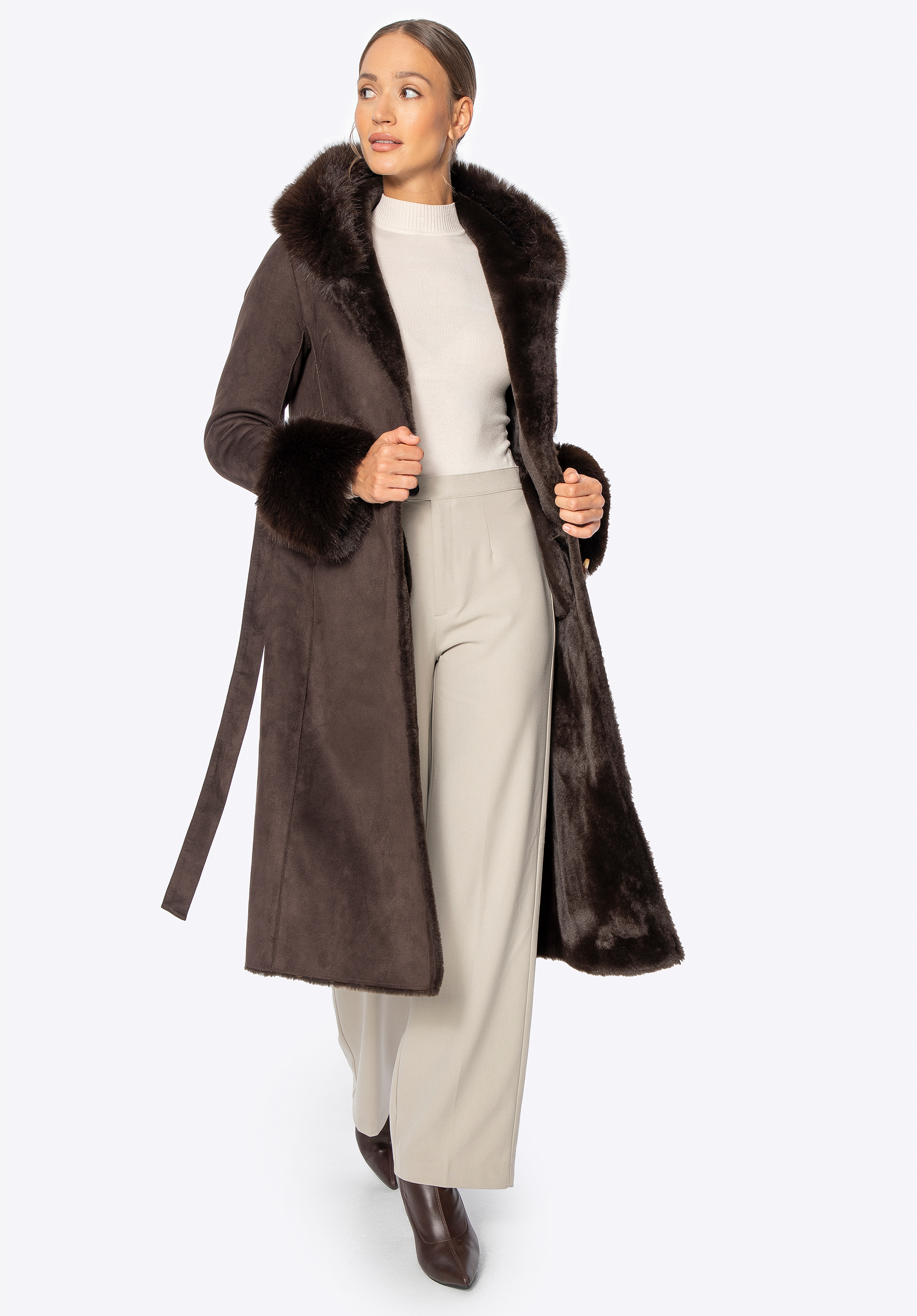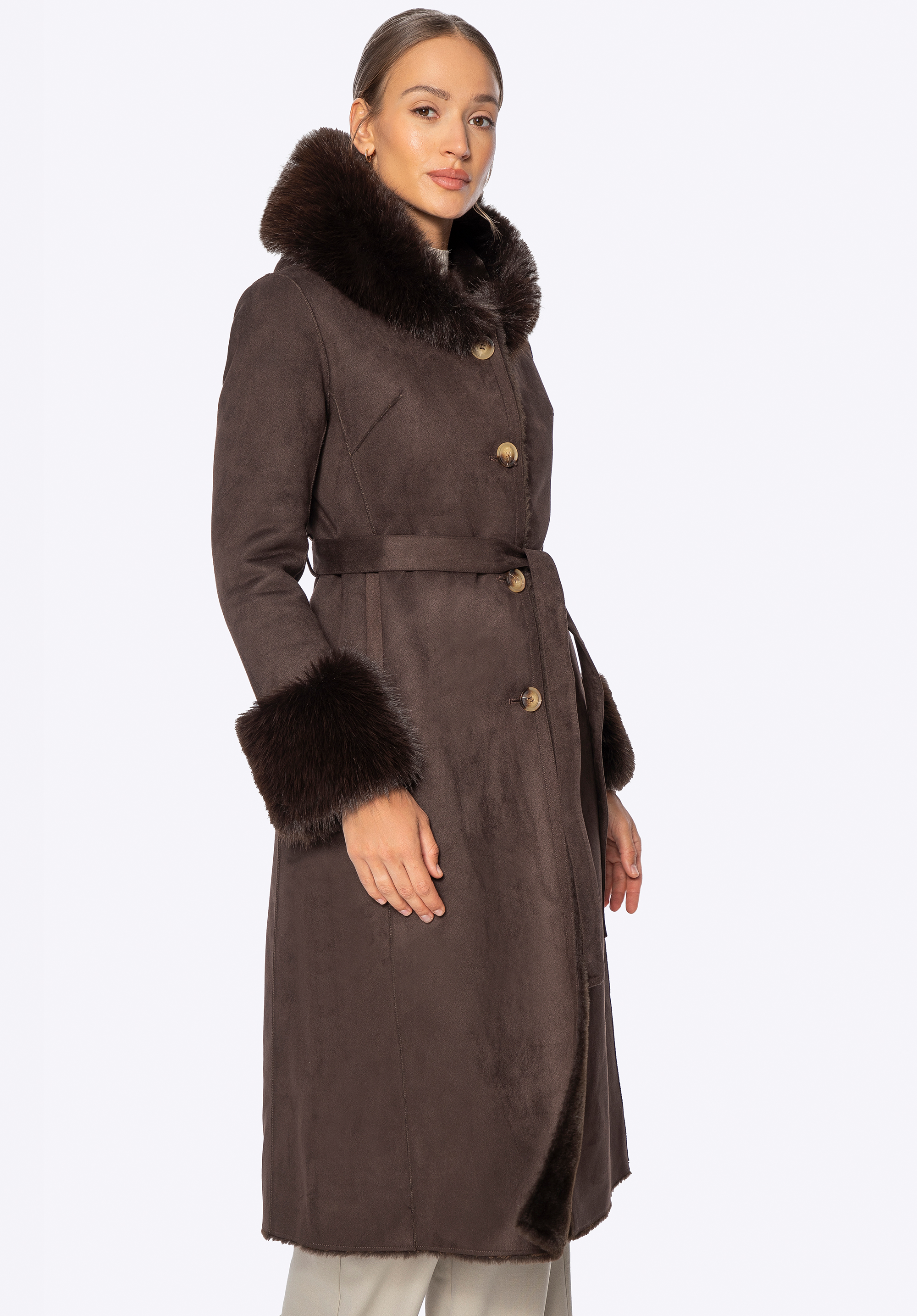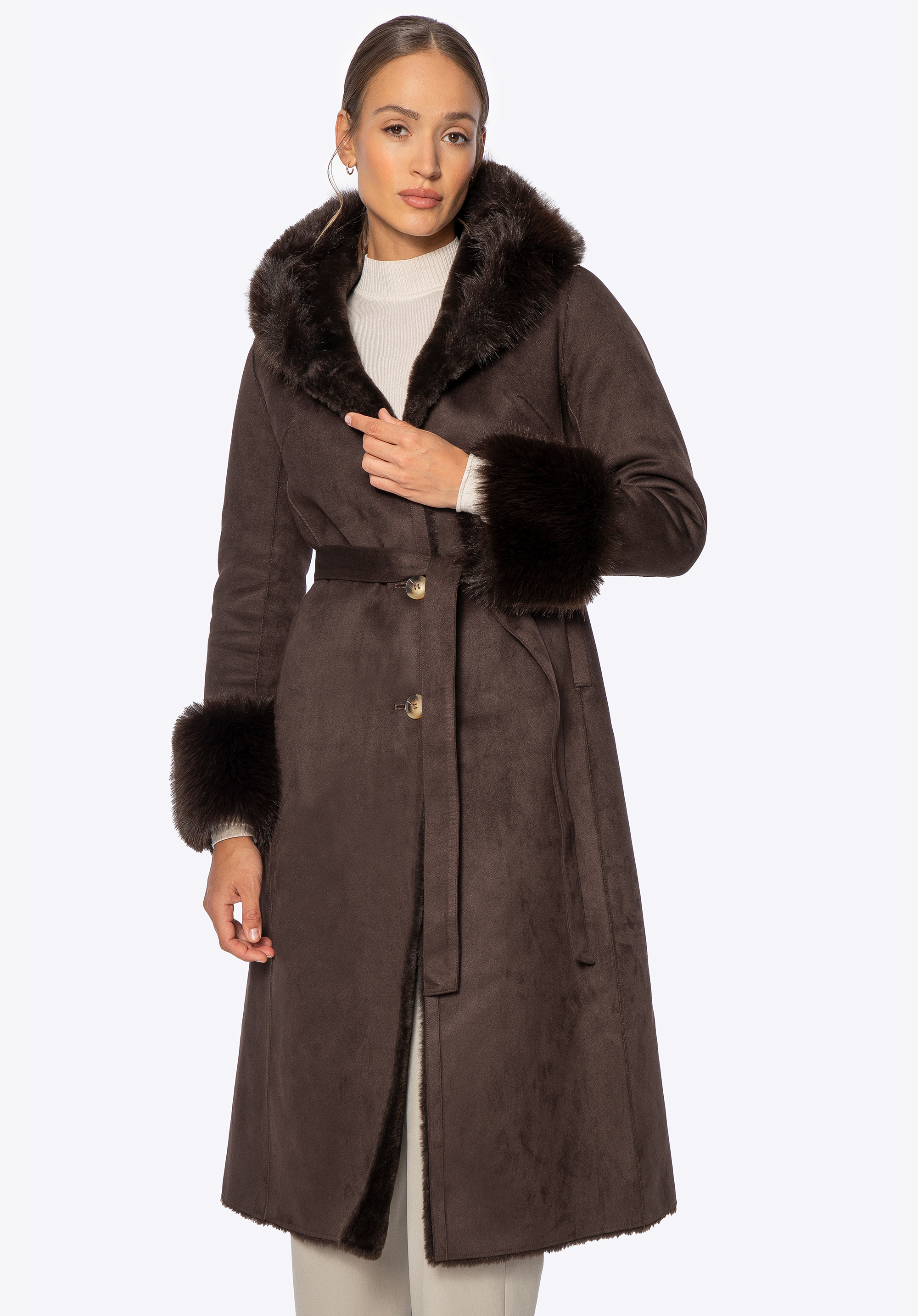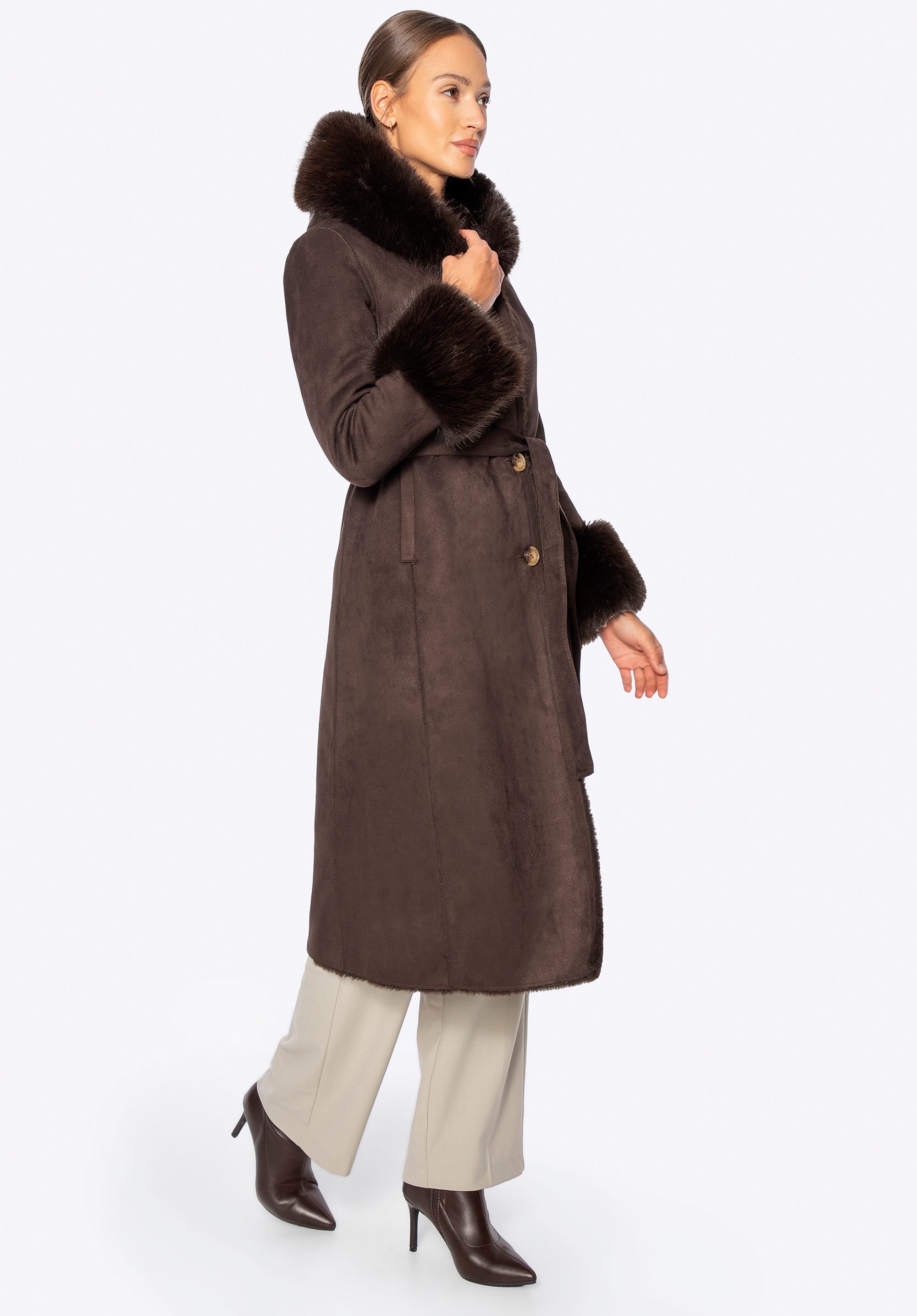 Acest palton este combinația perfectă între eleganța feminină, confort și caracteristici practice pentru zilele mai reci. Croiul lung se drapă frumos peste siluetă, în timp ce detaliile moi din blană artificială adaugă un farmec confortabil. Gluga și manșetele tivite cu blană artificială nu sunt doar atrăgătoare, ci și excepțional de moi la atingere. Fabricat din poliester , paltonul oferă o protecție excelentă împotriva vântului și a frigului, în timp ce căptușeala completă din același material asigură confort pe tot parcursul zilei. Închiderea cu nasturi și o curea legată în talie permit o croială personalizată și flatantă.
