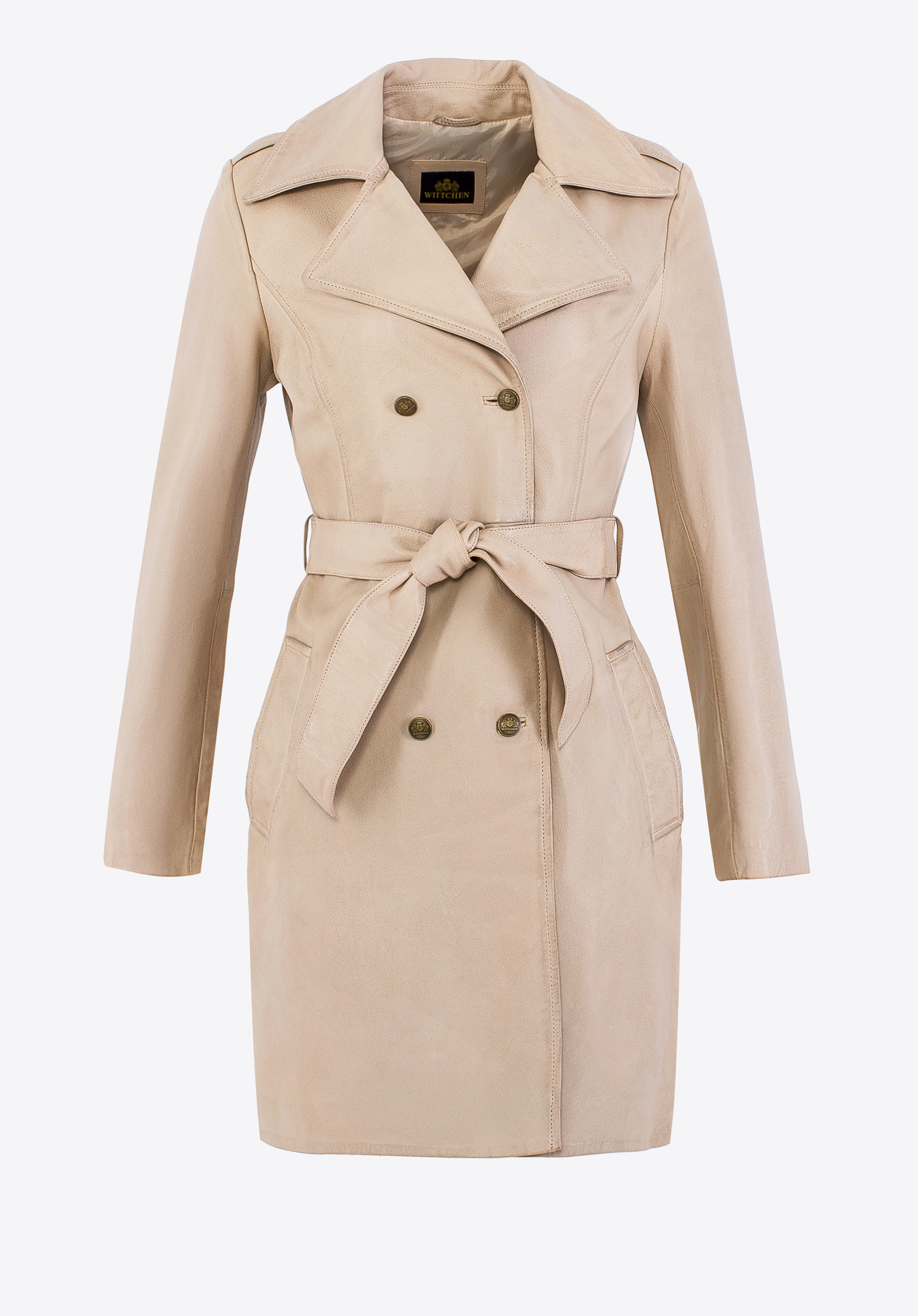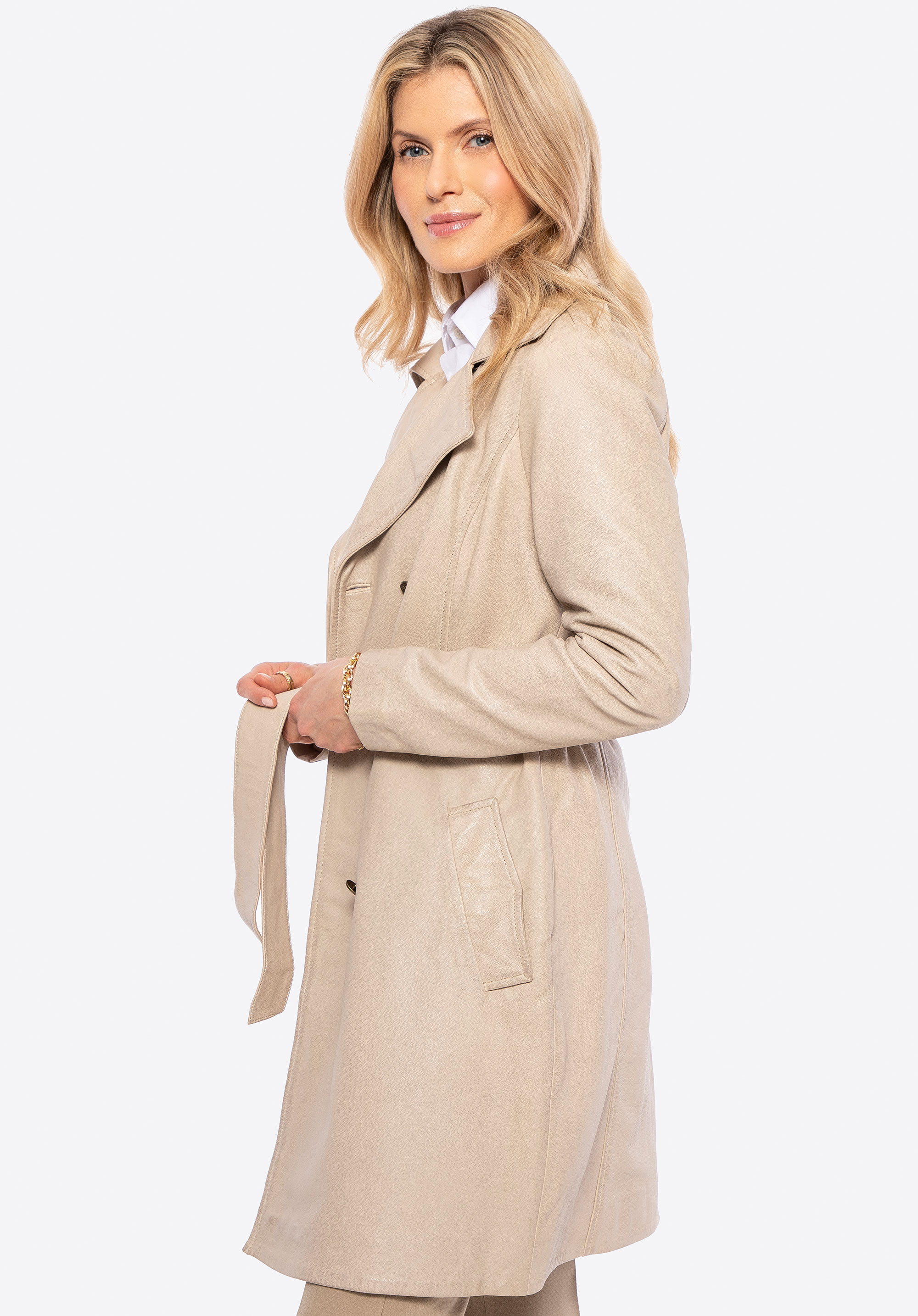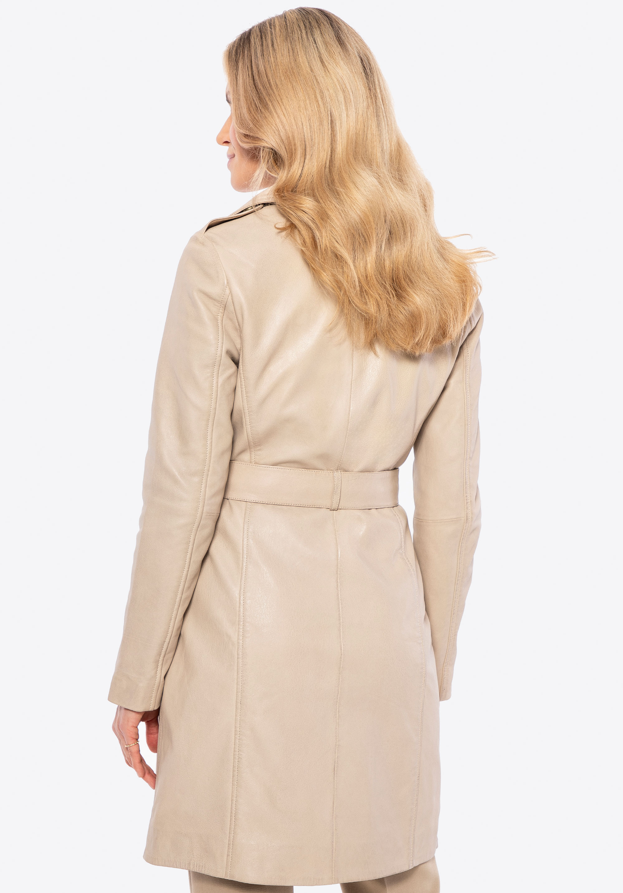 Când clasicul întâlnește caracterul modern, rezultatul este un design care nu poate fi trecut cu indiferență. Această haină unică din piele naturală de oaie este o combinație de eleganță atemporală și design distinctiv. Nasturii tip logo subliniază exclusivitatea modelului, în timp ce gulerul inversat adaugă o notă de șic. Croiala subțire și centura cu cureaua în talie modelează frumos silueta, subliniind curbele feminine.