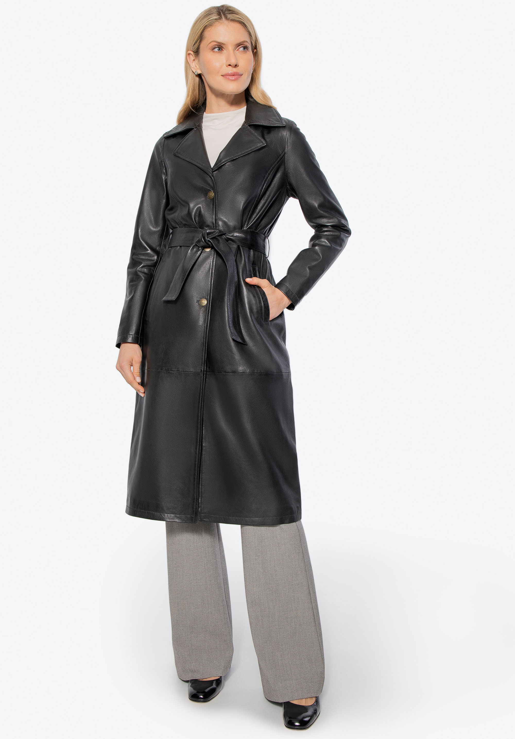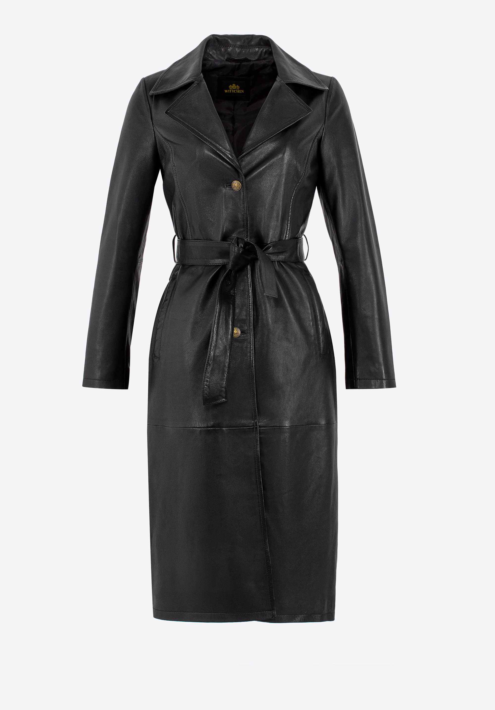 Această haină lungă din piele de oaie este simbolul stilului și clasei atemporale. Potrivirea pe măsură accentuează talia, iar centura asigură o potrivire perfectă. Un guler clasic , nasturi metalici cu sigla brandului și buzunare verticale subtile creează un aspect armonios, radiind rafinament. Aceasta nu este doar o haină – este o investiție în stil care nu se demodează niciodată.