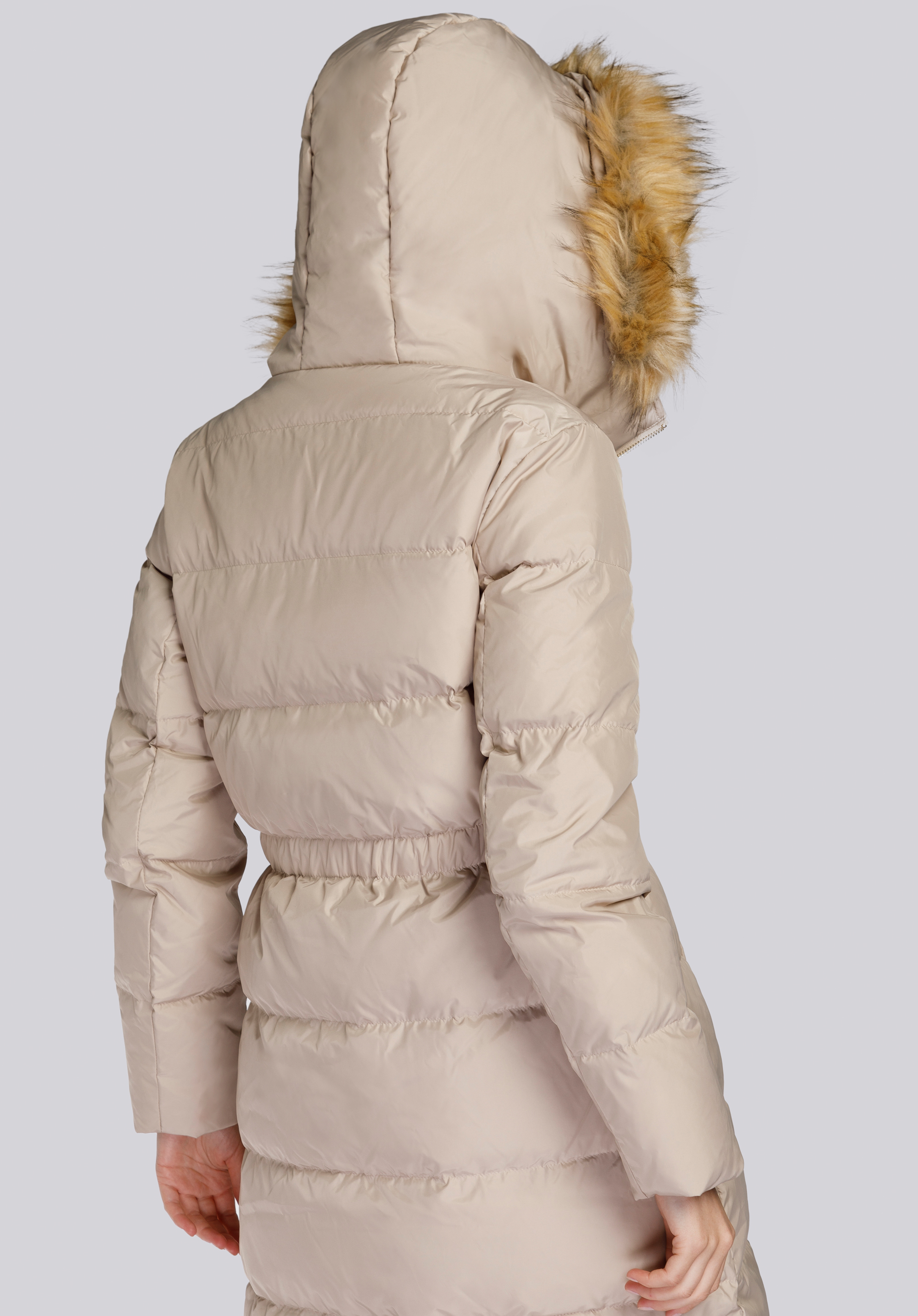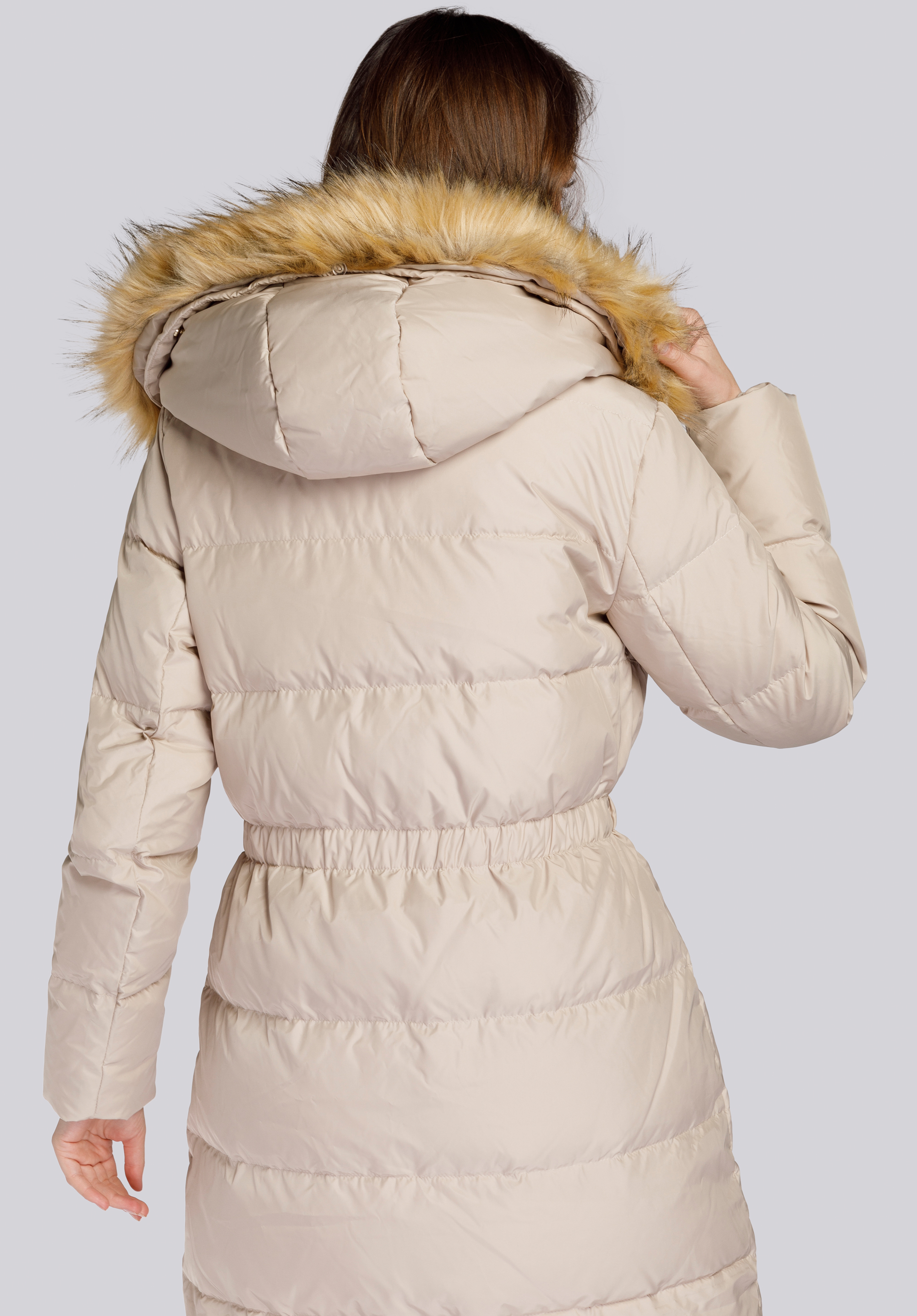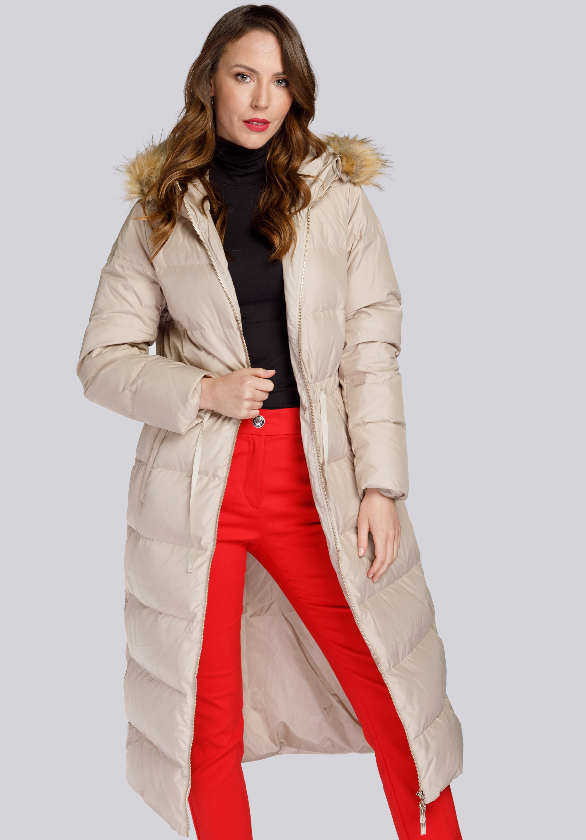 Acest model clasic de haină de iarnă până la jumătatea gambei in loc de curea, are un cordon si o panglica in talie, care contureaza frumos proportiile siluetei.Designul coconului te înfășoară plăcut atât toamna, cât și iarna, adaptându-se bine corpului - așa că este atât o haina de toamna cât și de iarna. Umplutura naturală din pene și puf izolează împotriva frigului asigurând în același timp o bună circulație a aerului.Din această haină de puf se poate desprinde blana ecologica pentru a-i schimba aspectul (sau pentru spalare).Cu învelișul din poliester durabil, puteți îndepărta cu ușurință murdăria minoră. Paltonul matlasat de damă cu cordon în talie este o soluție perfectă pentru a arăta îngrijit și elegant chiar și la temperaturi mici.