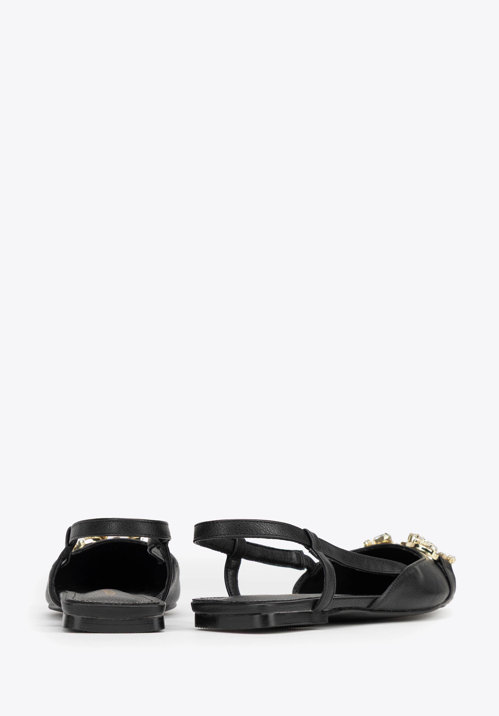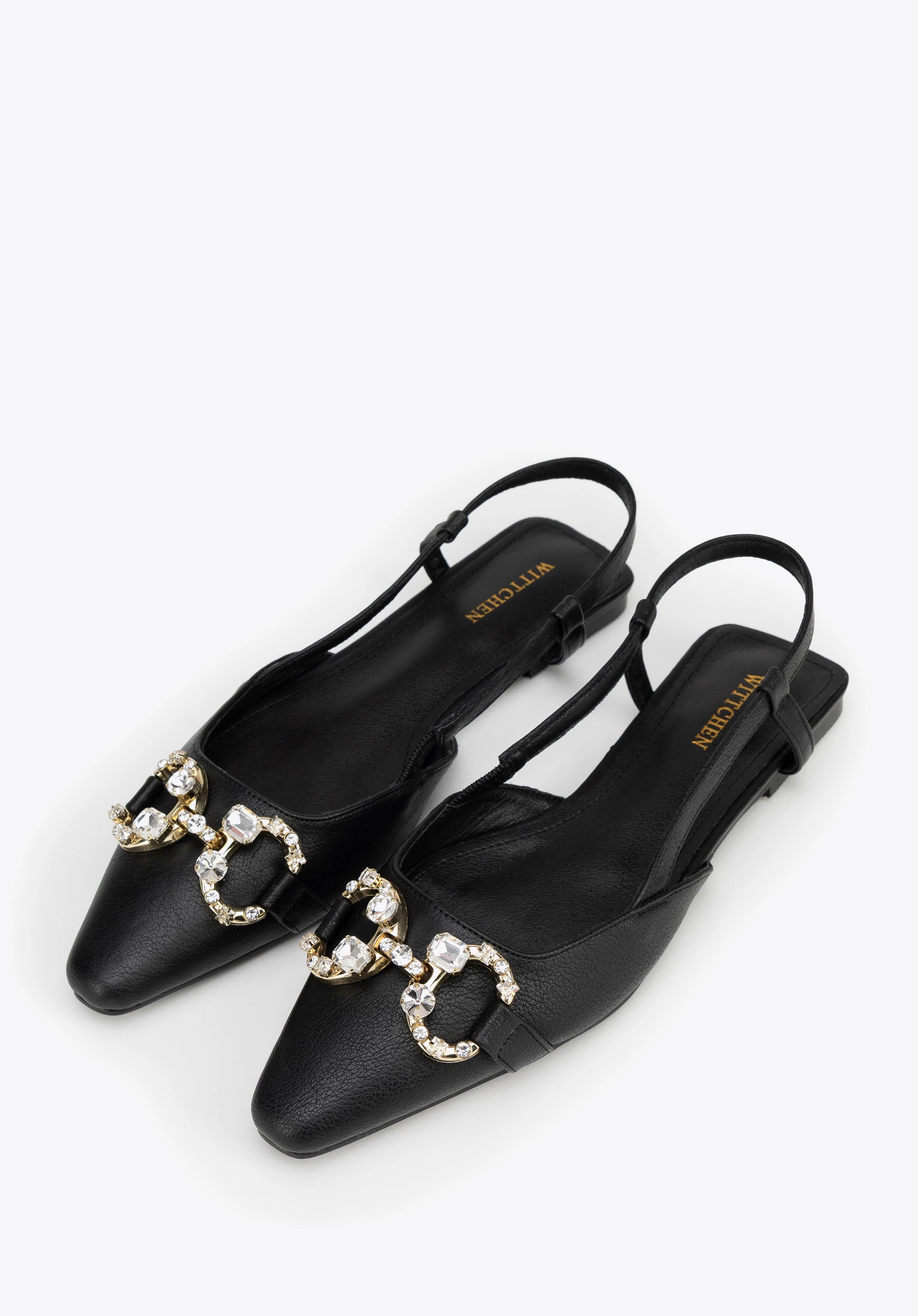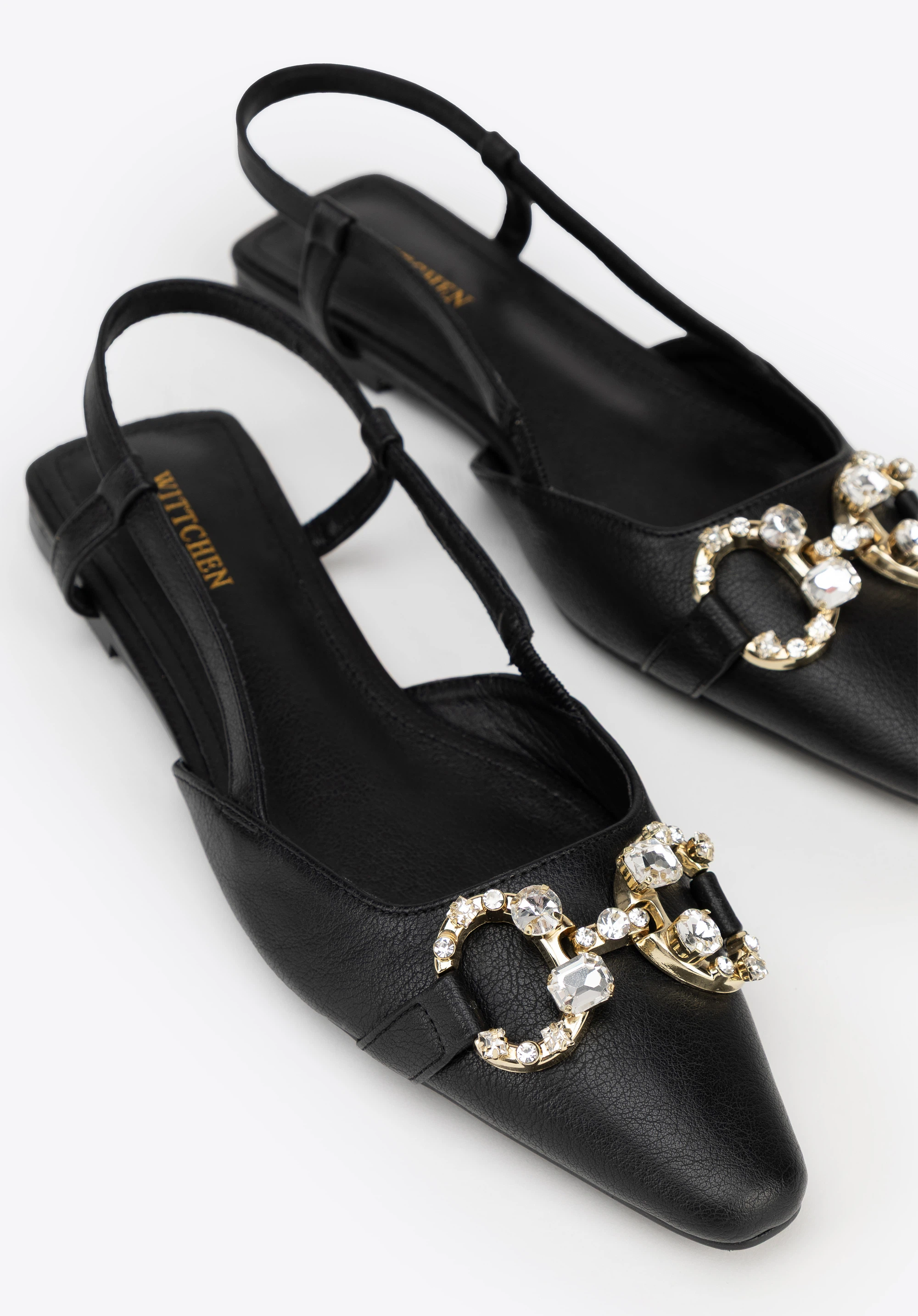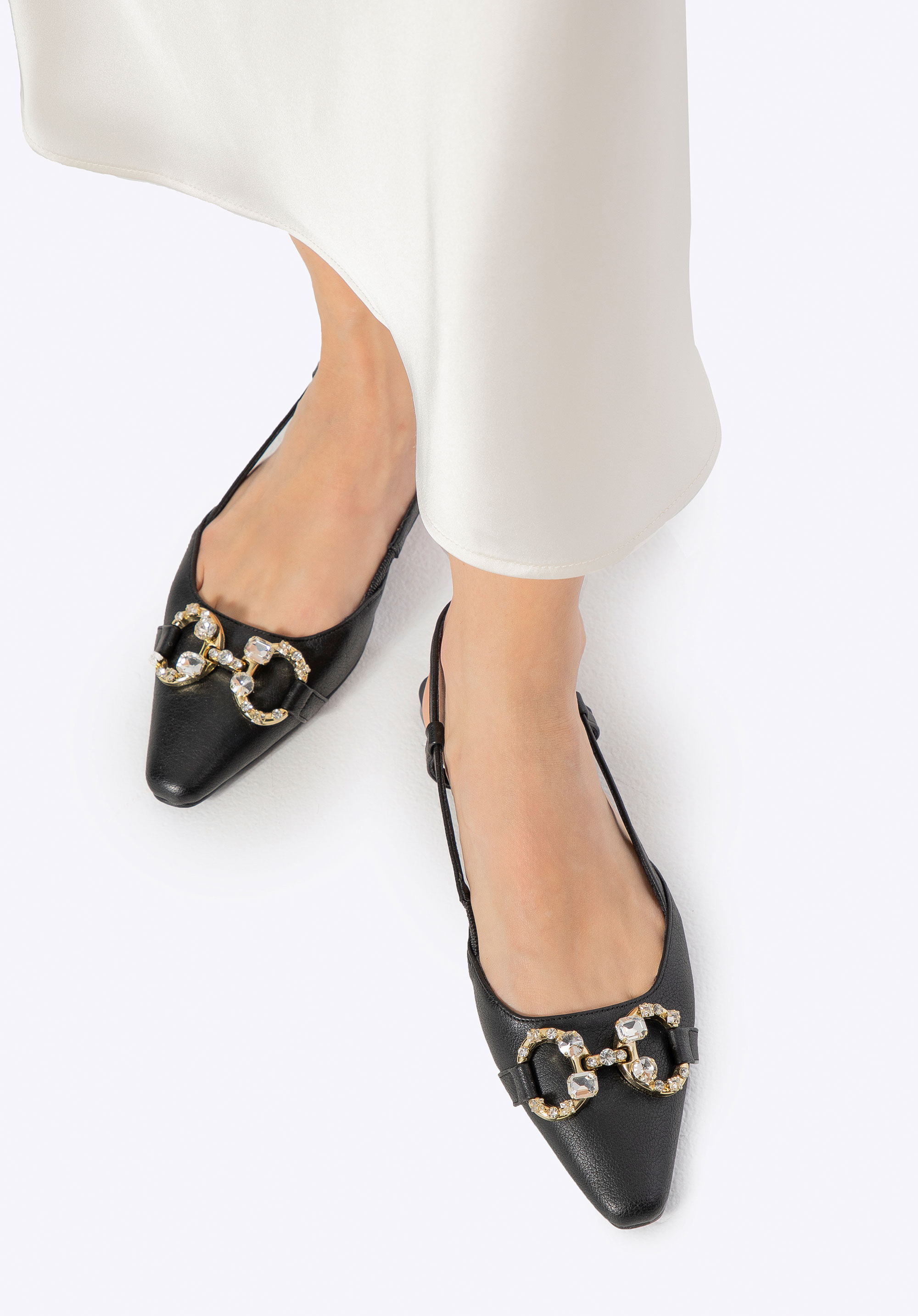 Acești pantofi sunt combinația ideală între stil și confort, completând perfect multe dintre ținutele tale. Confecționați din piele ecologică, impresionează prin forma lor subtilă, dar de efect. Tocul plat asigură confort pe tot parcursul zilei, iar vârful ascuțit le conferă un aer feminin. Călcâiul decupat și bareta la nivelul gleznei, decorată cu un detaliu elegant tip bijuterie, atrag privirile și oferă încălțărilor un aspect luxos.