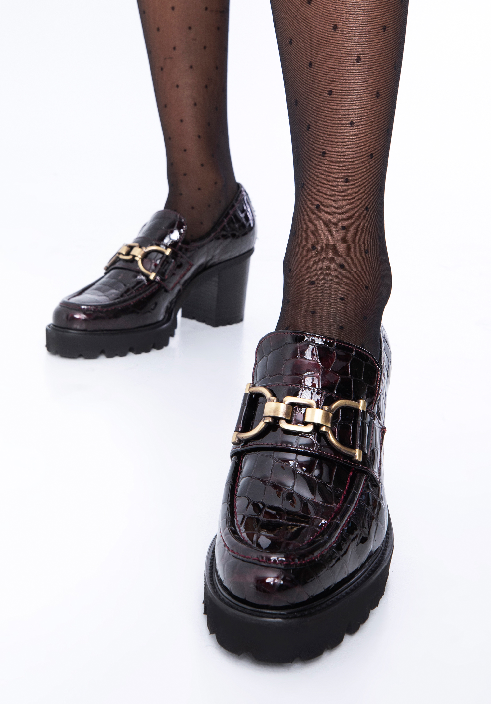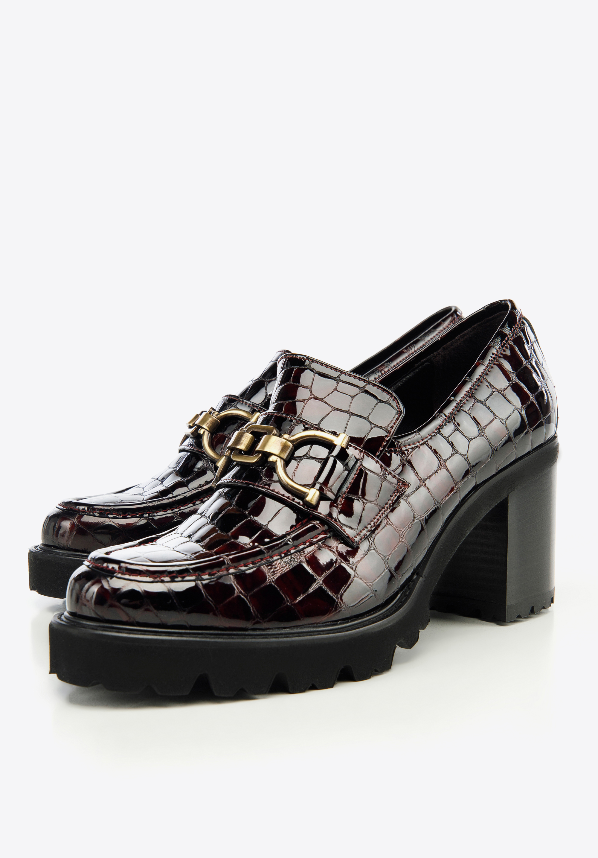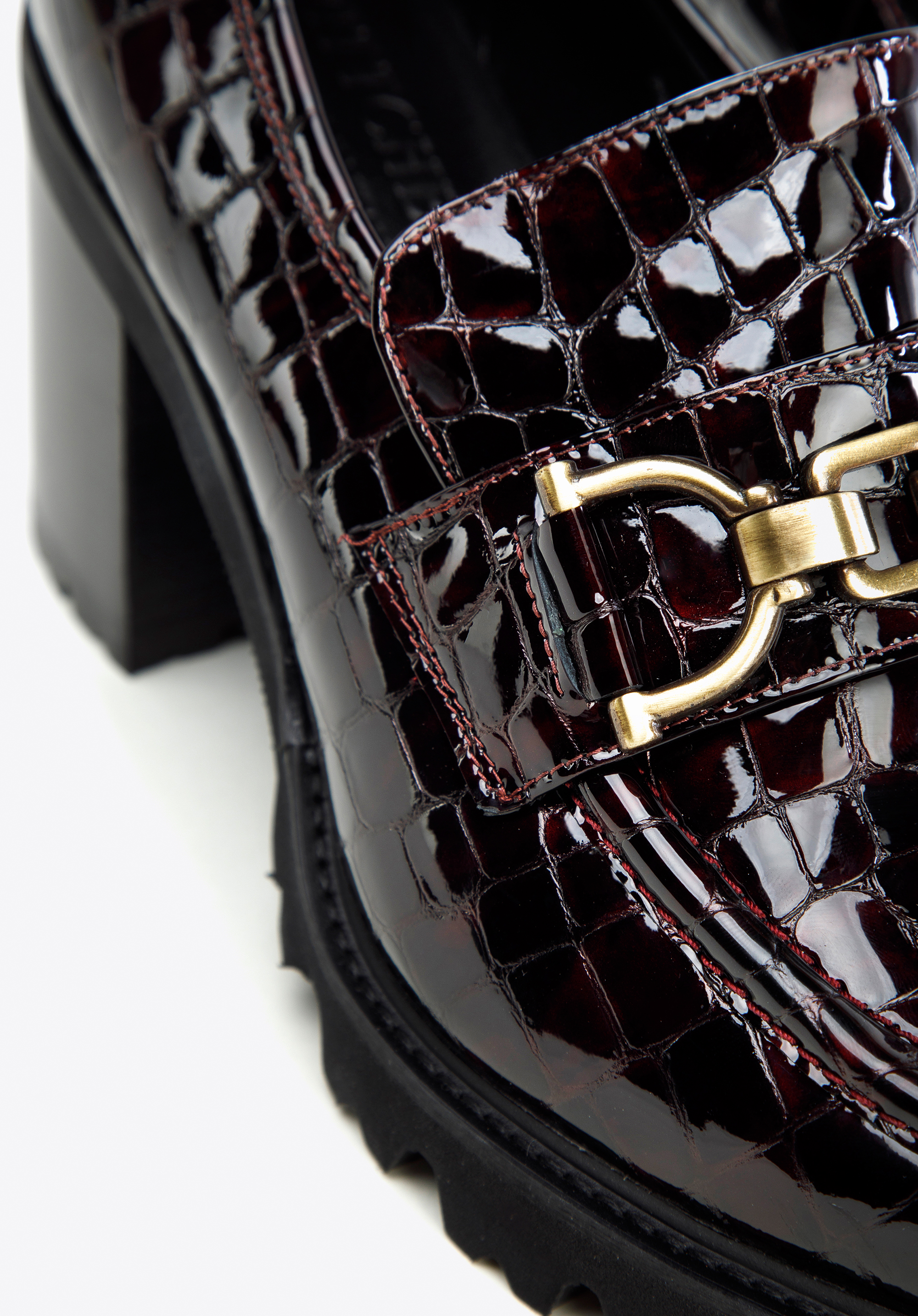 Pantofi piele întoarsă din piele de crocodil cu cataramă pe toc înalt grena