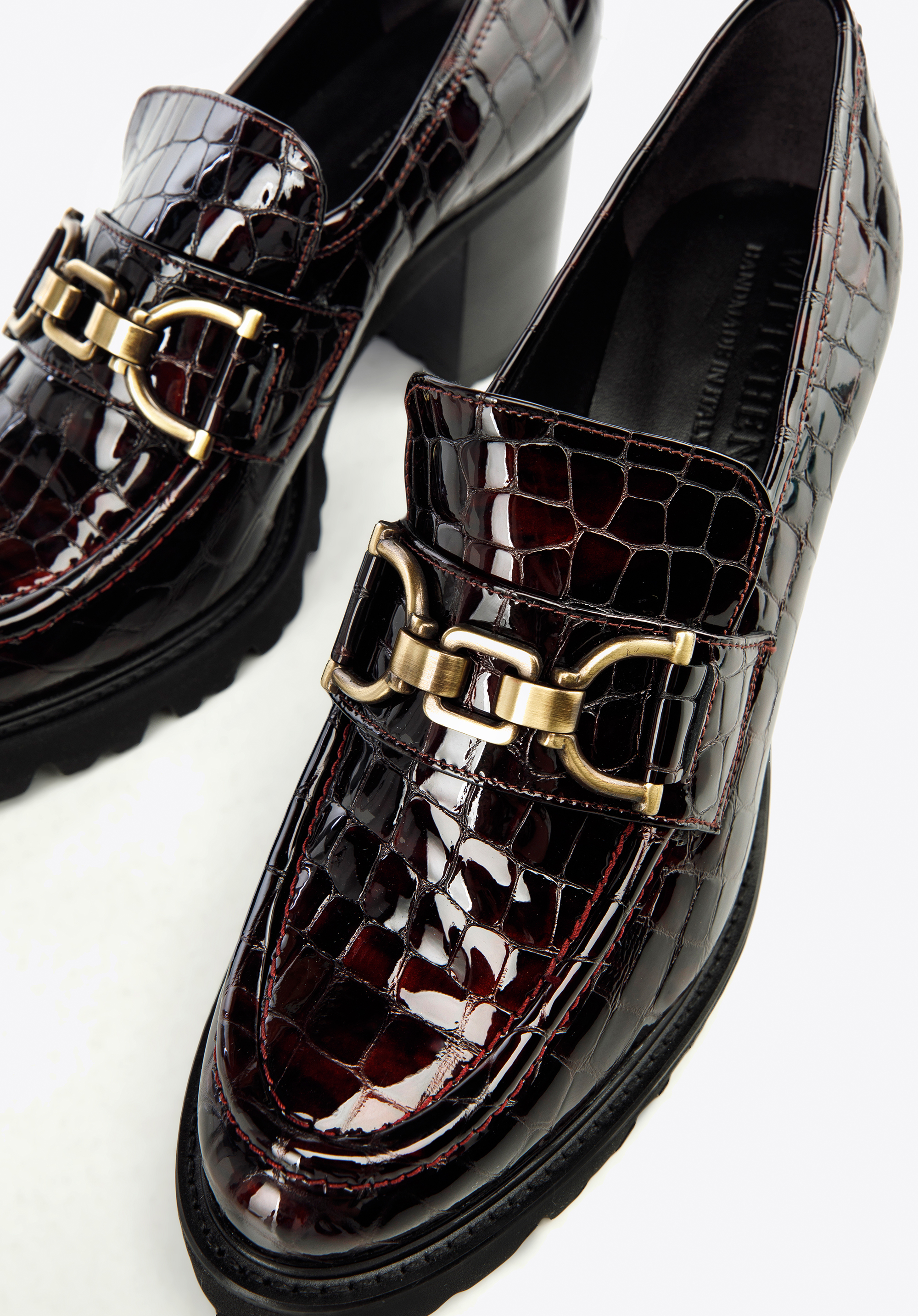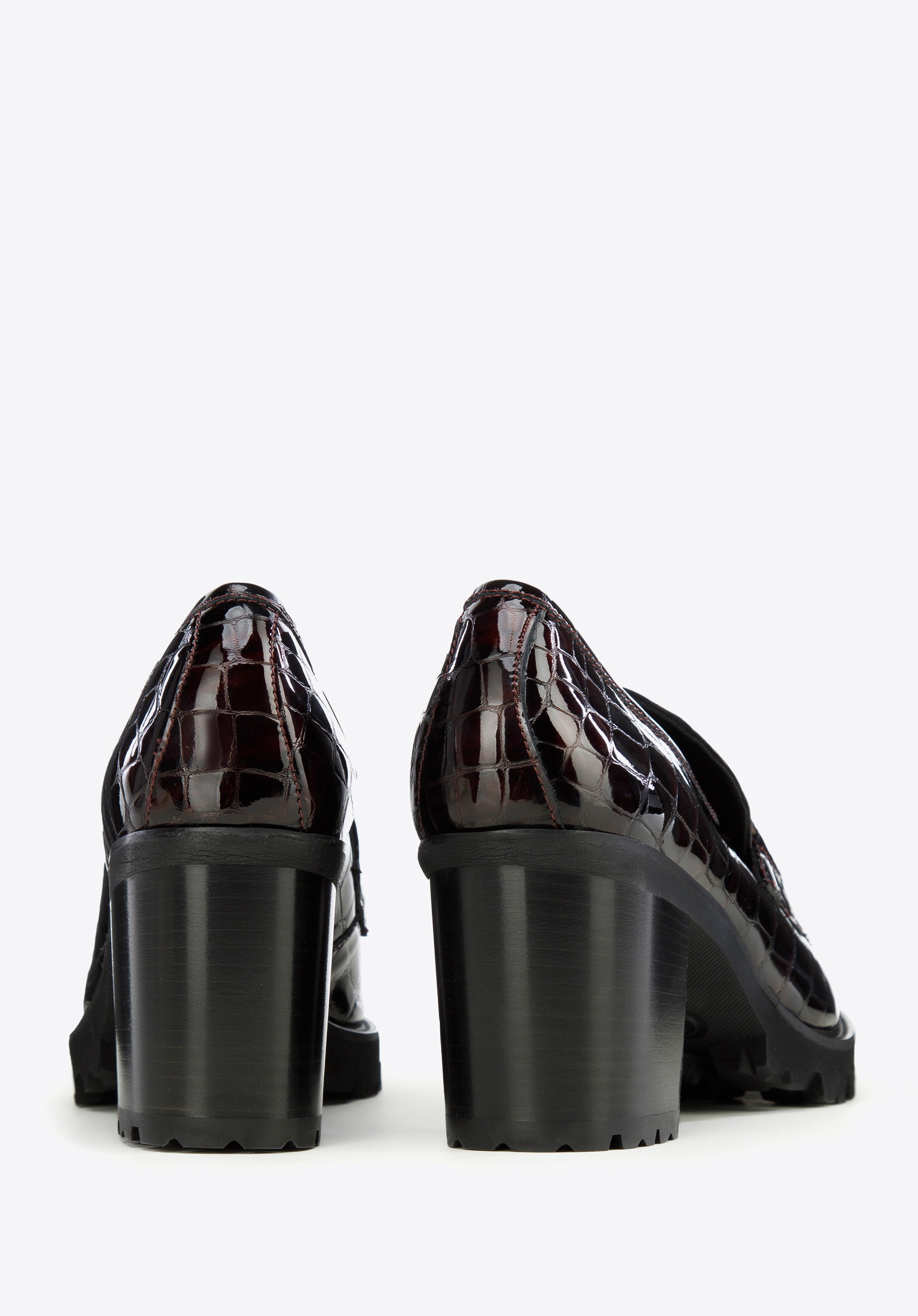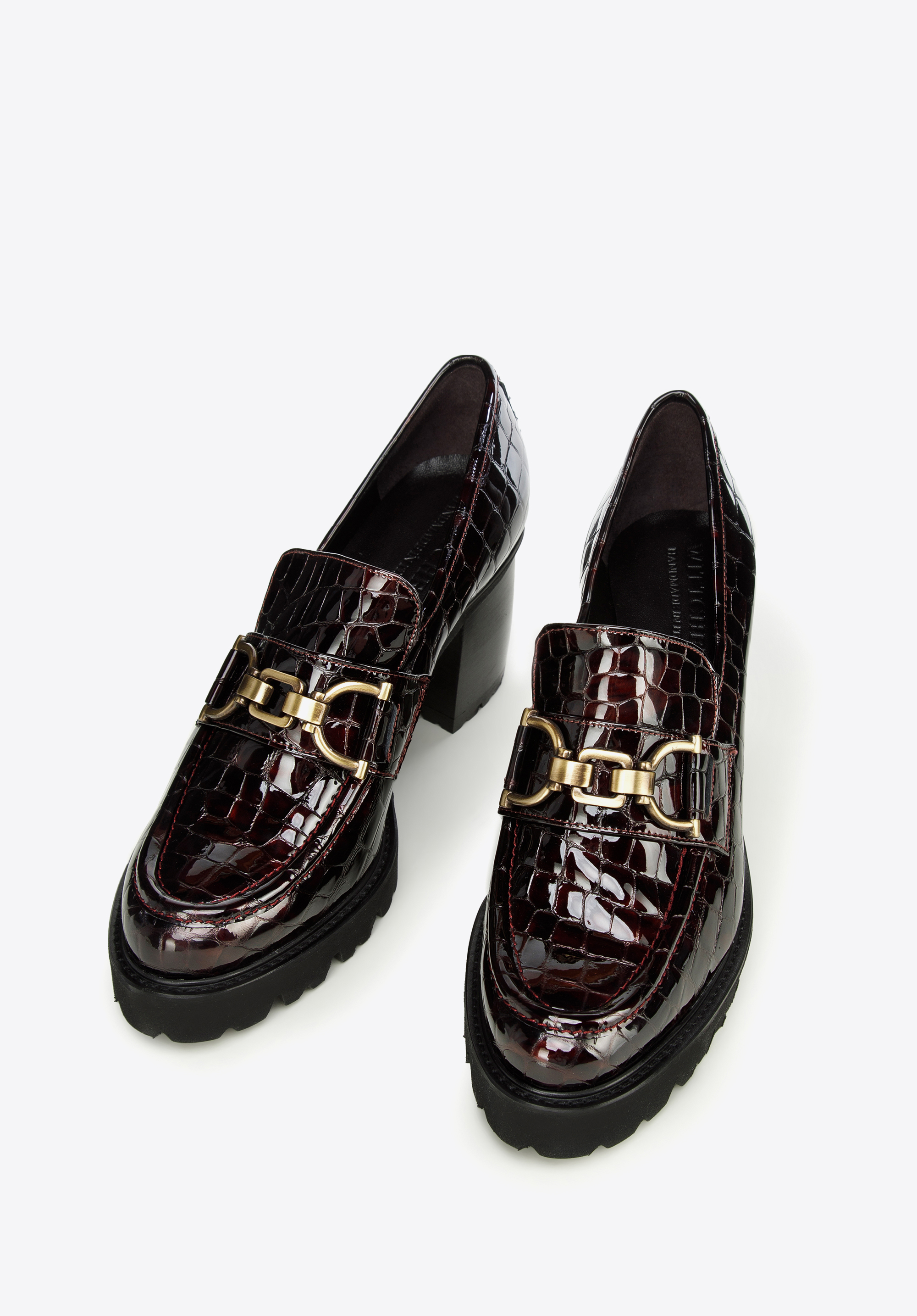 Pantofi piele întoarsă din piele de crocodil cu cataramă pe toc înalt grena