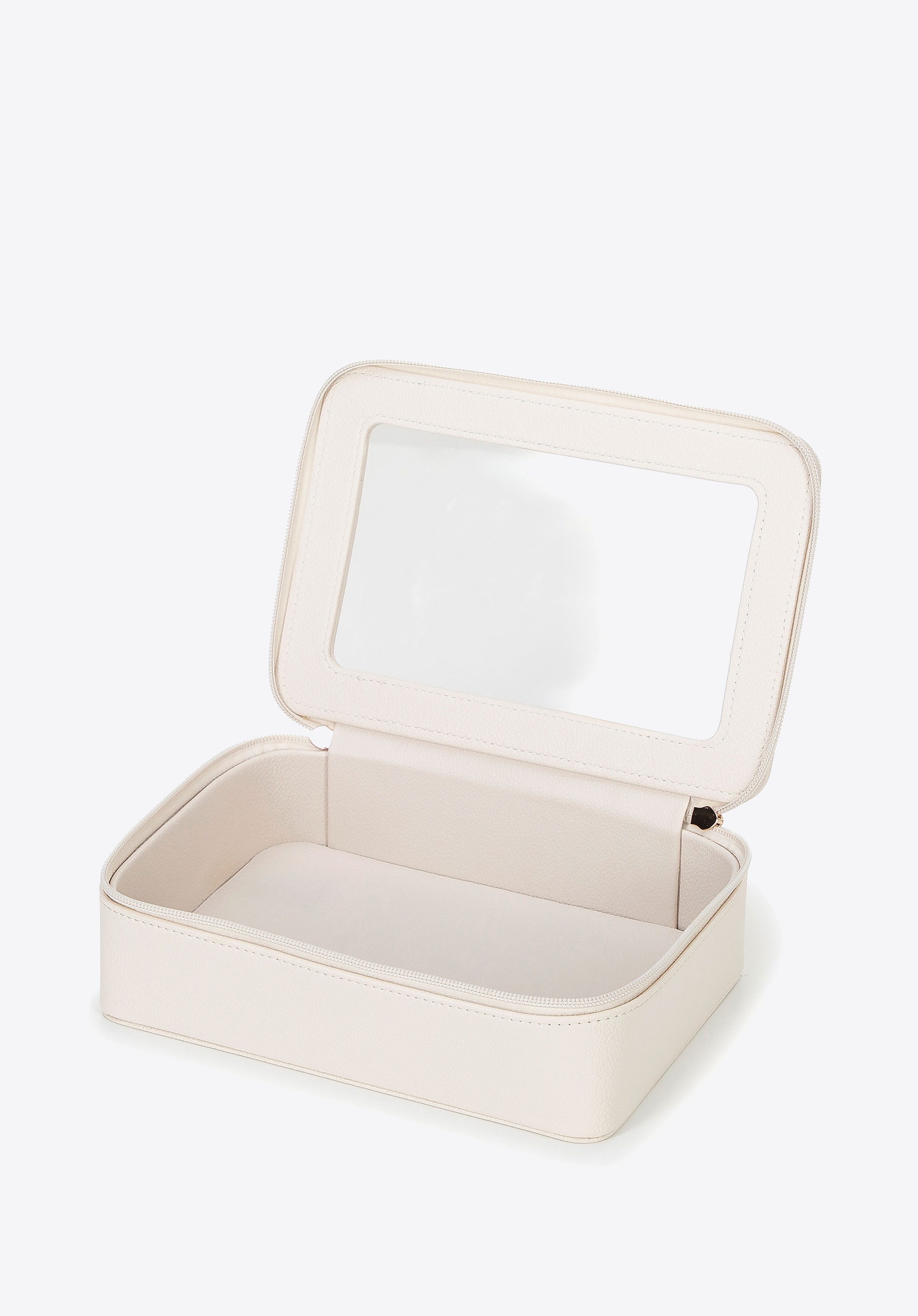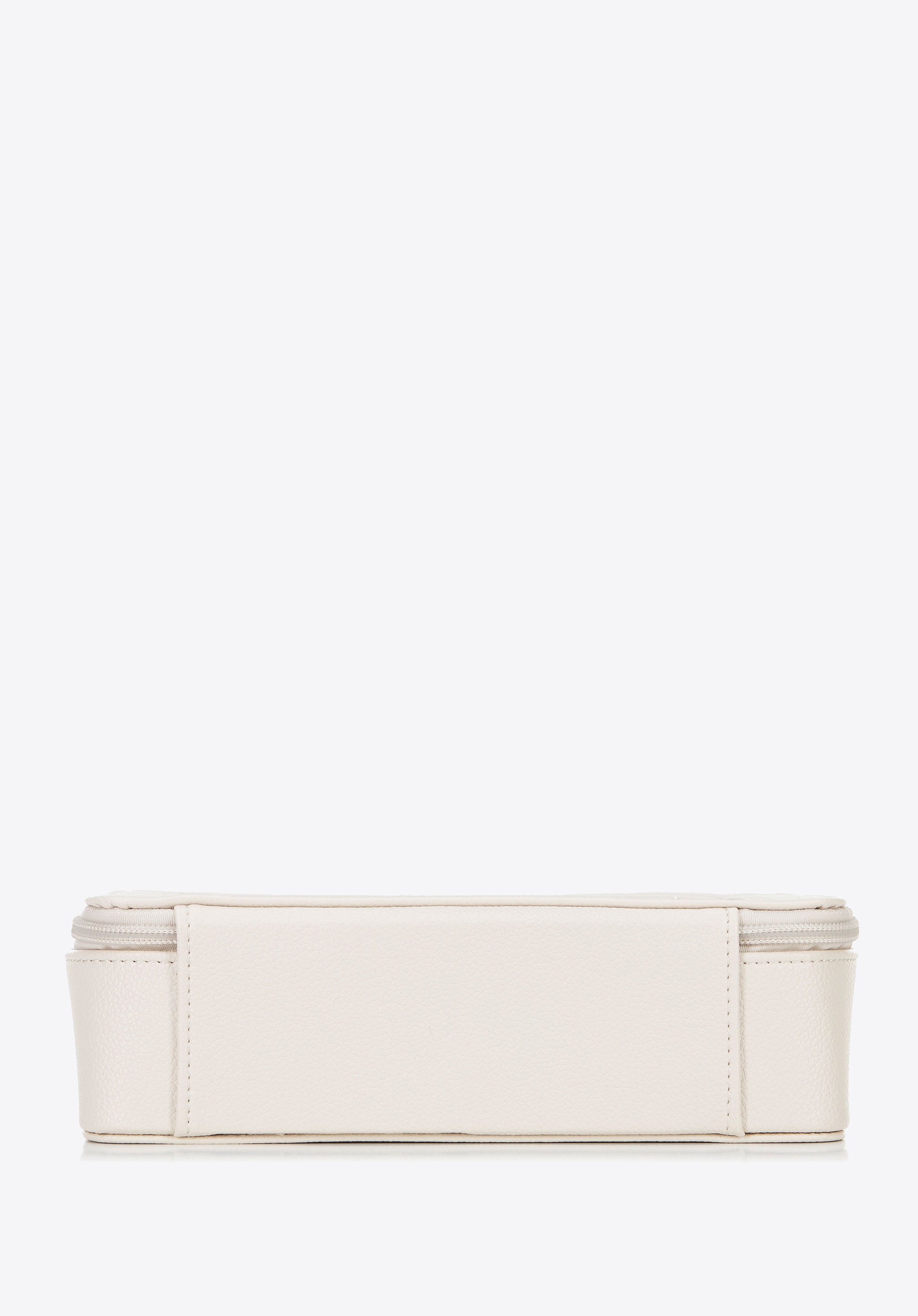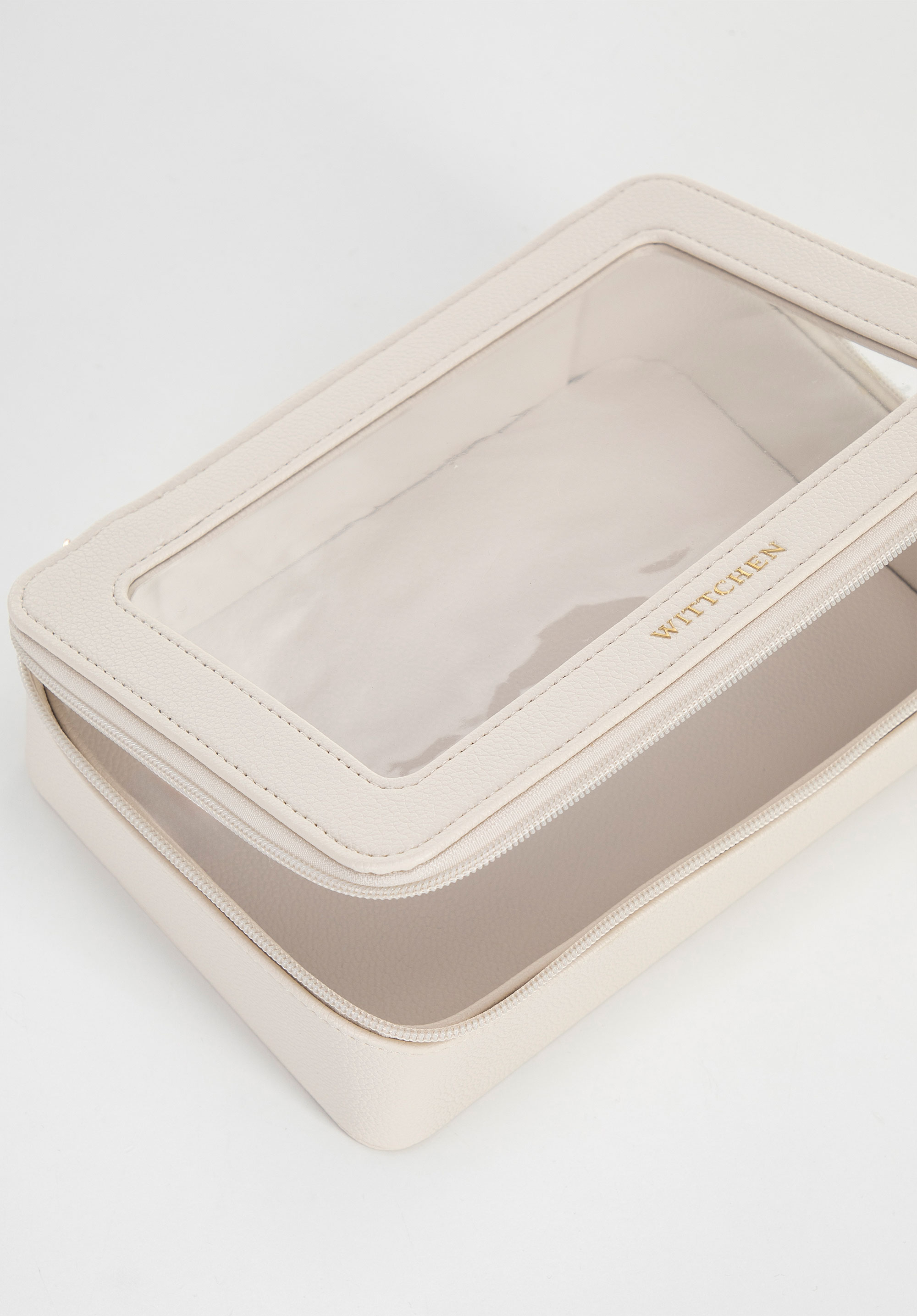 Acest portfard dreptunghiular, cu formă boxy, este o soluție practică și stilată pentru organizarea cosmeticelor și accesoriilor tale. Realizat din piele ecologică, impresionează prin aspectul elegant și ușurința în întreținere. Se deschide printr-un fermoar poziționat în partea superioară, oferind acces rapid la conținut. Capacul transparent îți permite să vezi imediat ce se află în interior – perfect pentru uz zilnic și în călătorii.