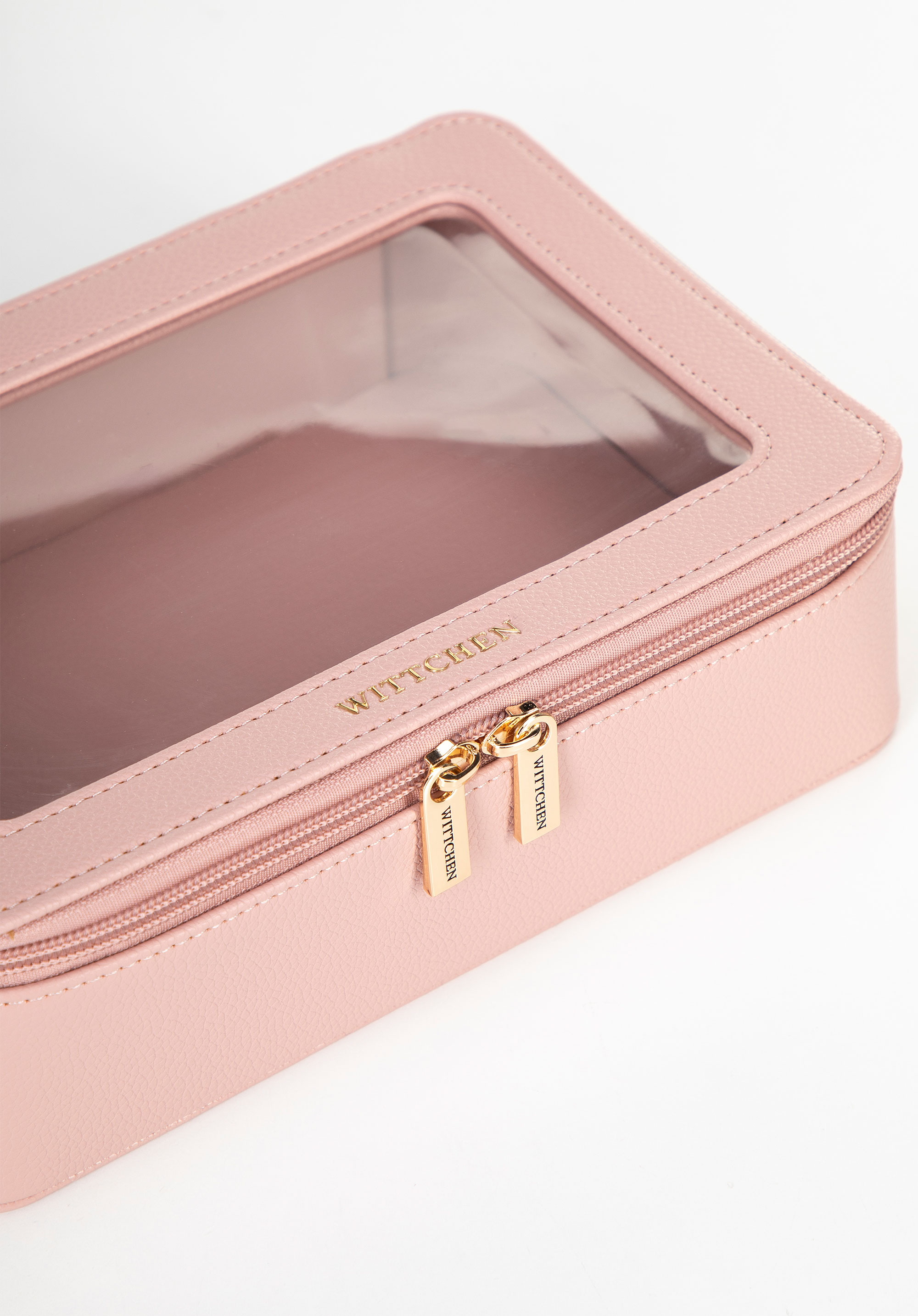 Acest portfard dreptunghiular, cu formă boxy, este o soluție practică și stilată pentru organizarea cosmeticelor și accesoriilor tale. Realizat din piele ecologică, impresionează prin aspectul elegant și ușurința în întreținere. Se deschide printr-un fermoar poziționat în partea superioară, oferind acces rapid la conținut. Capacul transparent îți permite să vezi imediat ce se află în interior – perfect pentru uz zilnic și în călătorii.