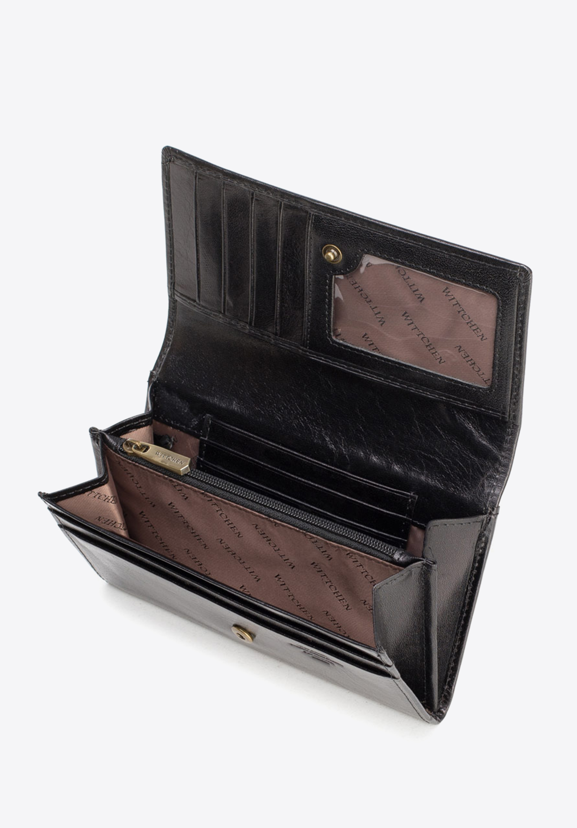 Portofel de damă din piele cu orientare orizontală, prins cu zăvor.Fabricat manual din piele naturală tăbăcită vegetal cu un luciu natural.Interiorul portofelului este realizat din poliester
