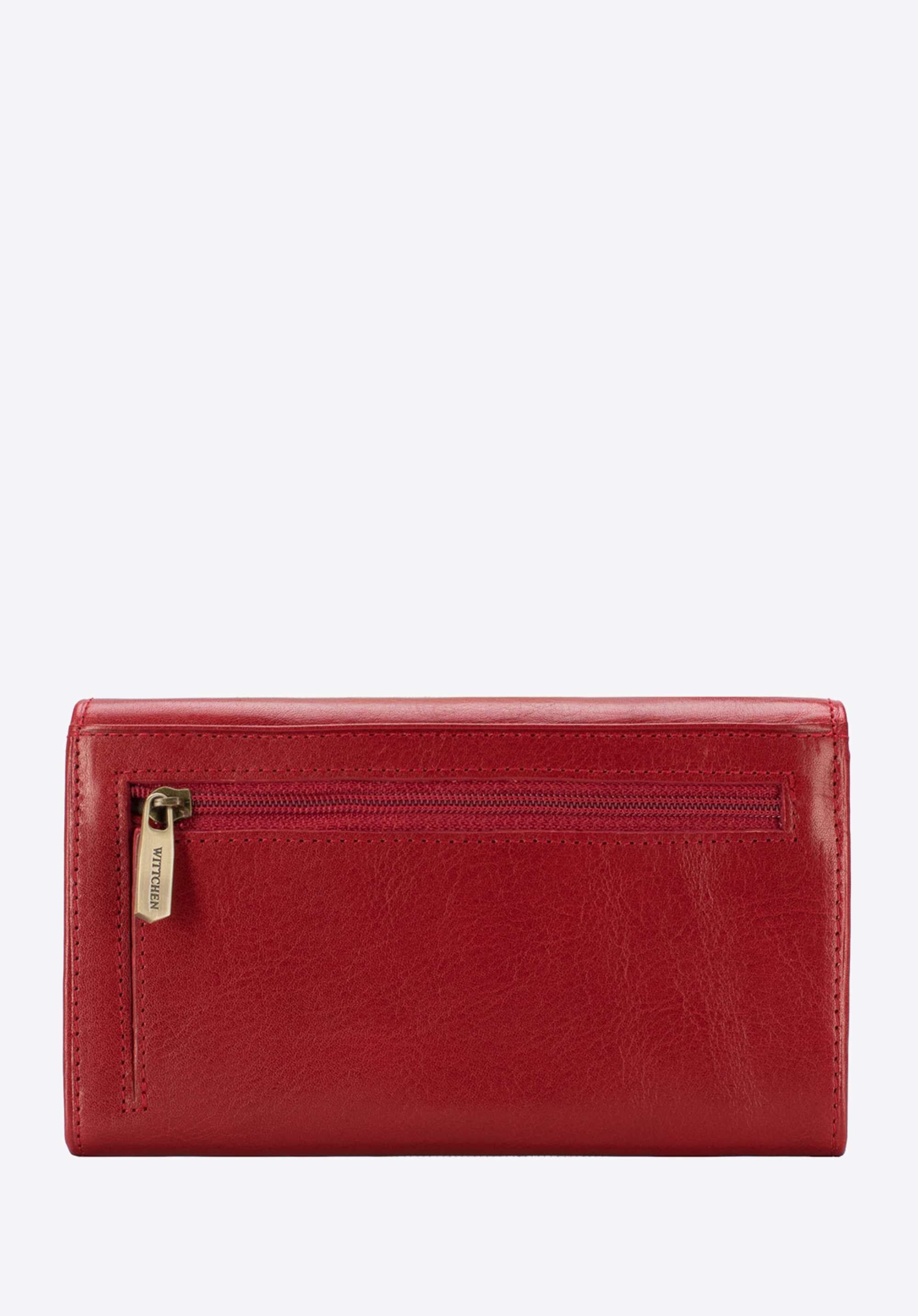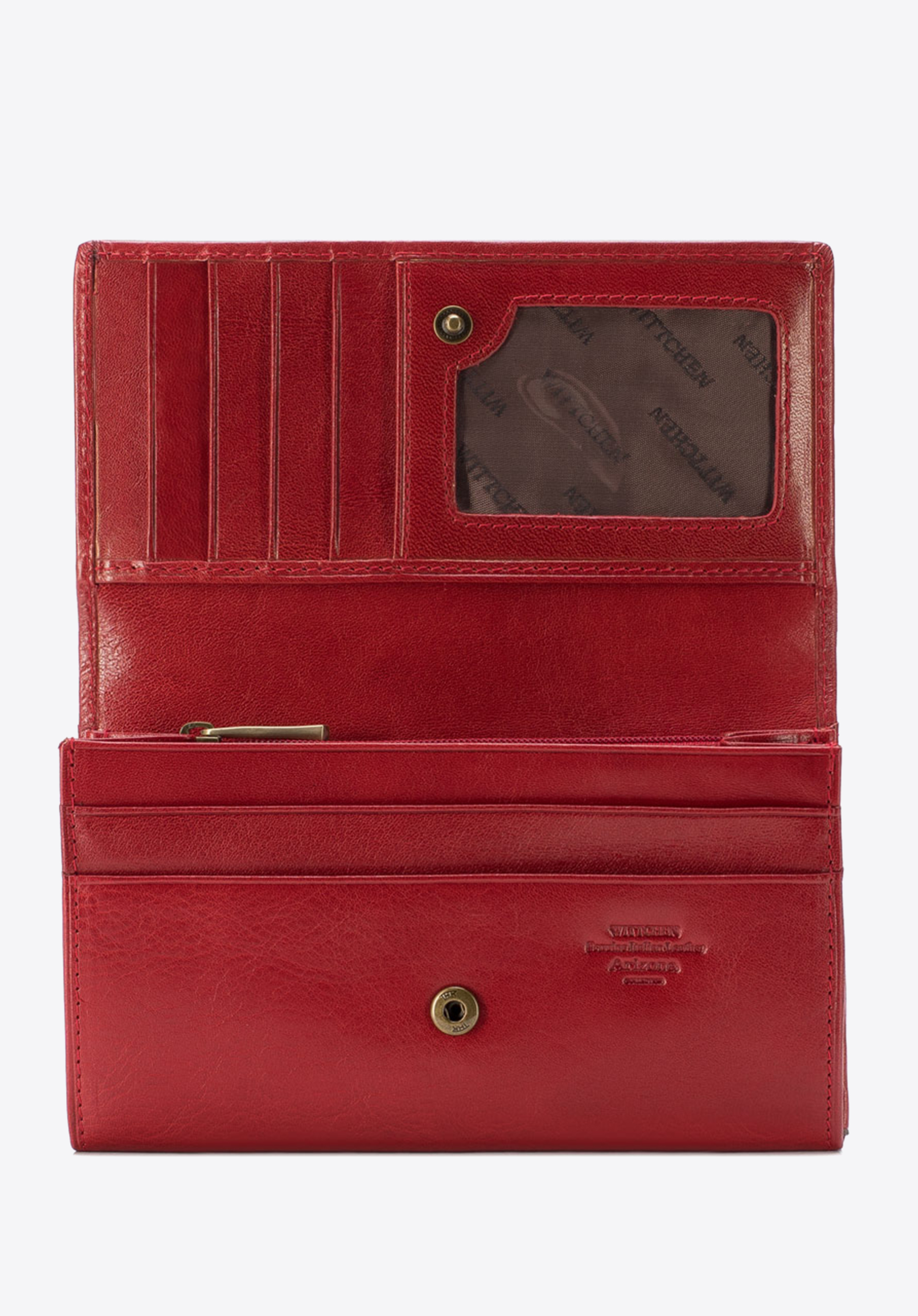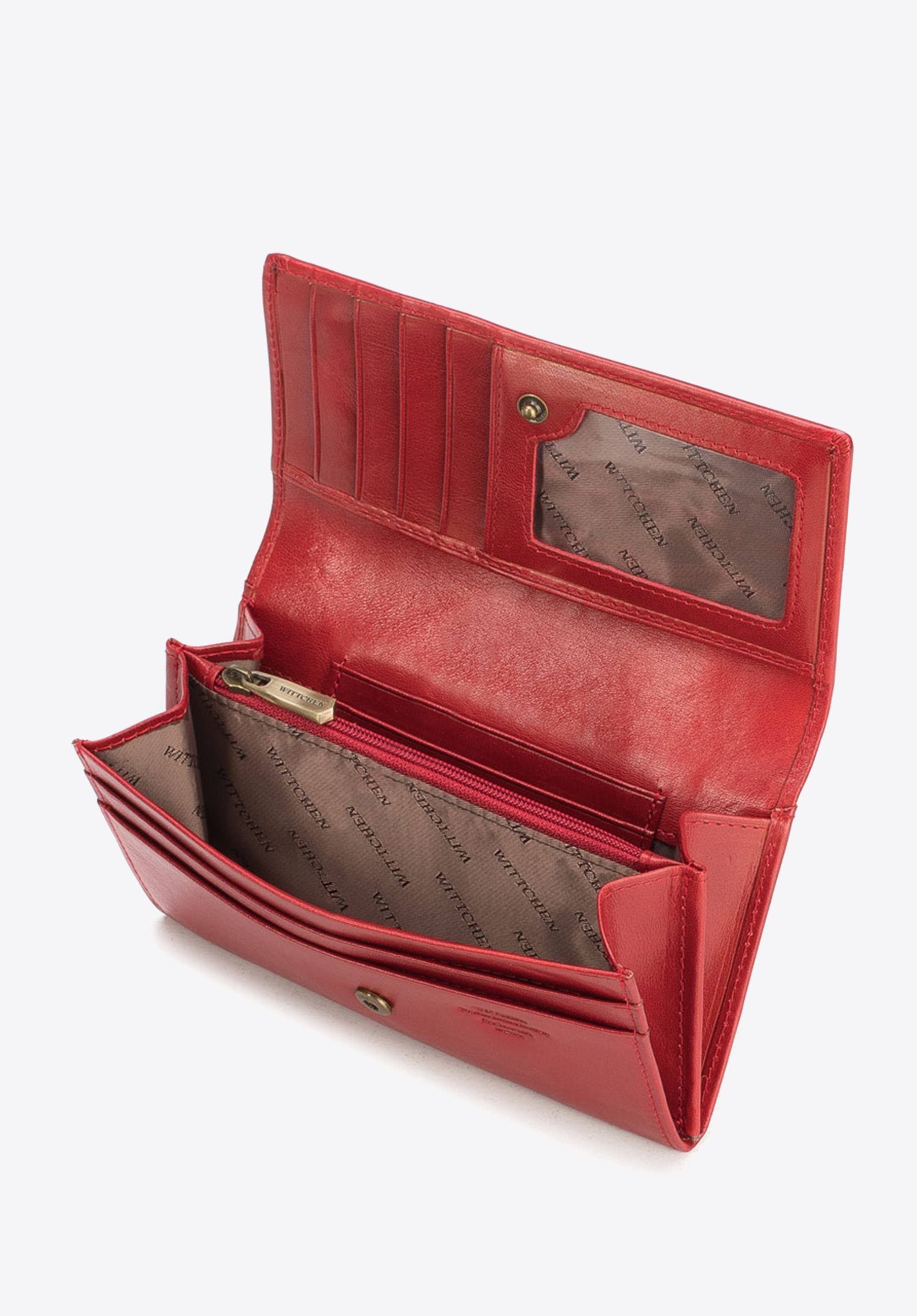 Portofel de damă din piele cu orientare orizontală, prins cu zăvor.Fabricat manual din piele naturală tăbăcită vegetal cu un luciu natural.Interiorul portofelului este realizat din poliester