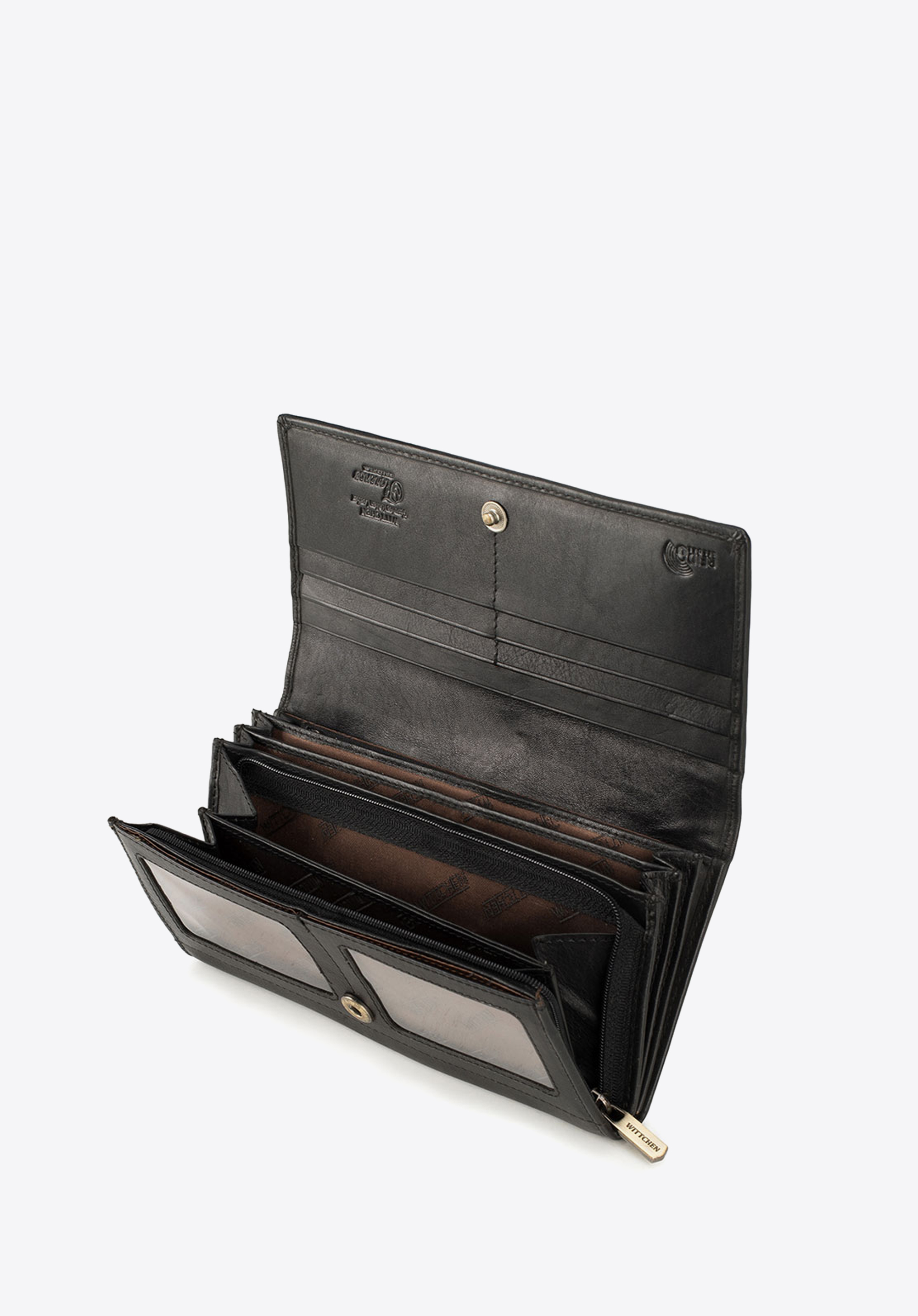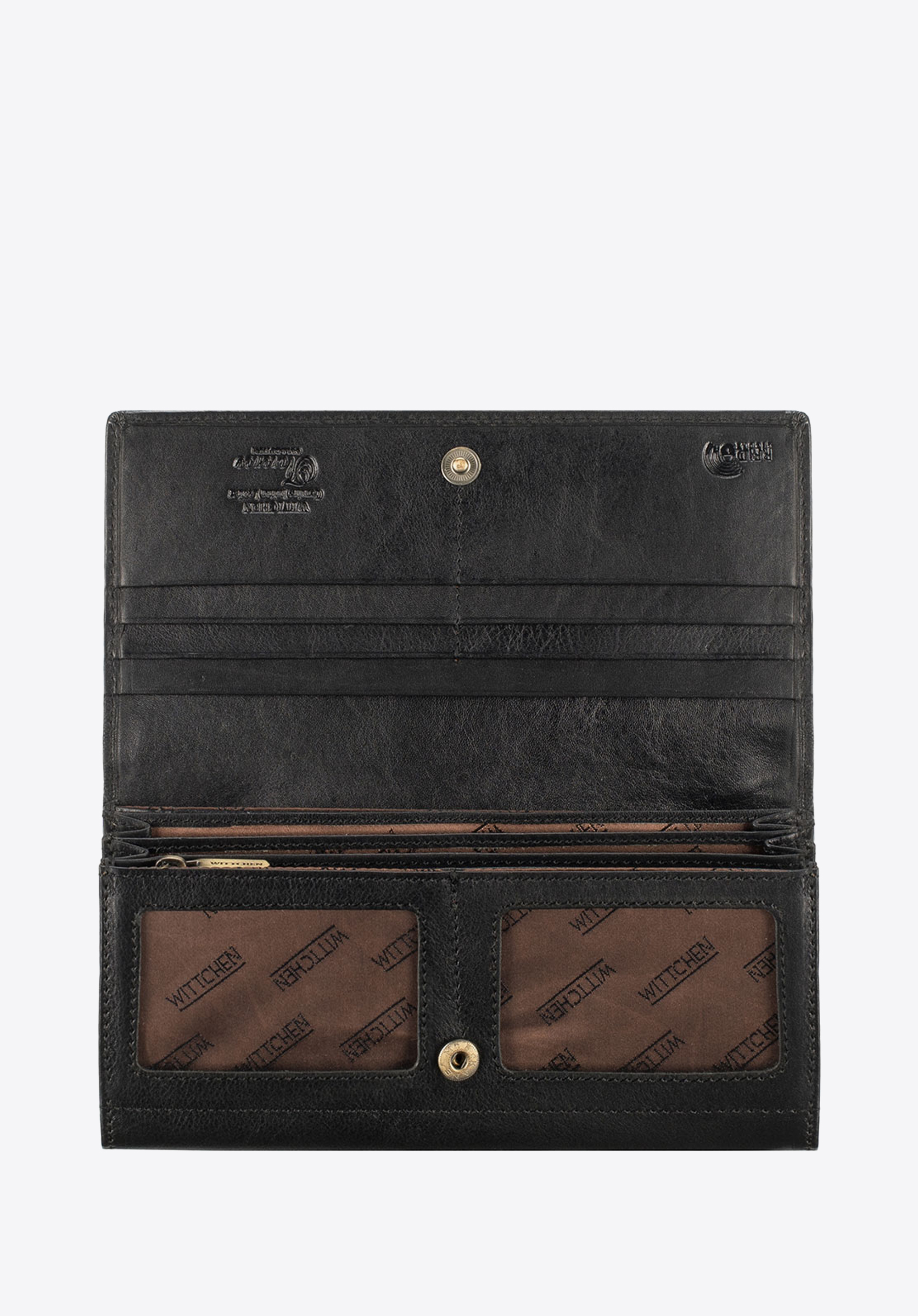 Portofel mare de damă realizat din piele de vițel rezistentă. Se caracterizează printr-un design simplu și o aranjare funcțională a buzunarelor. Dimensiunea mare permite păstrarea certificatul de înregistrare.
