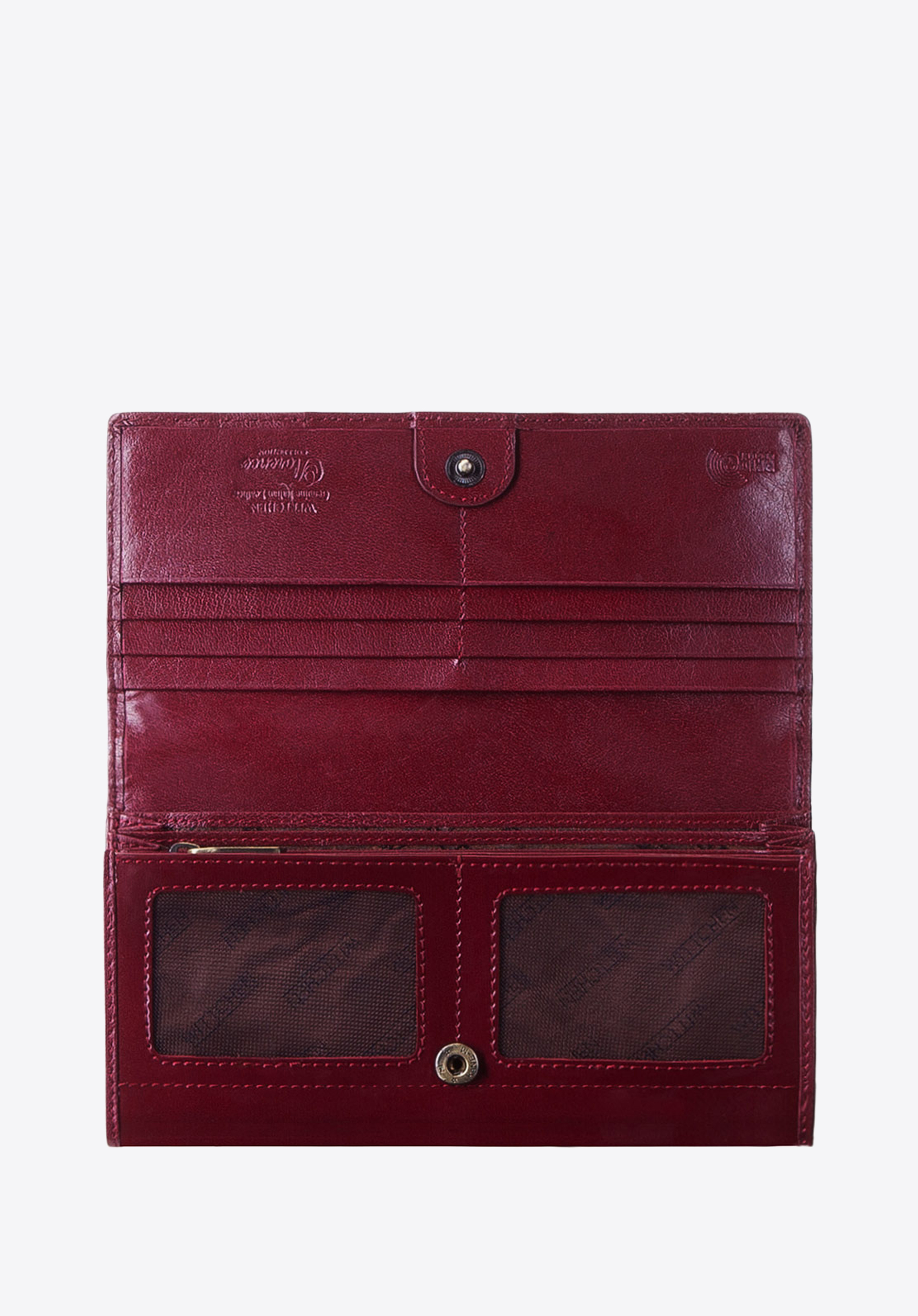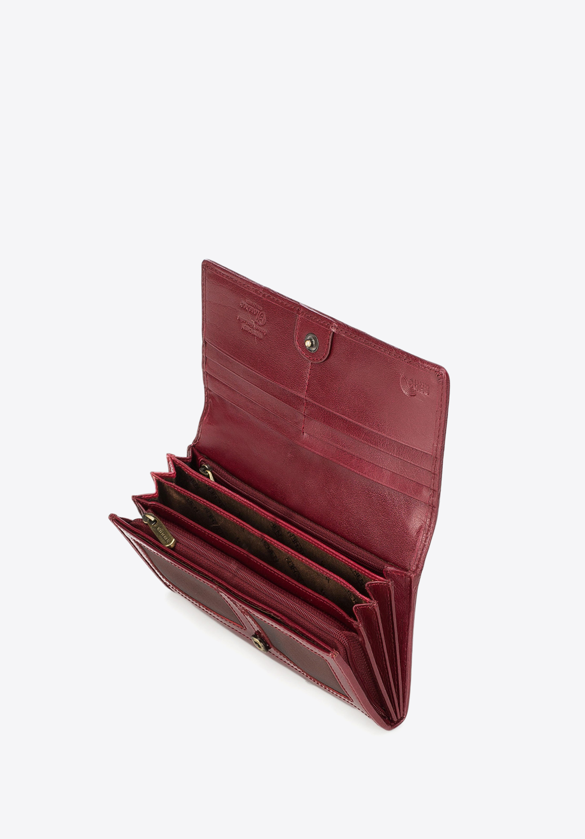 Acest portofel mare de damă este perfect pentru o femeie elegantă, care dorește să aibă cele mai importante lucruri la îndemână. Datorită pielii lăcuite de cea mai înaltă calitate, portofelul are un aspect deosebit, a fost finisat cu cea mai mare atenție la detalii. Portofelul de mărime mare, cu multe fante şi buzunare are suficient loc pentru multe lucruri, care facilitează păstrarea ordinii. În interior are patru buzunare pentru bancnote, două buzunare închise cu fermoar, șase locuri pentru carduri și trei buzunare suplimentare, din care două din plasă semitransparentă. Acest portofel de damă din piele lăcuită are o căptușeală cu RFID, care protejează împotriva citirii datelor de pe carduri.