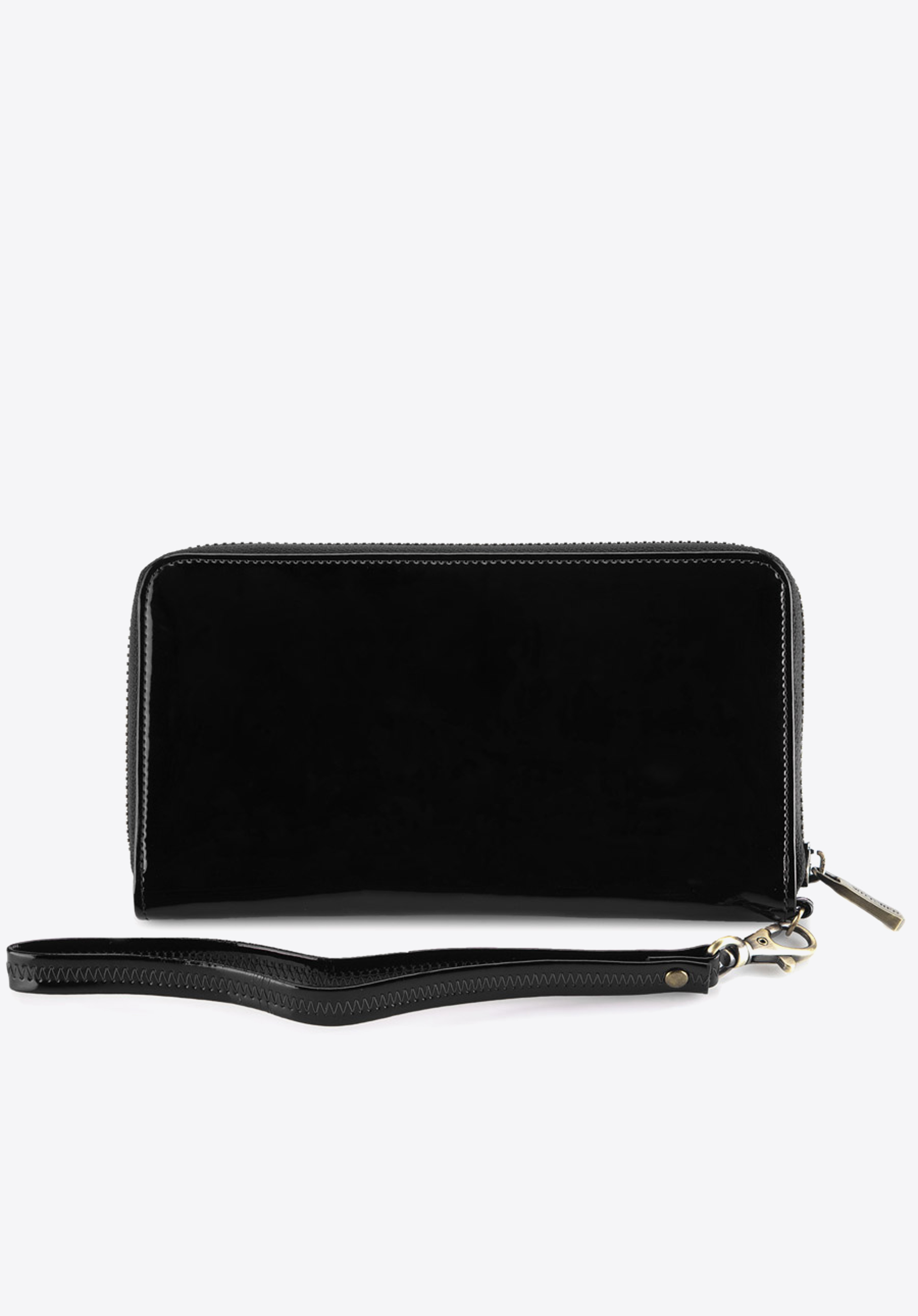 Acest portofel mare de damă acoperit cu piele lăcuită este un accesoriu funcțional într-un stil rafinat. Modelul se deosebește printr-o estetică fermecătoare și va sublinia perfect un look de seară.