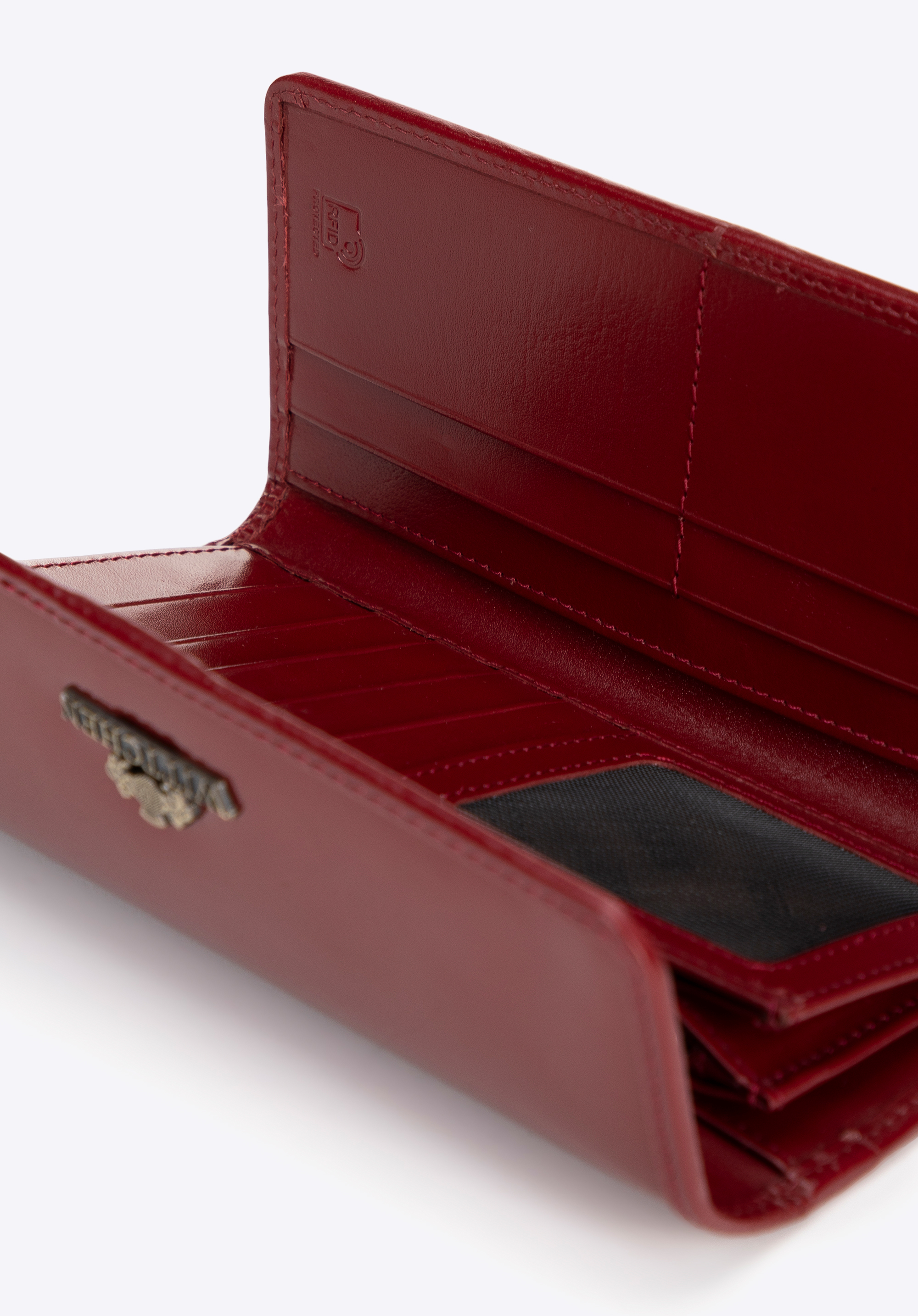 - Interior: 2 buzunare pentru bancnote, un buzunar pentru monede cu fermoar, 9 sloturi pentru carduri și două compartimente suplimentare fac acest portofel practic.