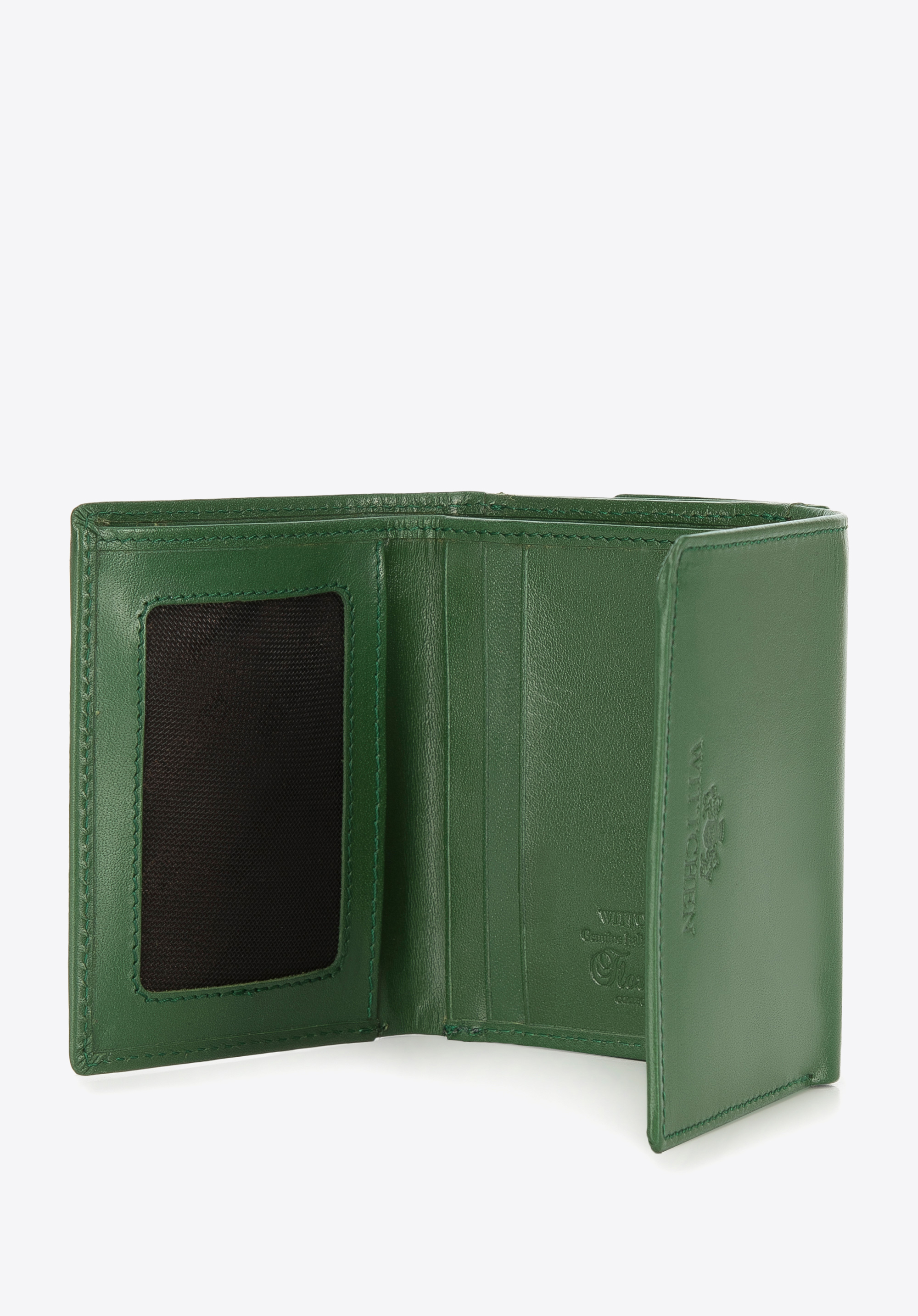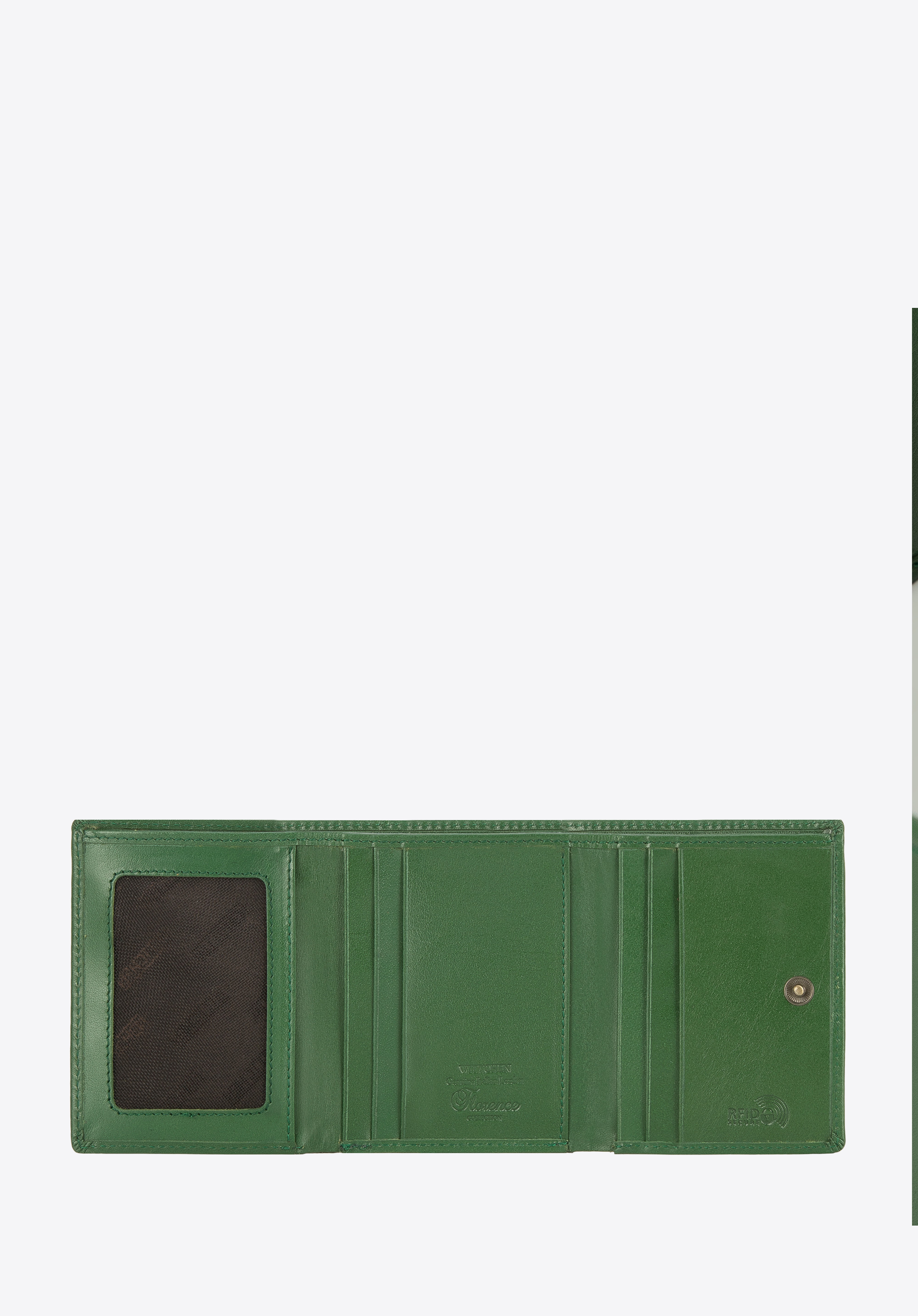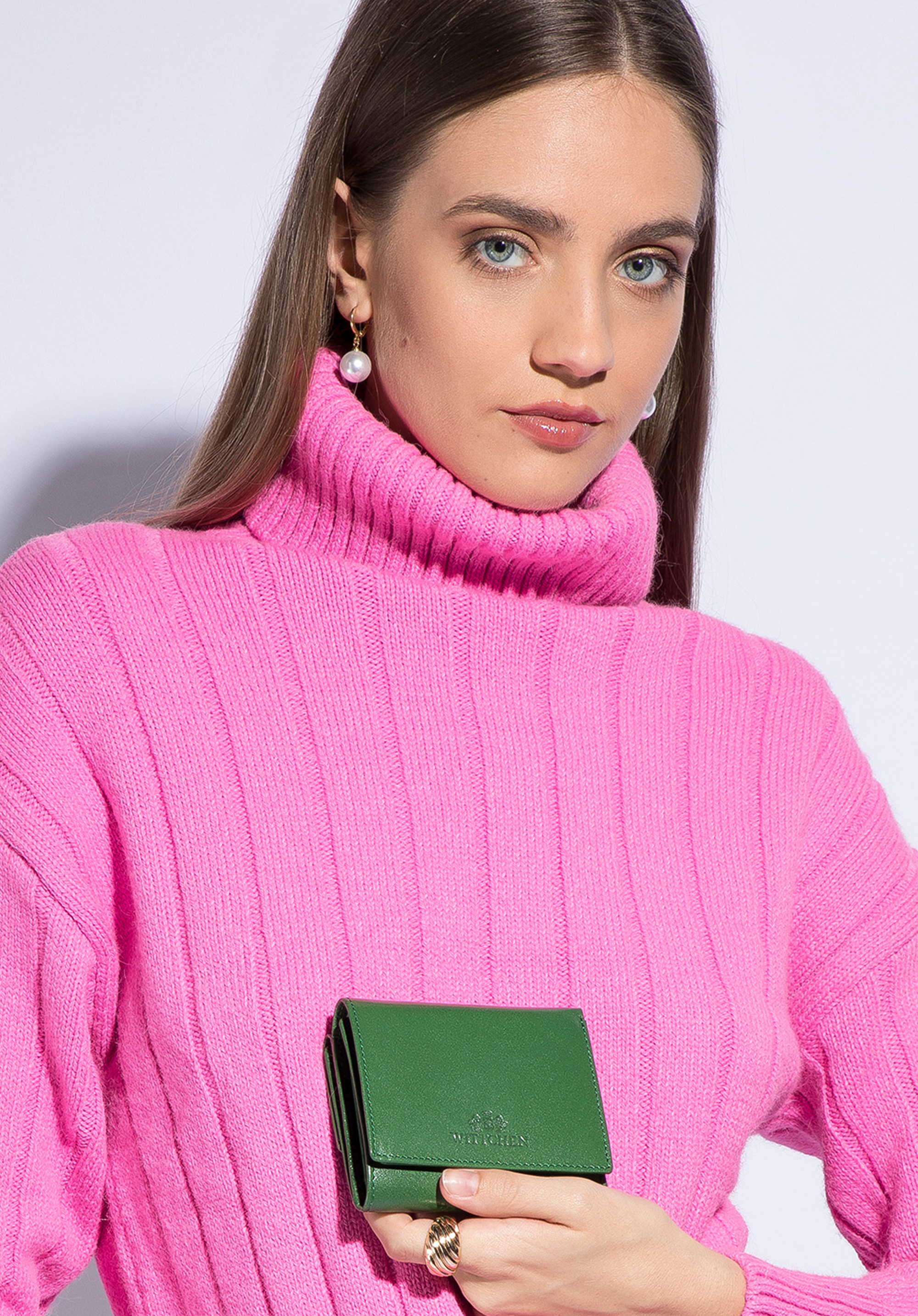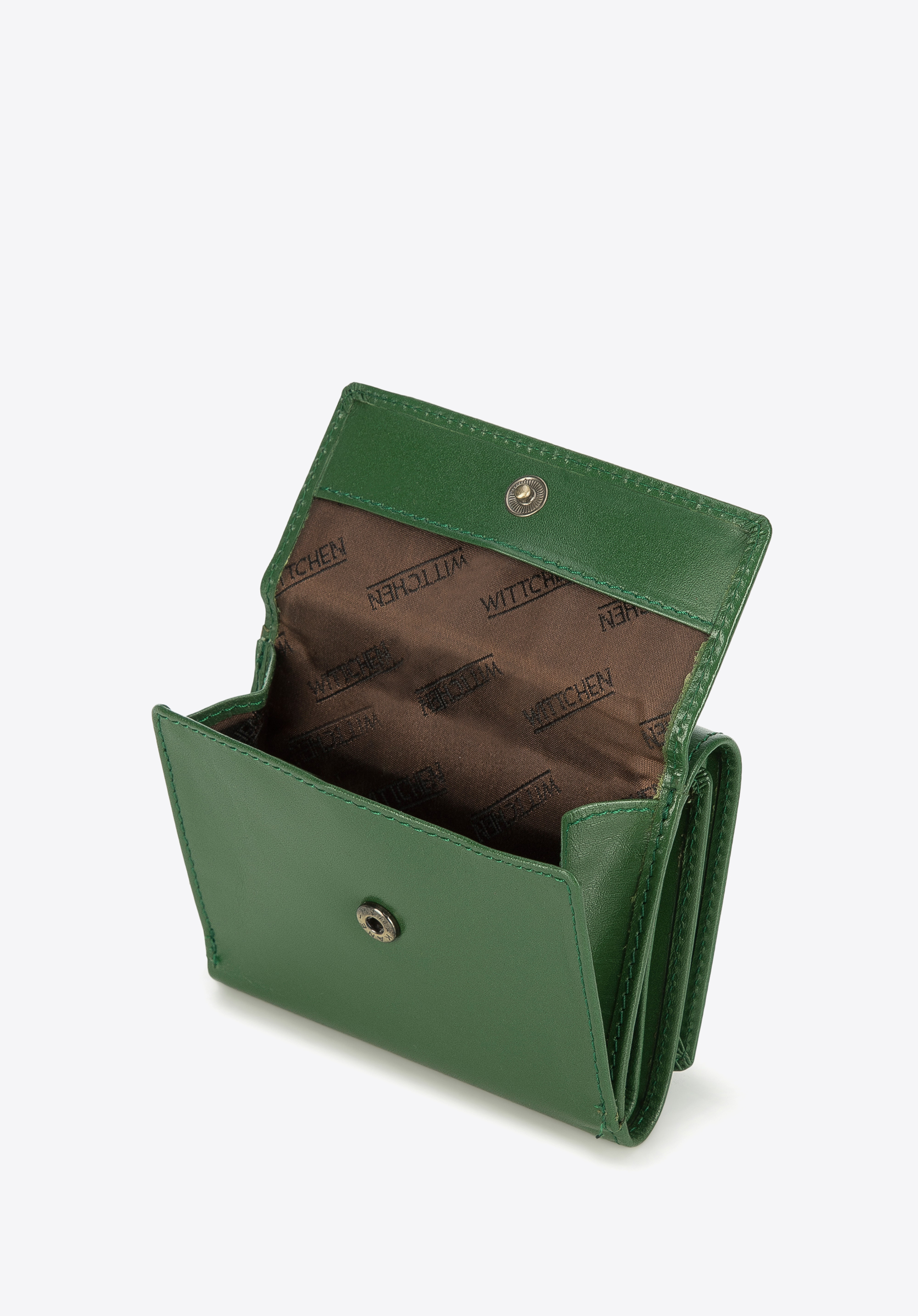 Acest portofel va fi util pentru orice femeie căreia îi plac accesoriile practice și elegante. Este confecționat din piele naturală de înaltă calitate, cu logo-ul WITTCHEN în relief pe partea din față. În interior, este organizat excelent, cu mai multe fante pentru carduri și buzunare deschise, inclusiv unul cu plasă: perfect pentru un bilet sau o fotografie. Un buzunar separat pentru monede, cu închidere cu clichet, va permite o utilizare convenabilă fără a fi nevoie să deschideți întregul portofel. În plus, căptușeala de pe acest model protejează cardurile de citirea datelor (RFID).Portofelul pentru femei din piele netedă, cu două fețe, este un model elegant și la îndemână și o idee excelentă de cadou pentru orice femeie.