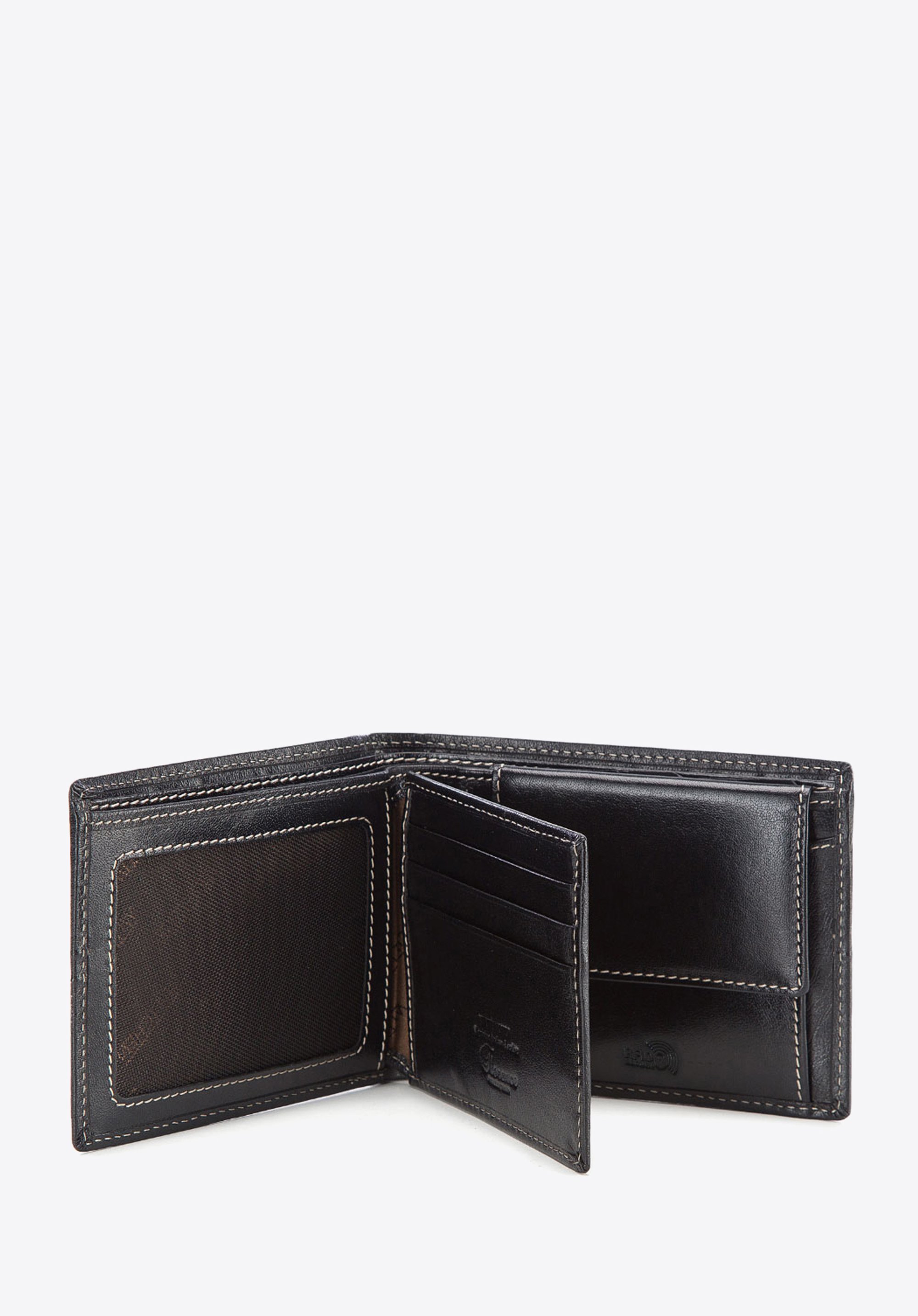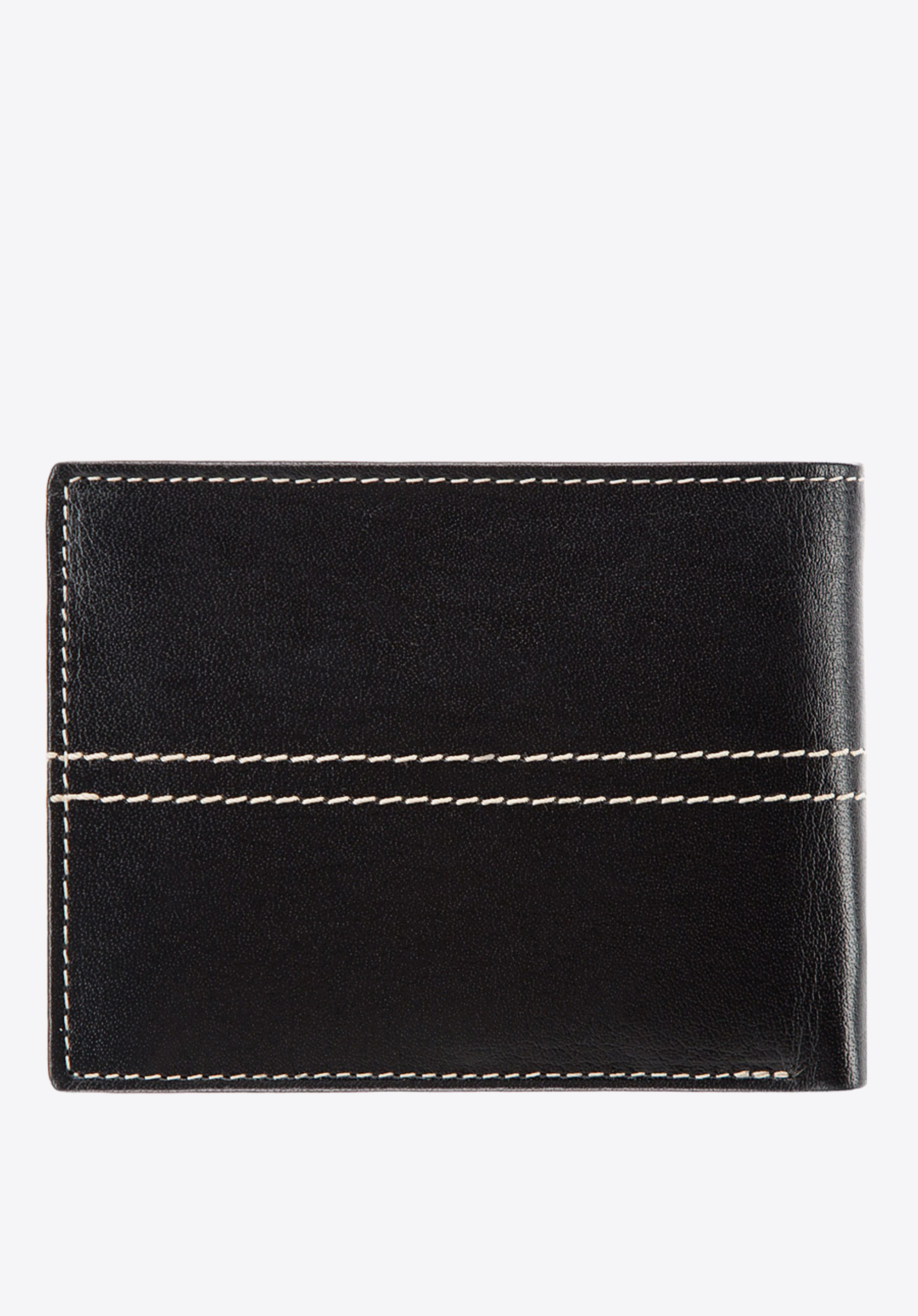 din piele naturală rezistenta, cu fermoare vizibile .Cusăturile subliniază designul simplu al acestui model.Este echipat cu o căptușeală inovatoare care blochează posibilitatea de scanare a datelor de pe card.Acest model are un ornament sub formă de