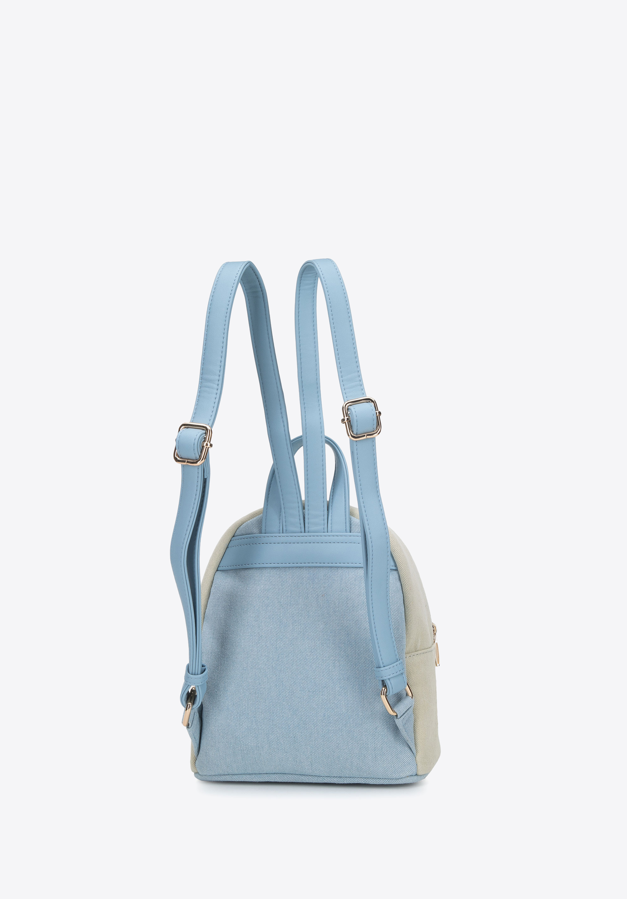din denim în două nuanțe și inserții din piele ecologică.Țesătura din denim este, în plus,