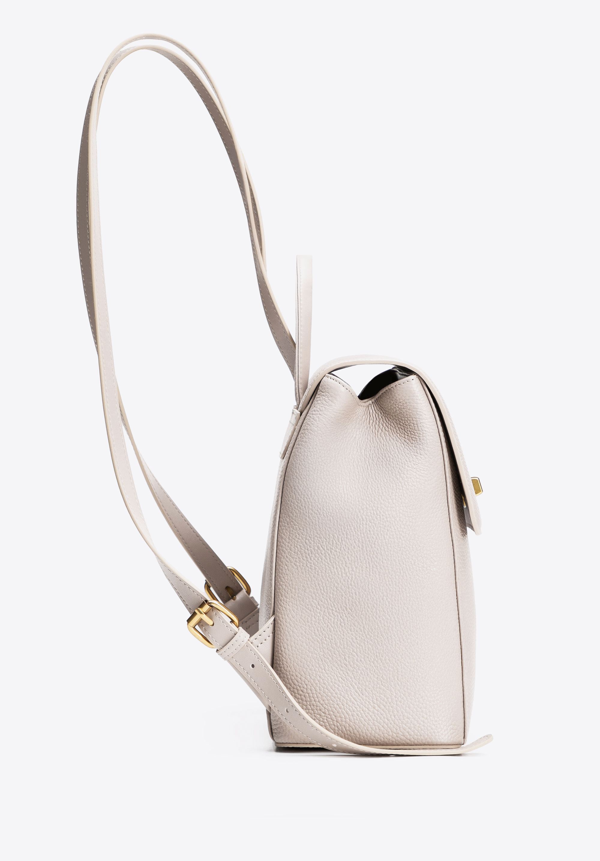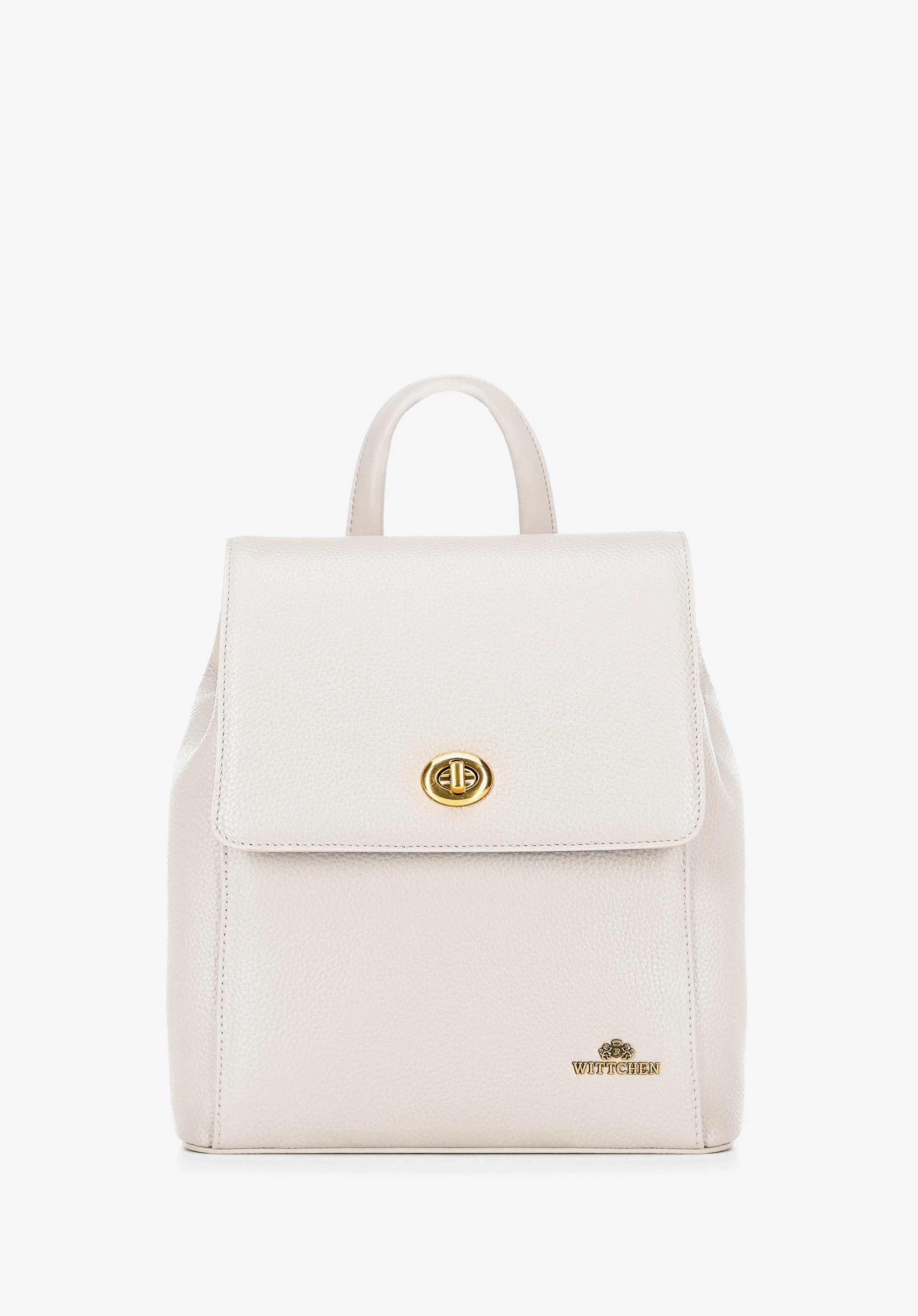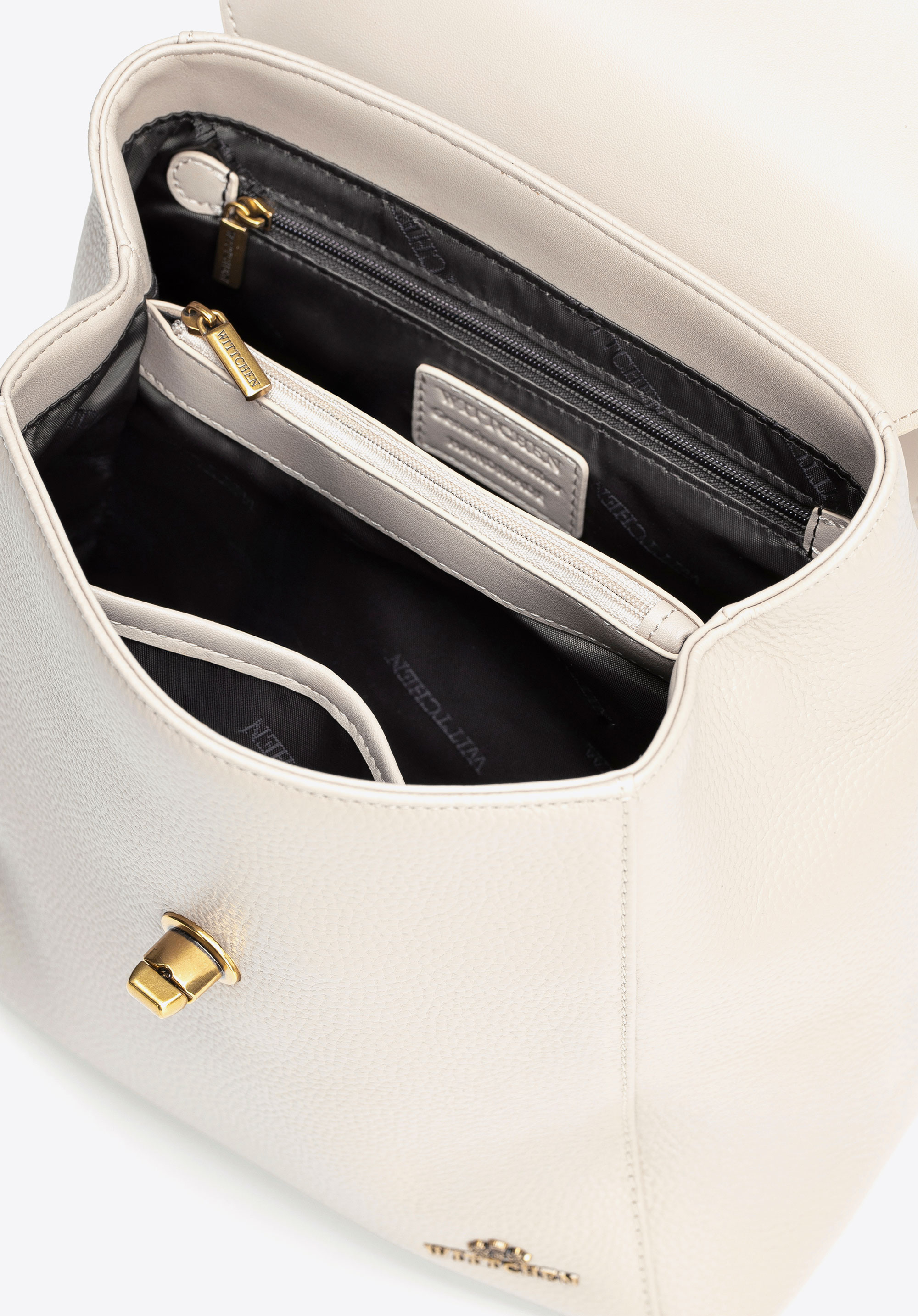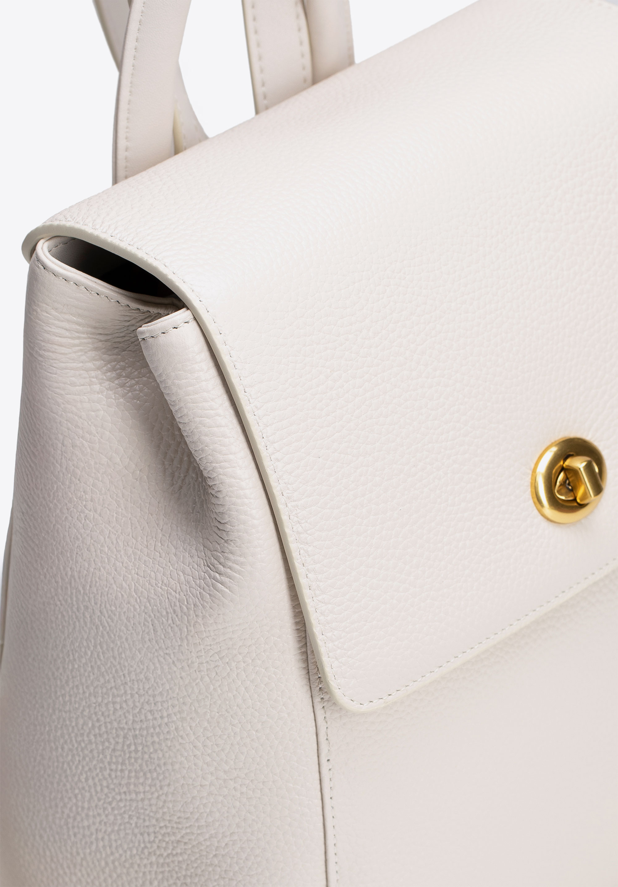 Un rucsac elegant din piele naturală (cu mâner și curele din material din microfibră asemănătoare pielii), care combină eleganța, durabilitatea și funcționalitatea excepțională. Designul său modern este evidențiat de o încuietoare rotativă care nu numai că asigură securitatea, dar adaugă și o notă unică. În interior, rucsacul are două compartimente separate printr-un buzunar cu fermoar.