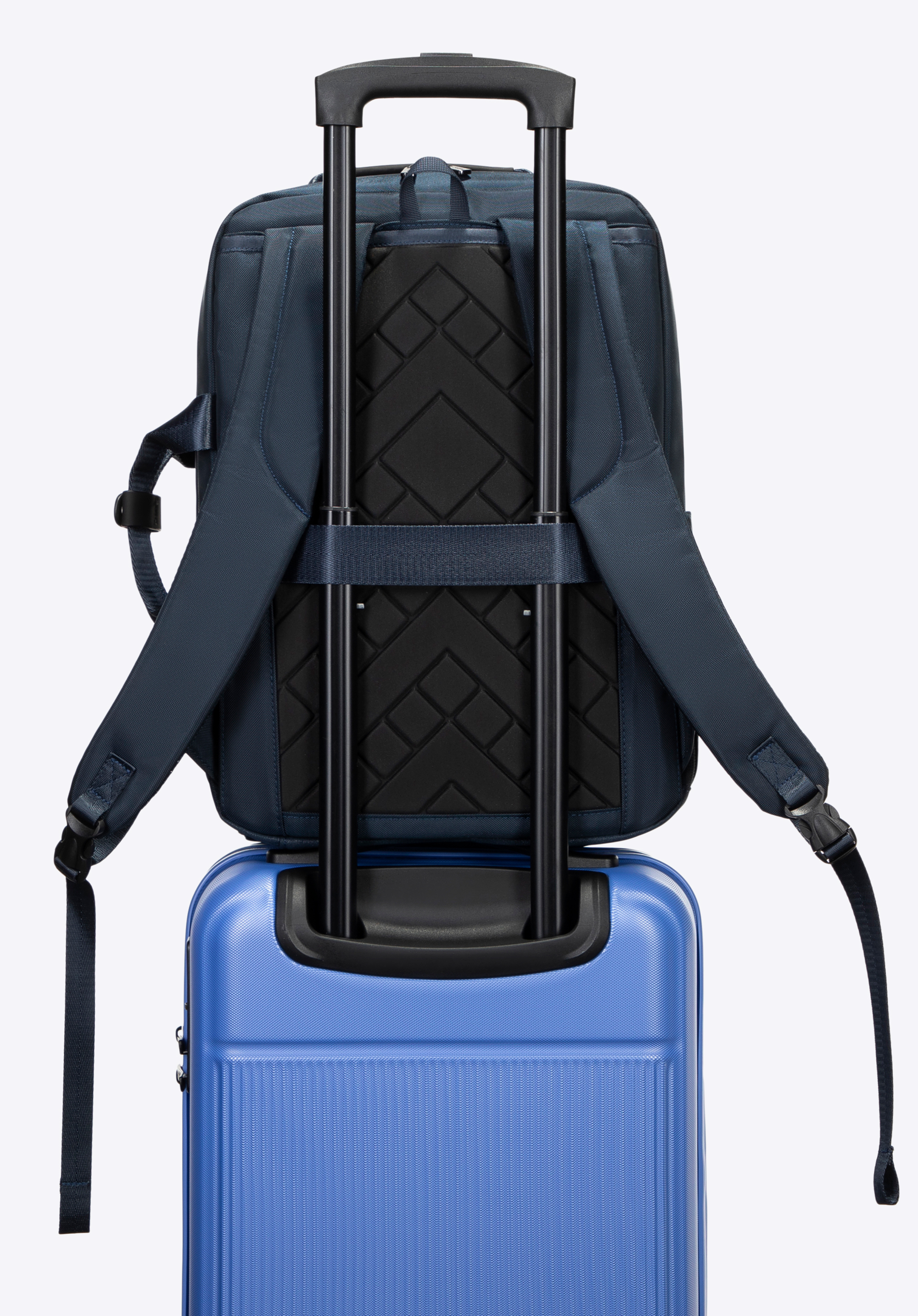 Sfatul nostru: Folosește cureaua de pe spate pentru a fixa rucsacul pe mânerul valizei . Completează-ți setul cu o geantă de voiaj asortată și bucură-te de un aspect modern și uniform, oriunde ești.