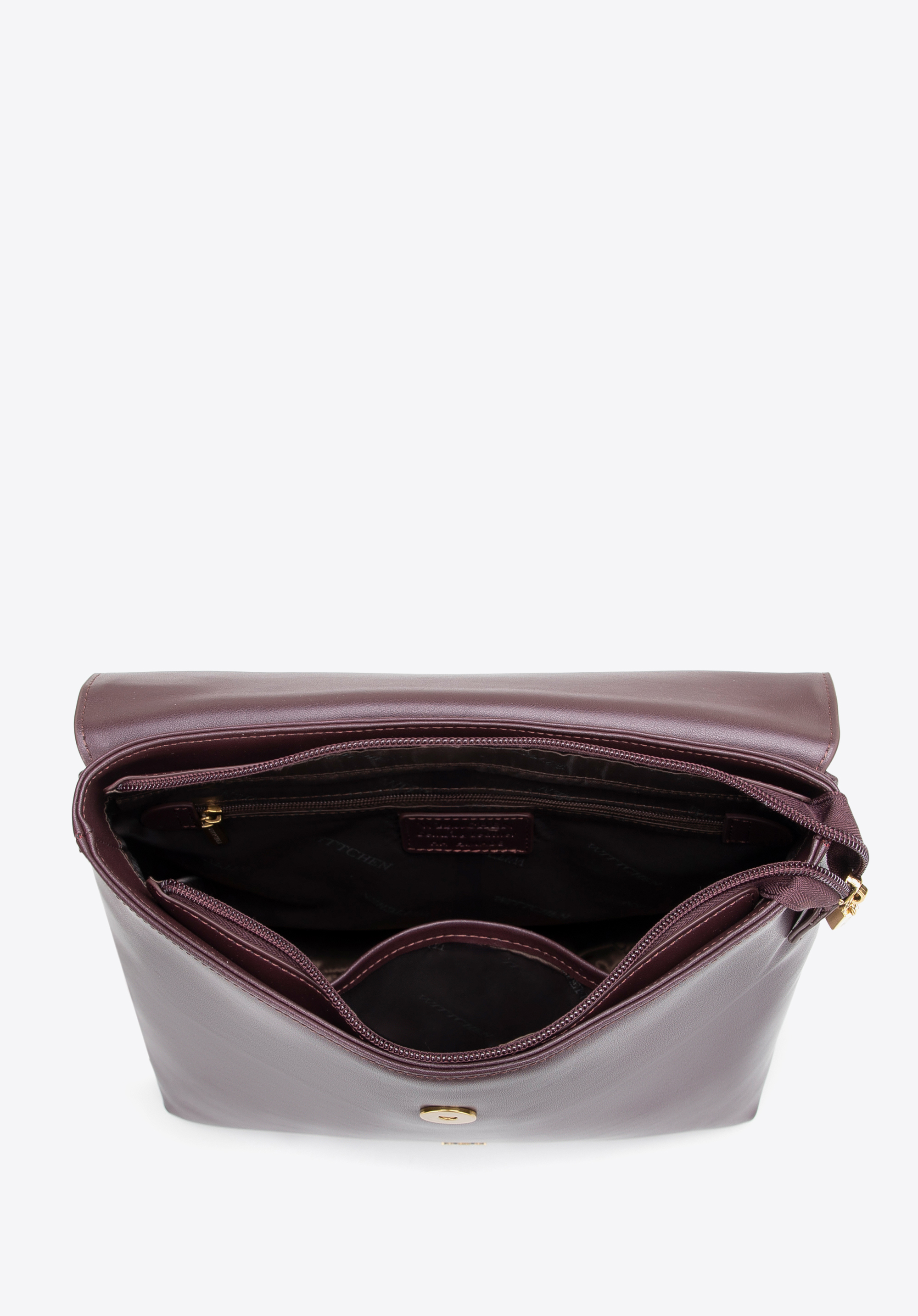 - Material: Corp din piele naturală – durabil, elegant și rezistent la uzura zilnică. Materialul de sub clapetă, mânerul, bretelele și finisajele interioare sunt din microfibră ce imită perfect pielea, oferind confort și ușurință.