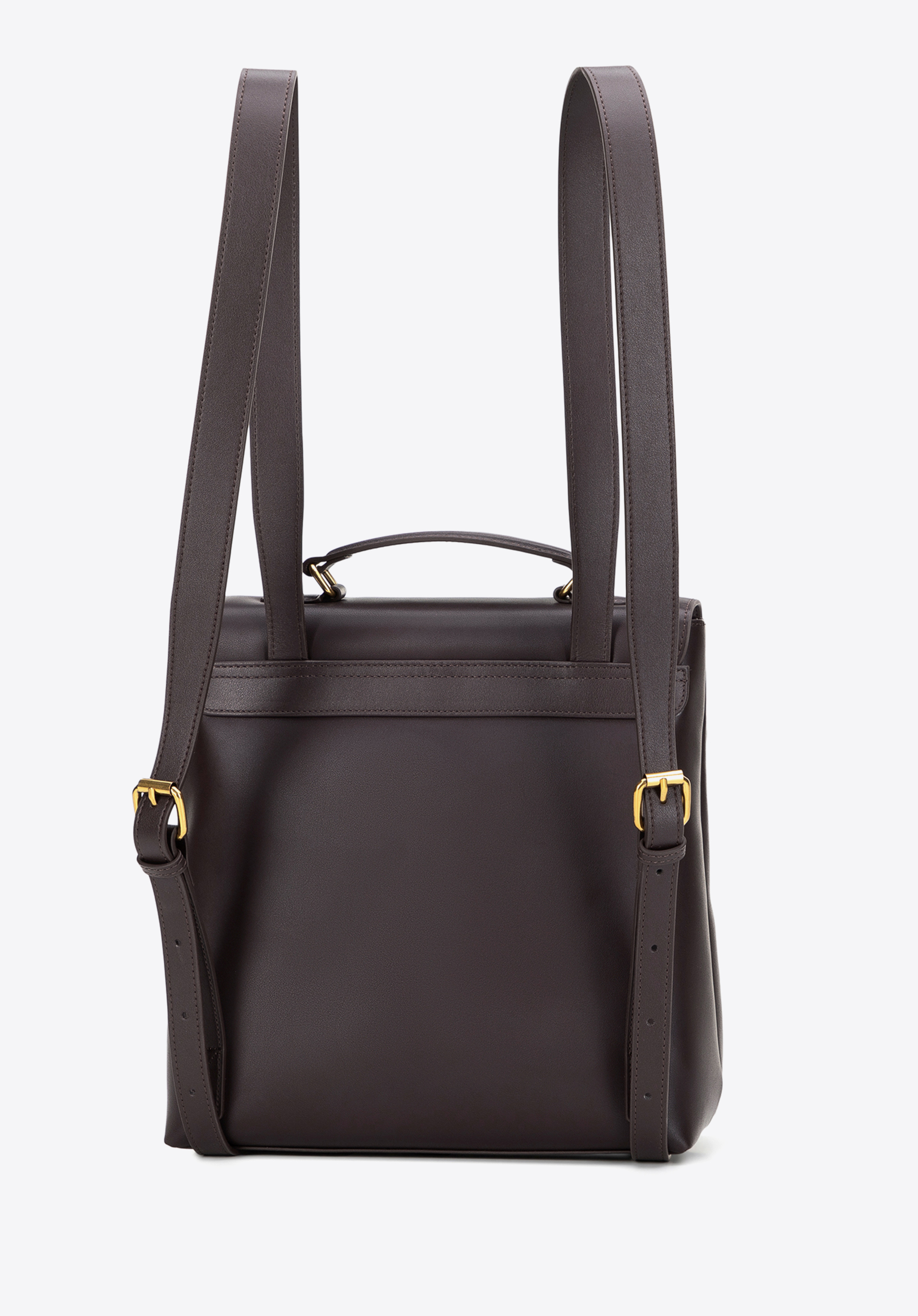 Descoperă un rucsac care îmbină designul clasic cu soluții practice. Corpul este realizat din piele naturală, cu o textură subtilă ce atrage privirea prin finisajul elegant și rezistent. Materialul de sub clapetă, mânerul, bretelele și finisajele interioare sunt confecționate din microfibră ce imită perfect pielea, oferind lejeritate, confort și menținerea formei rucsacului chiar și în utilizarea zilnică. Închiderea cu clapetă, capsă și fermoar garantează siguranța conținutului, iar forma dreptunghiulară facilitează organizarea lucrurilor.