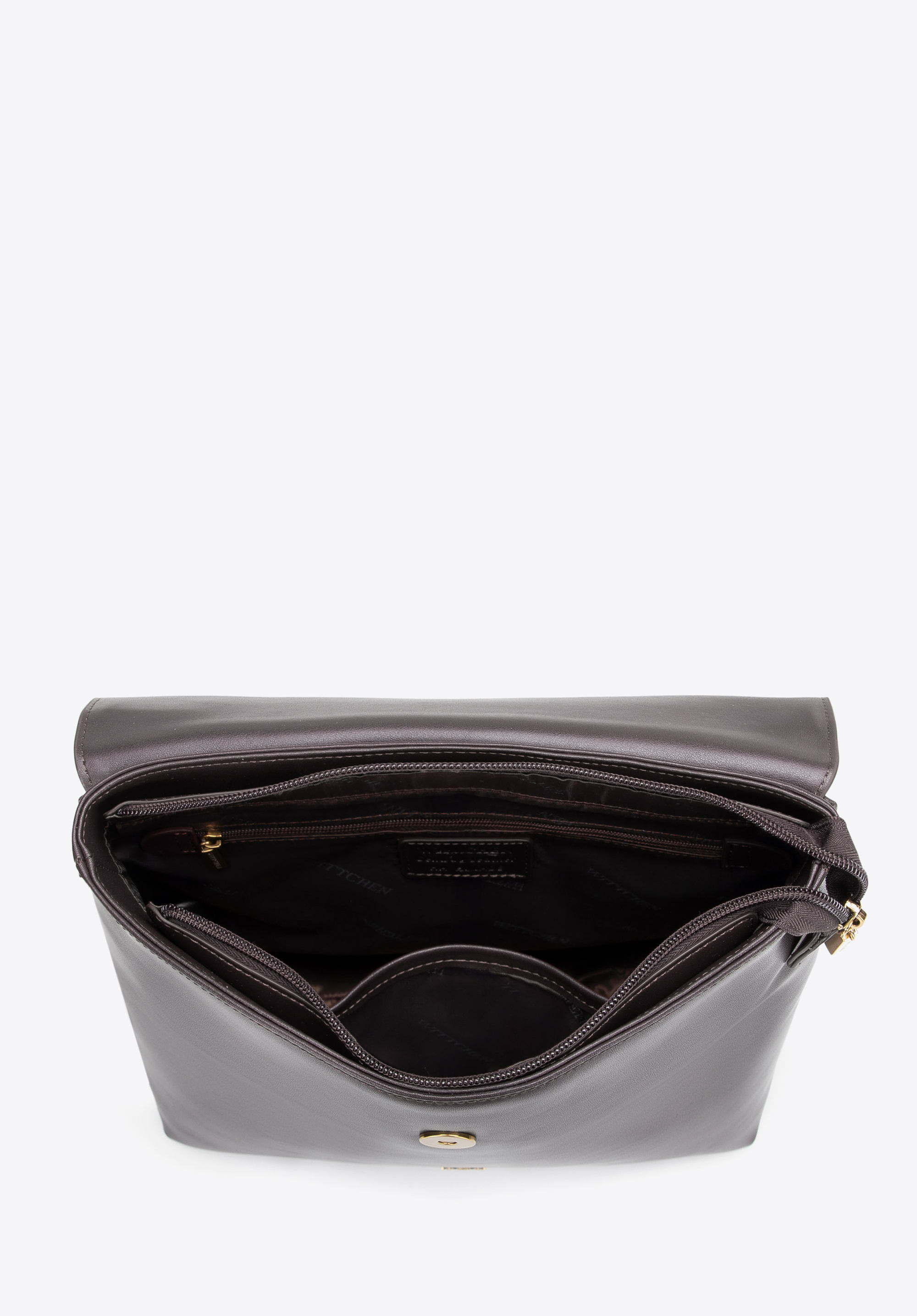 - Material: Corp din piele naturală – durabil, elegant și rezistent la uzura zilnică. Materialul de sub clapetă, mânerul, bretelele și finisajele interioare sunt din microfibră ce imită perfect pielea, oferind confort și ușurință.