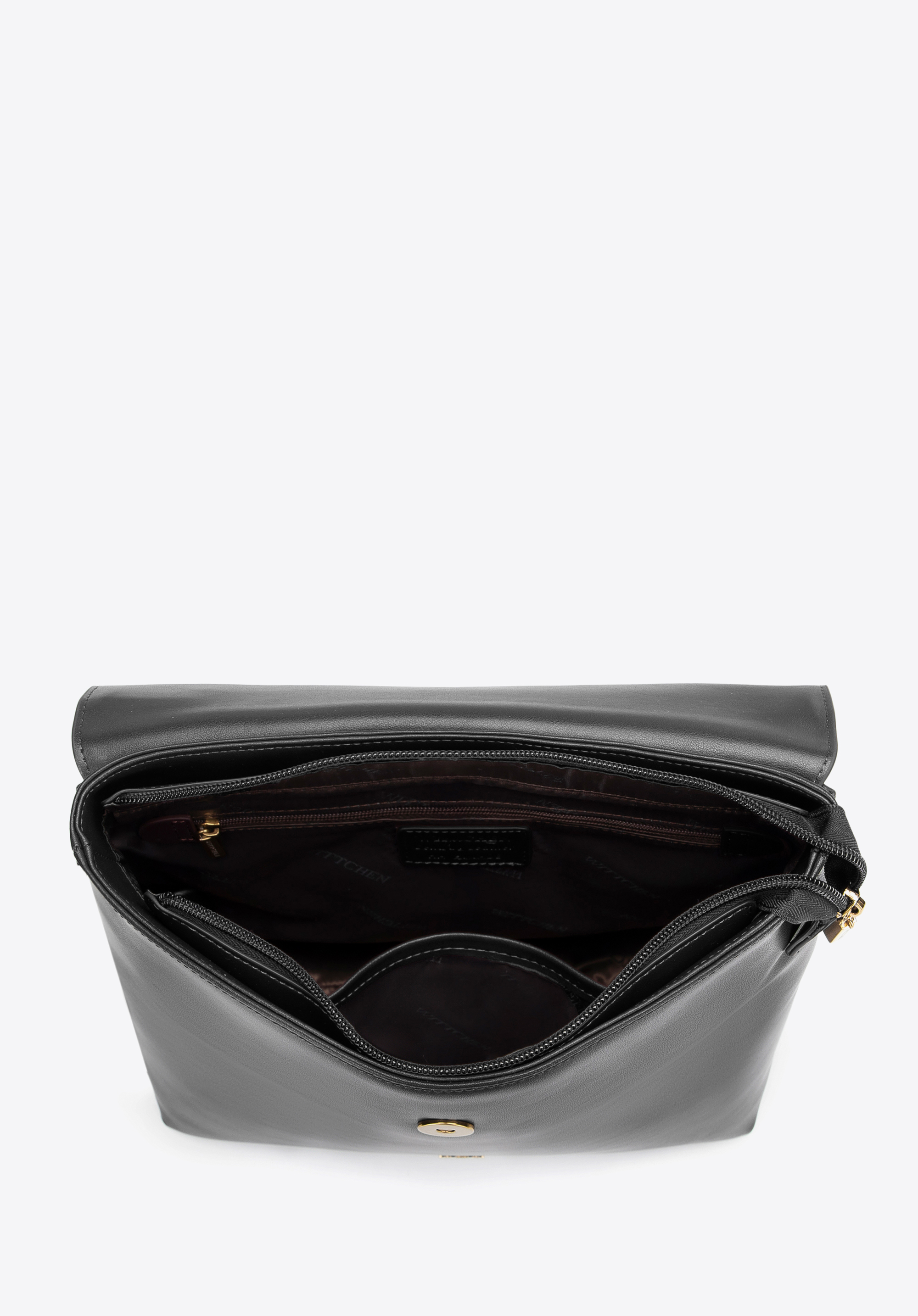 - Material: Corp din piele naturală – durabil, elegant și rezistent la uzura zilnică. Materialul de sub clapetă, mânerul, bretelele și finisajele interioare sunt din microfibră ce imită perfect pielea, oferind confort și ușurință.