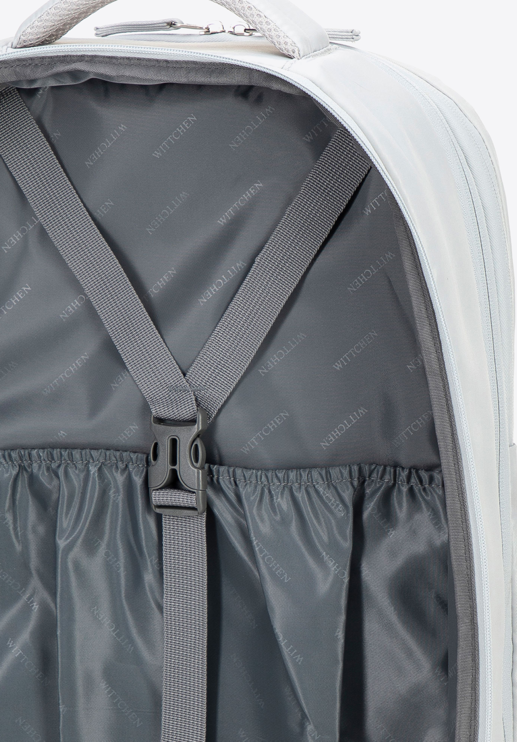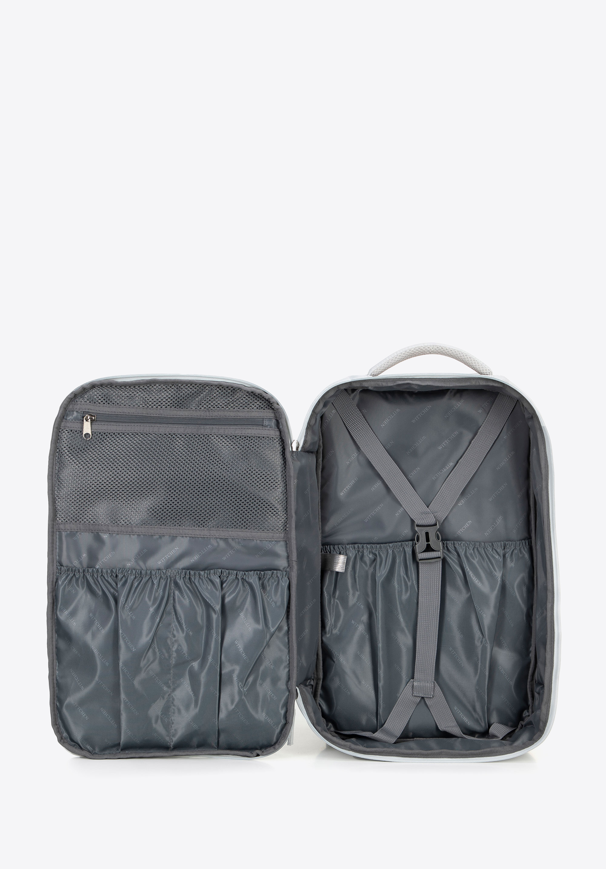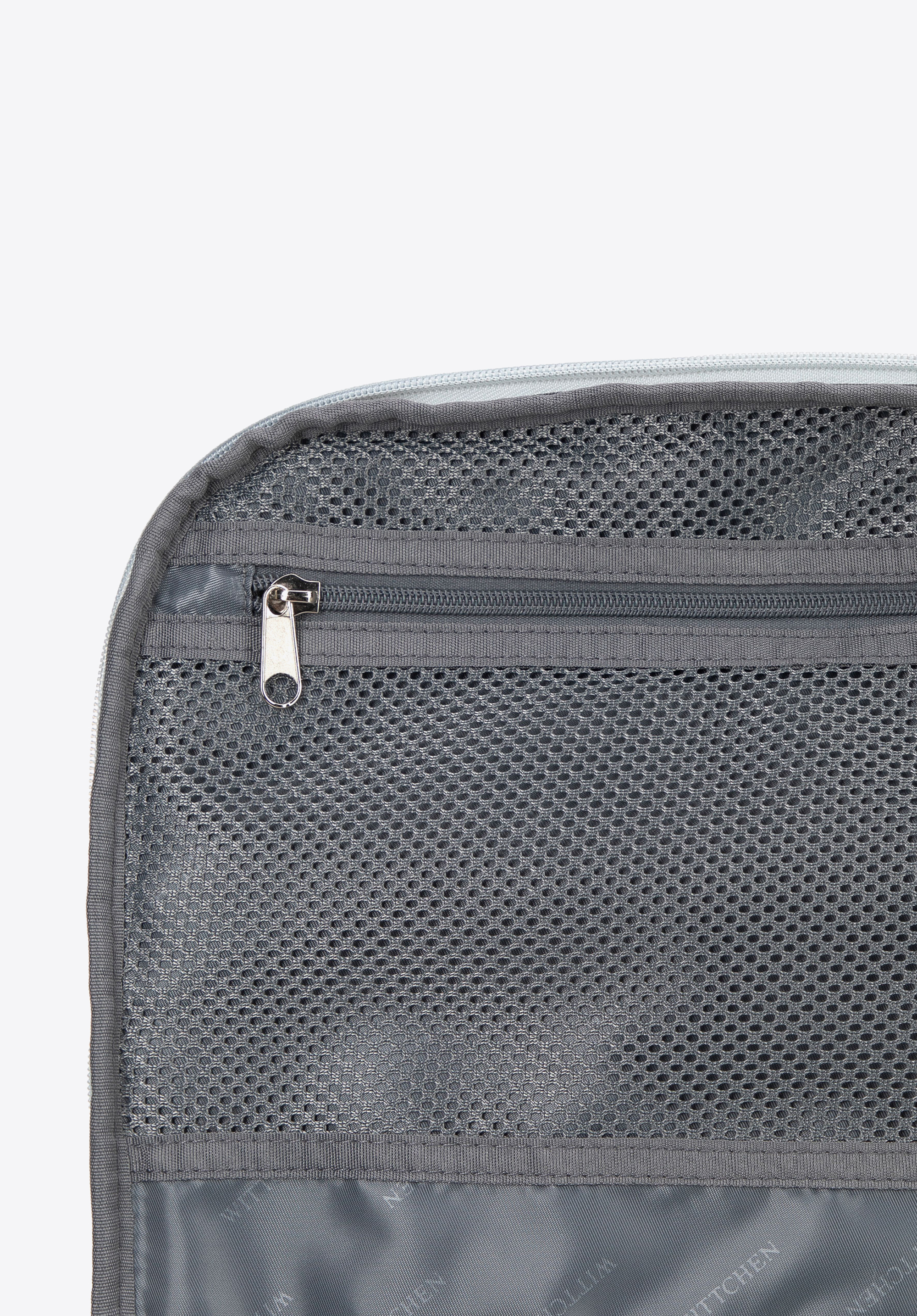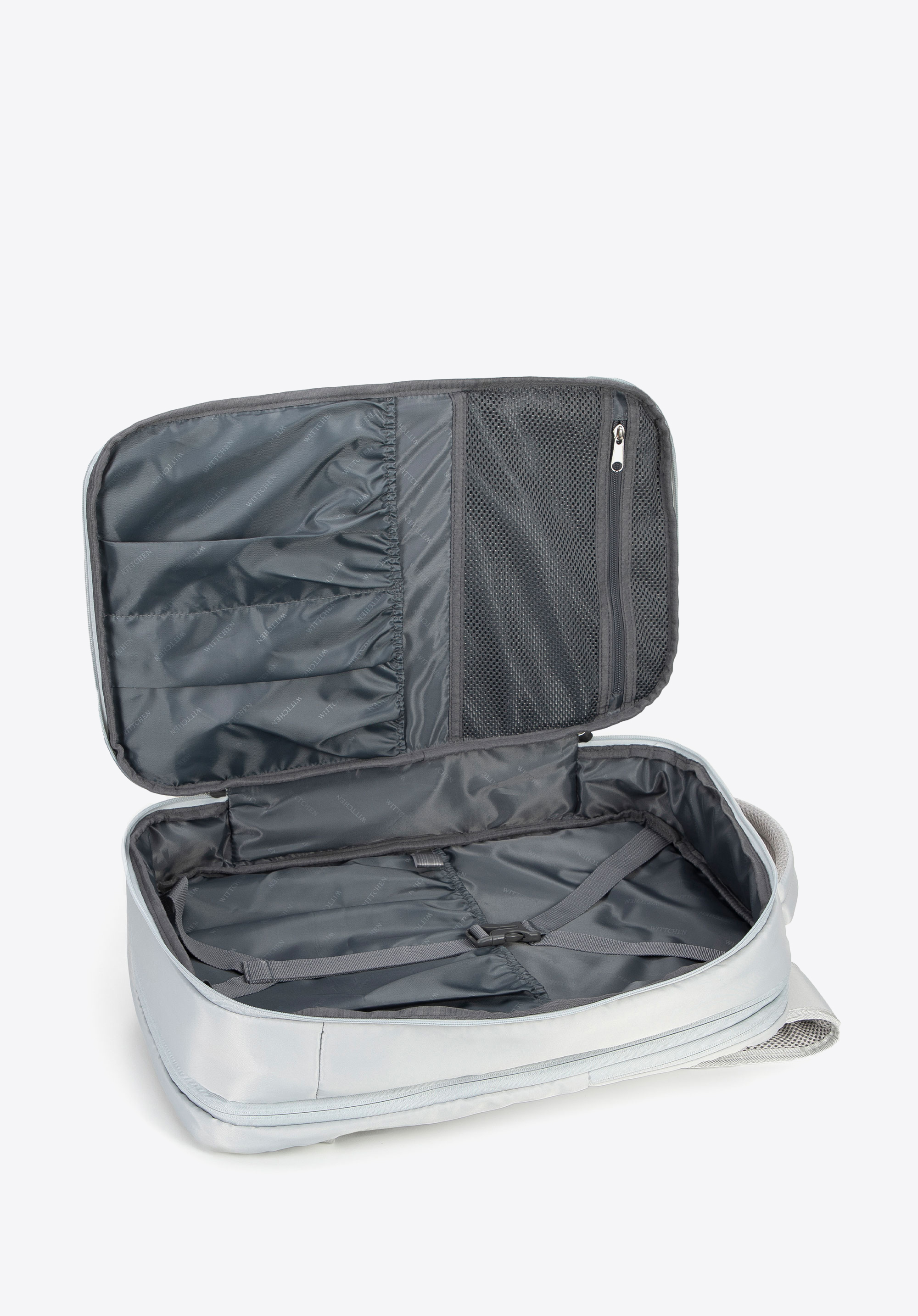 - Compartiment principal: Compartimentul se deschide în stil valiză, având trei buzunare elastice pentru articole mai mici. Curelele de siguranță mențin conținutul organizat și ușor accesibil.