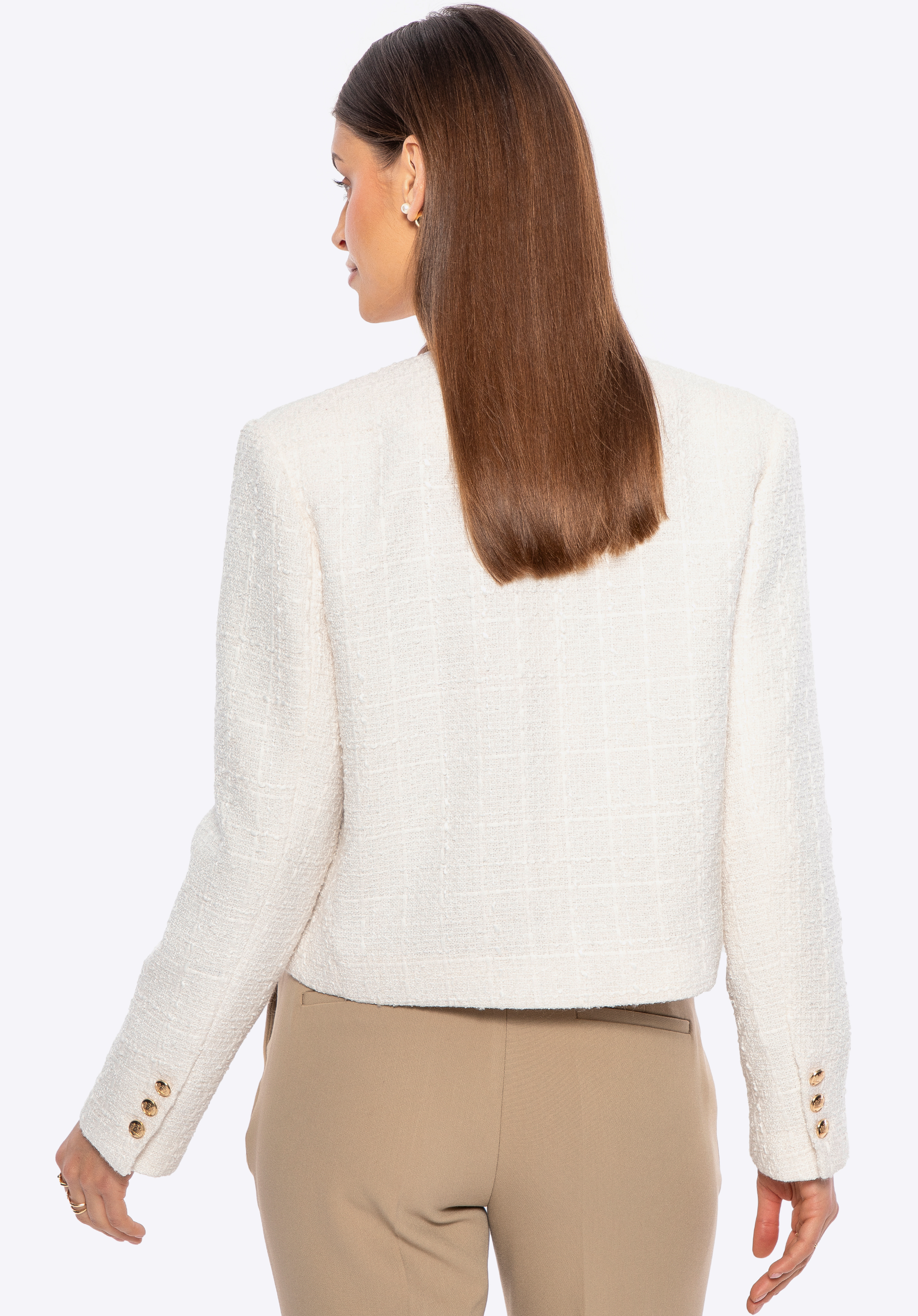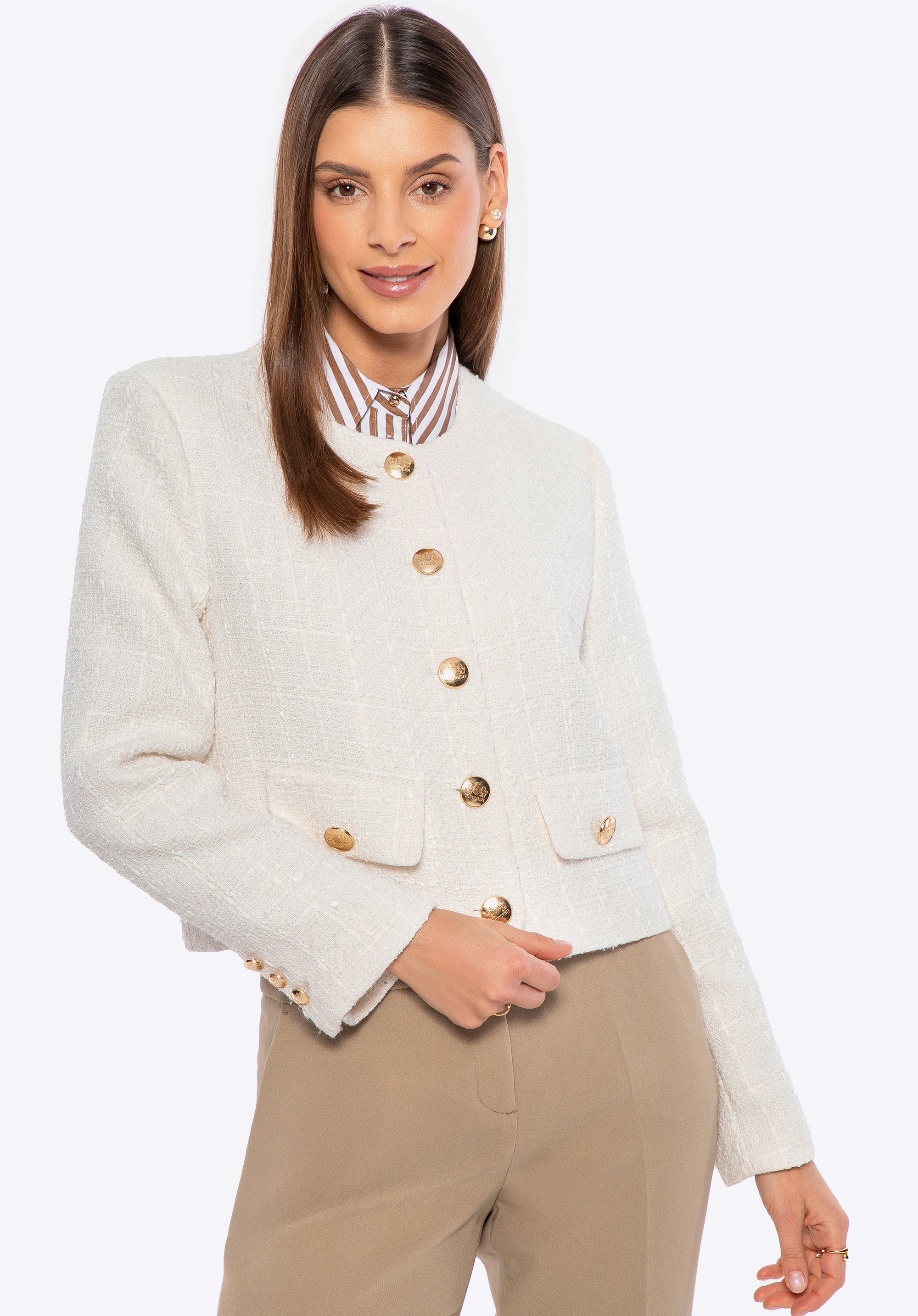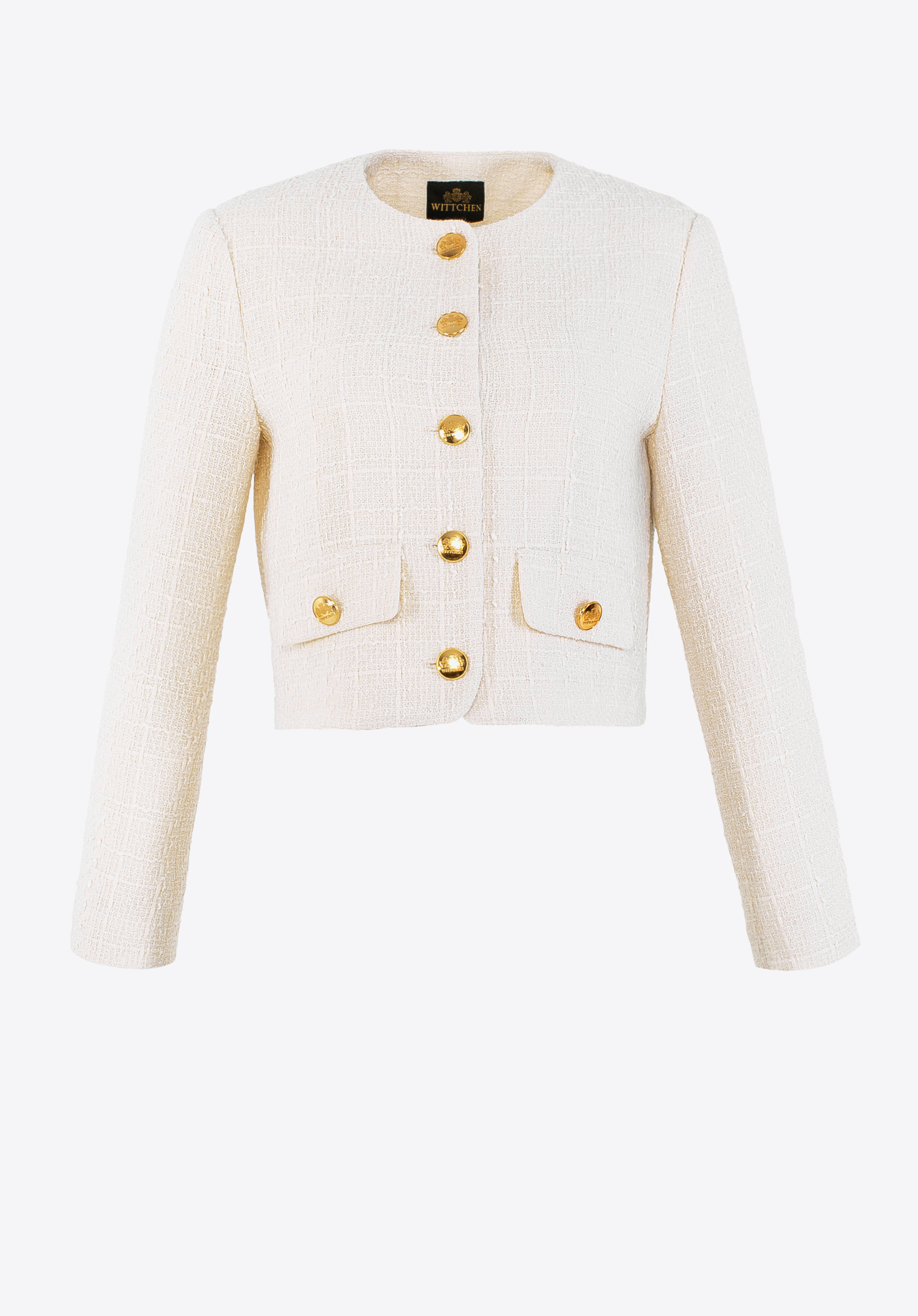 Acest sacou scurt din țesătură buclată este alegerea ideală pentru femeile care doresc să combine eleganța cu confortul de zi cu zi. Realizat din poliester, oferă lejeritate și comoditate, iar croiala sa clasică se mulează frumos pe siluetă, conferindu-i un aer subtil și atemporal. Țesătura bouclé, alături de nasturii tip bijuterie cu blazonul WITTCHEN, adaugă o notă de rafinament, potrivită atât pentru ținute formale, cât și pentru cele mai relaxate.