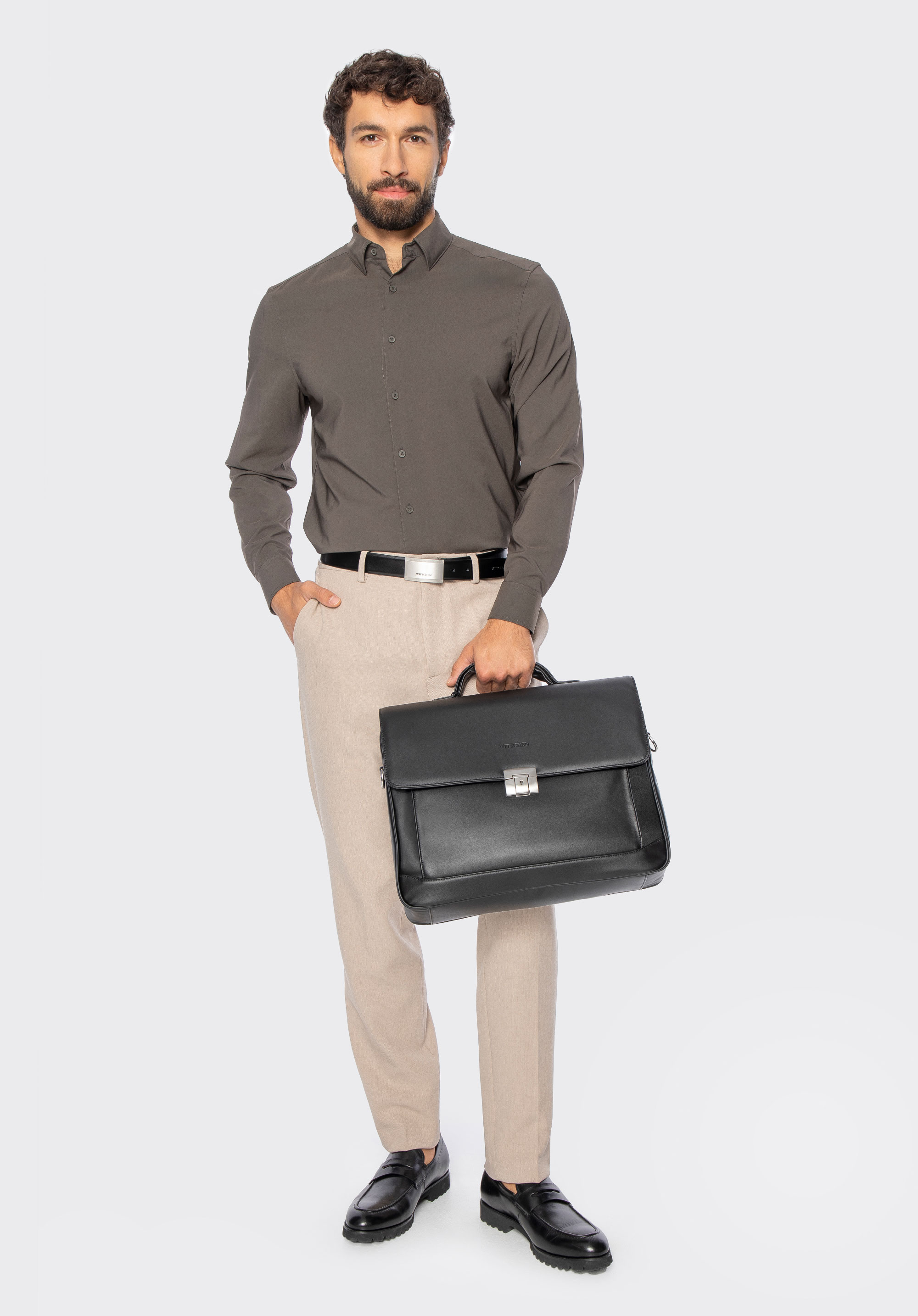 Sugestia noastră: modelul clasic al servietei va fi o completare excelentă a unei stilizări formale de afaceri.
