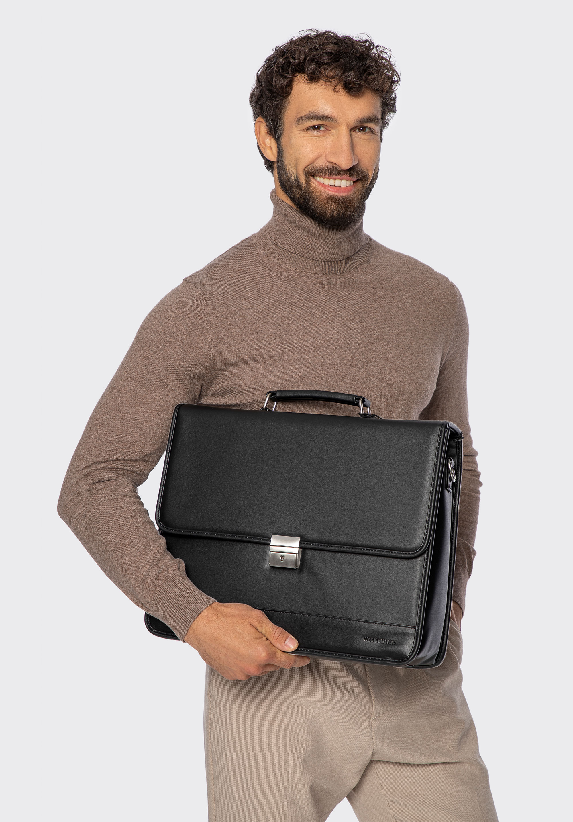 Forma simplă a acesteiserviete pătrate va satisface iubitorii stilului clasic. Aceasta este ogeantă bărbătească perfectă pentru serviciu, în delegație sau la o întâlnire de afaceri. Are suficient de mult loc pentru multe documente, chiar șiîn format A4. În interior, veți găsiun buzunar practic închis cu fermoar, care vă va ajuta să organizați interiorul mai bine. În plus,închiderea cu cheie garantează că interiorul va fi bine asigurat.Geanta a fost cusută dinpiele ecologică moale de înaltă calitate, cufinisaj mat. În partea din față se aflăun panou decorativ suplimentar din piele ecologică. Aceastăservietă cu închidere cu cheie se va potrivi atât la un costum, cât și la o ținută smart casual. Purtați-o cu un sacou în stil sport sau cu un costum clasic din bumbac.