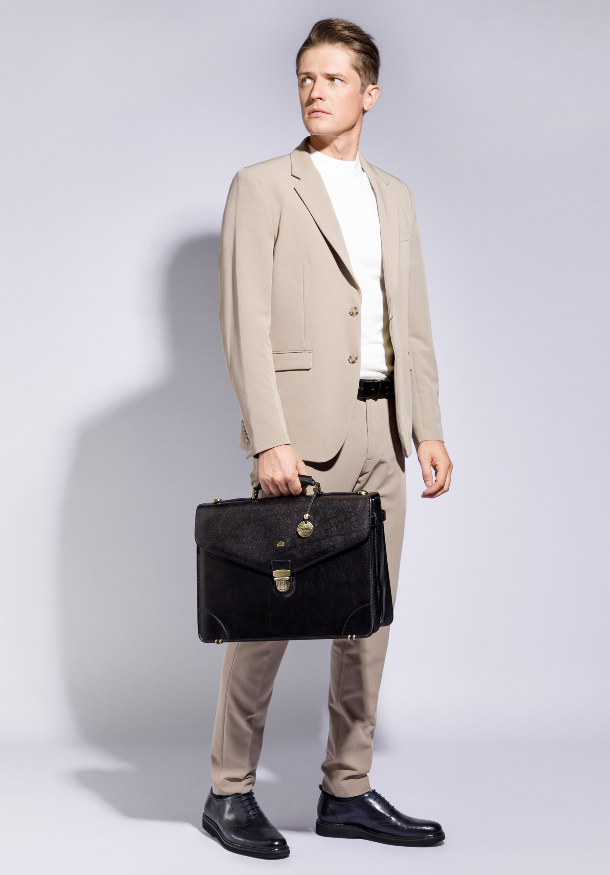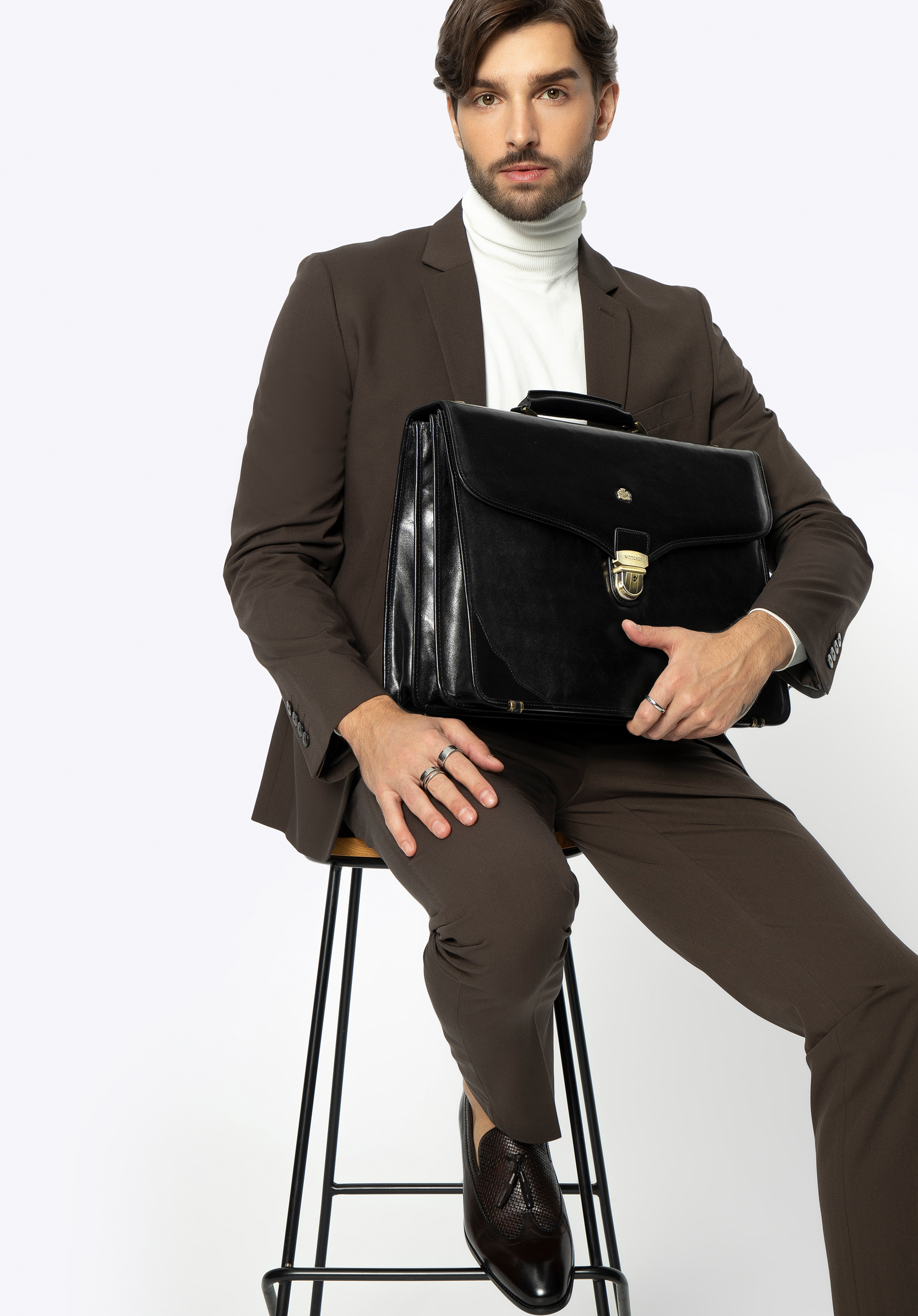 Clasic, servietă de piele cu fitinguri de culoare aurie este un accesoriu functional si extrem de elegant. Pliant a fost realizat manual din piele de vițel durabilă, subtil strălucitoare.