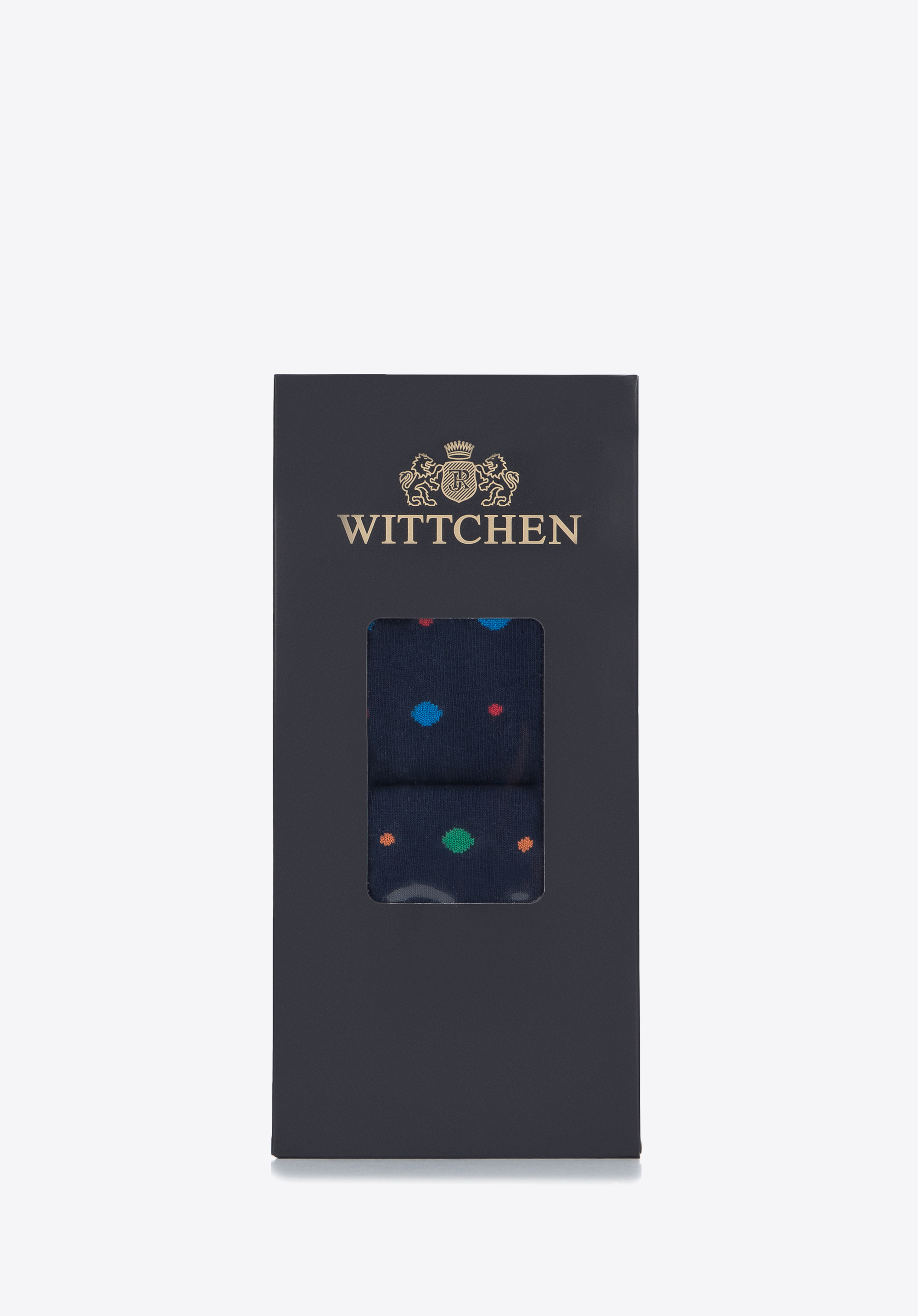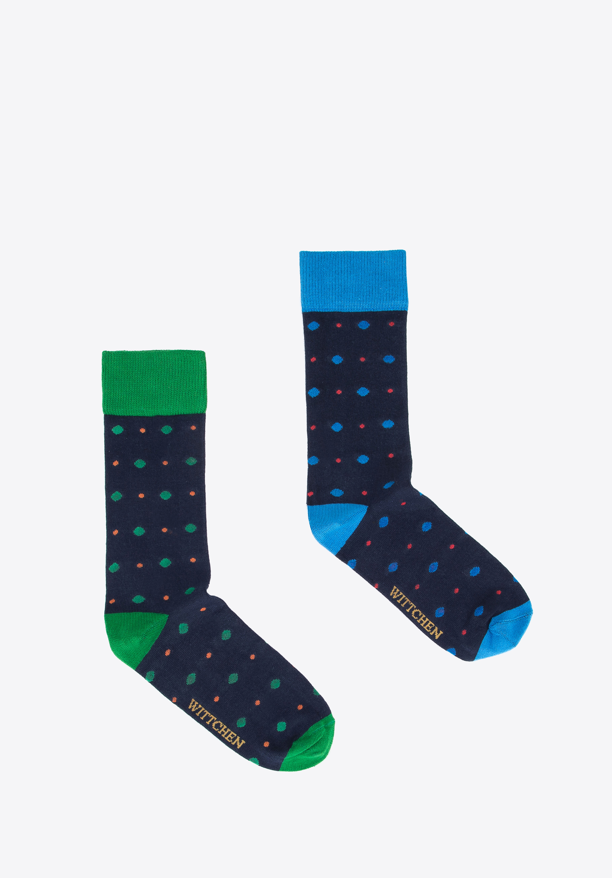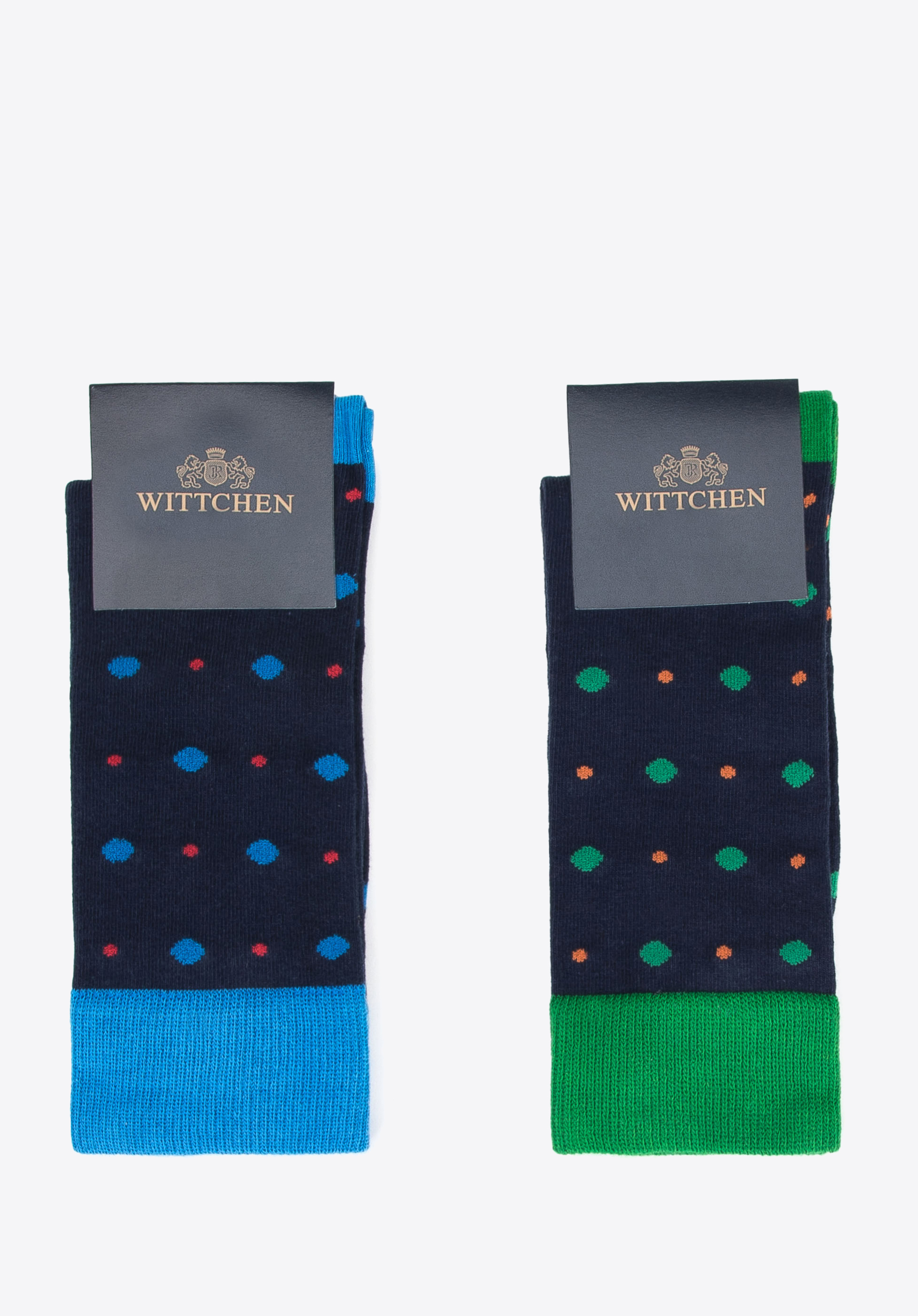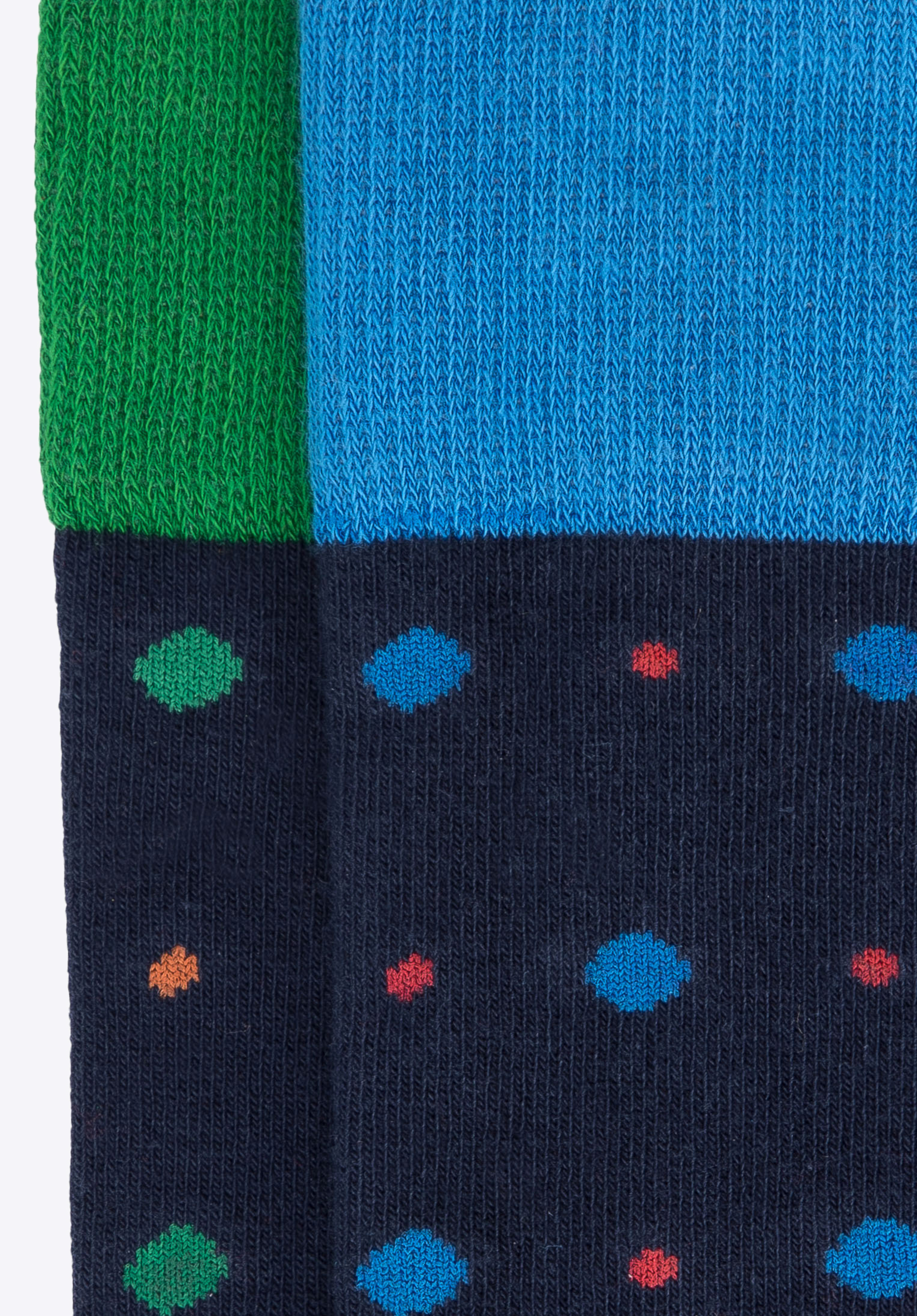 Acest set de șosete pentru bărbați va adăuga varietate la oricare dintre ținutele tale. Pachetul conține două perechi de aceeași culoare, cu un model cu puncte în două variante de culoare. Sunt confecționate din bumbac de înaltă calitate, cu fibre adăugate pentru a îmbunătăți elasticitatea. Fundalul albastru marin contrastează cu culoarea verde sau albastră de pe călcâi, vârf și talpă. Îi puteți purta atât pentru ocazii formale, cât și pentru ocazii casual - sunt atemporali și confortabili. Un set de șosete bărbătești cu buline va fi util pentru orice bărbat modern.