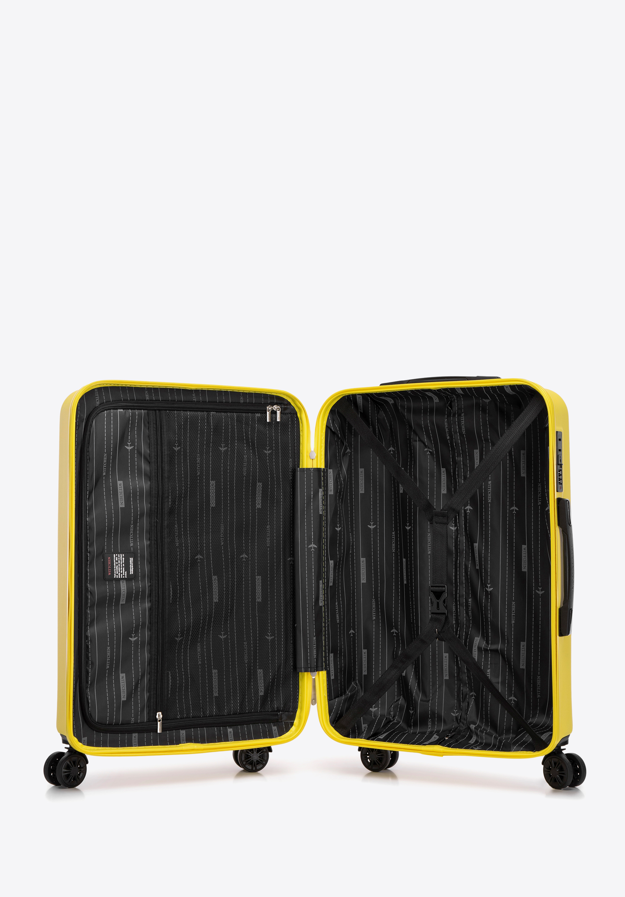 - Interiorul valizei: Fiecare valiză are bretele reglabile, un buzunar și un compartiment cu fermoar.